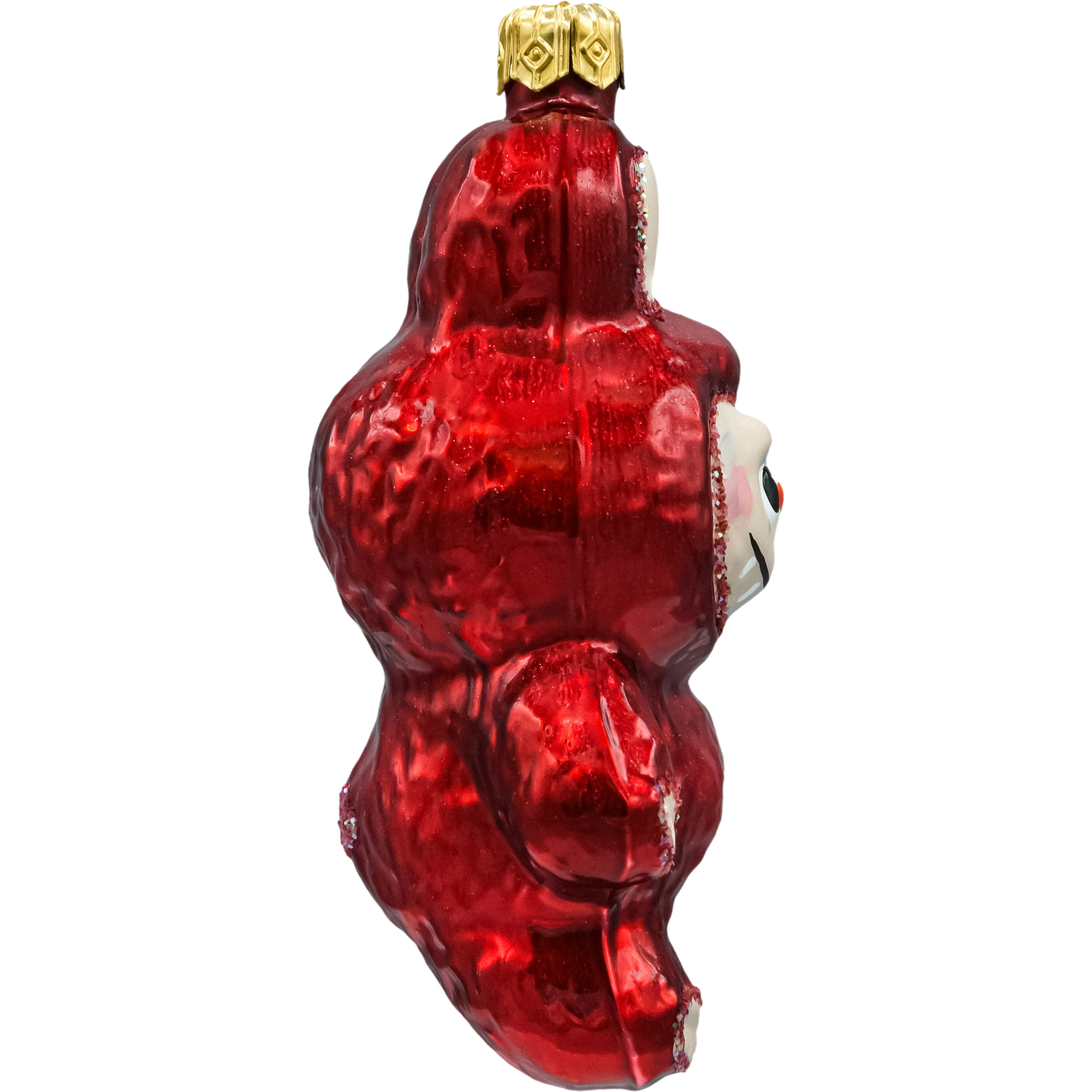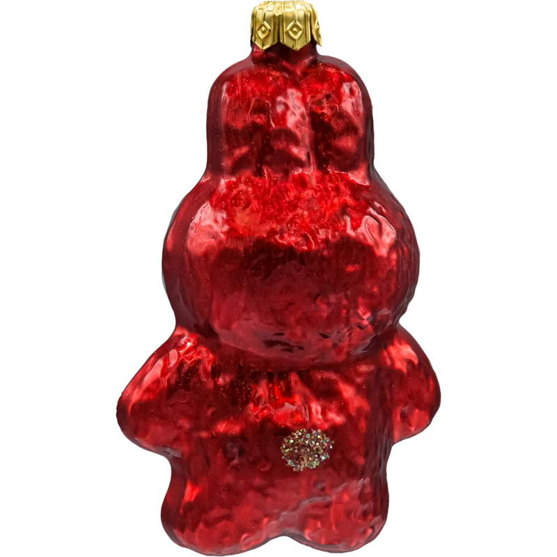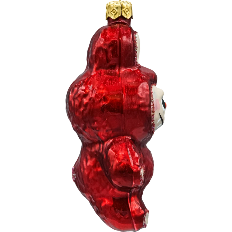 Przyciągająca wzrok, ręcznie malowana bombka choinkowa w kształcie uśmiechniętej postaci inspirowanej Labubu. Intensywnie czerwony, perłowy strój z połyskiem podkreślono drobnym brokatem w odcieniach złota i różu, a twarz z charakterystycznym noskiem i zaznaczonym uśmiechem nadaje ozdobie ciepły, bajkowy charakter. Figurka została wykonana ze szkła i wykończona metalową, złotą koronką z oczkiem do zawieszenia. To świetny akcent do nowoczesnych i klasycznych aranżacji – od choinki w salonie, przez świąteczną gałązkę, po półkę z kolekcją figurek. Oryginalna „bombka figurka” zachwyci fanów stylu Kawaii i wszystkich, którzy szukają niebanalnych, kolekcjonerskich ozdób świątecznych.