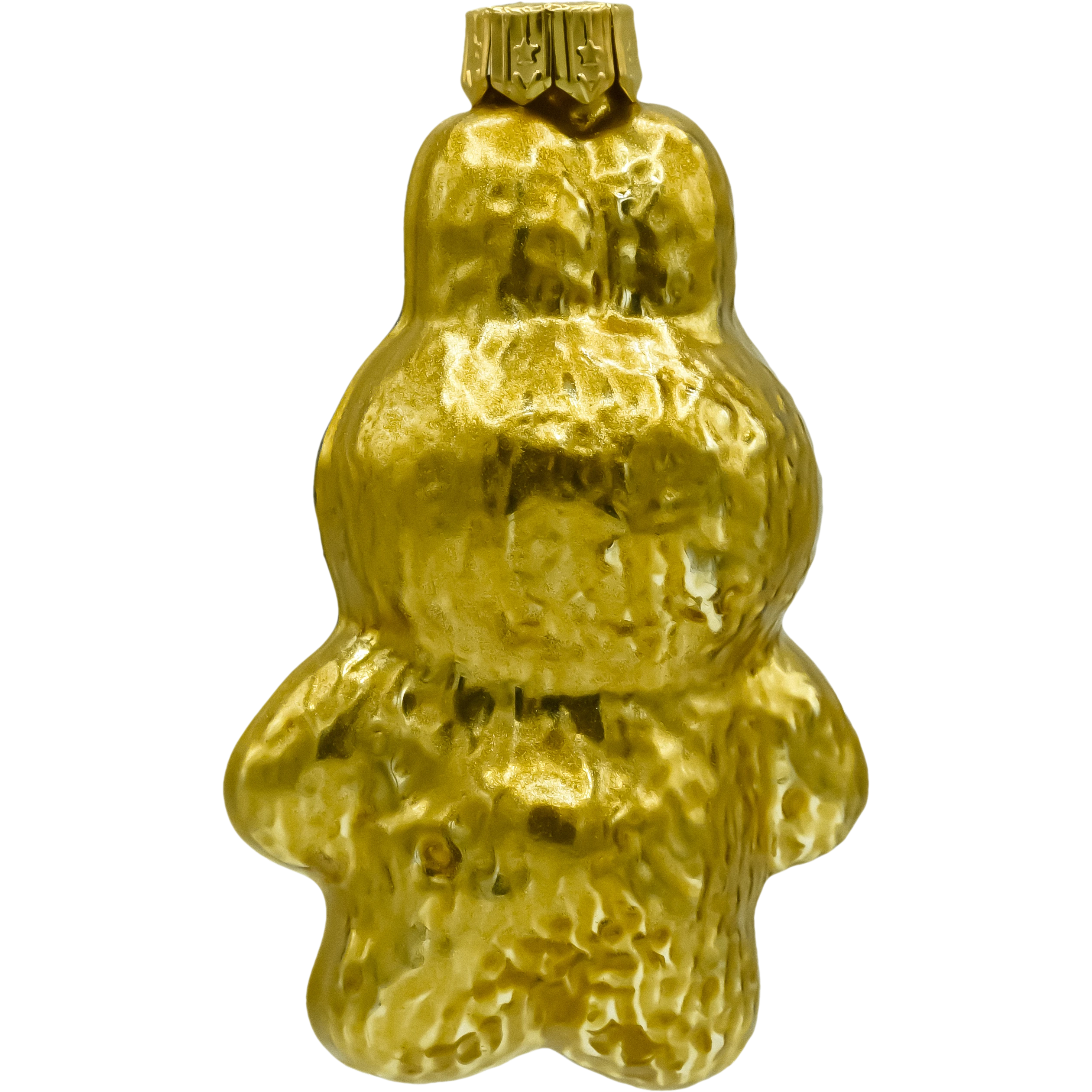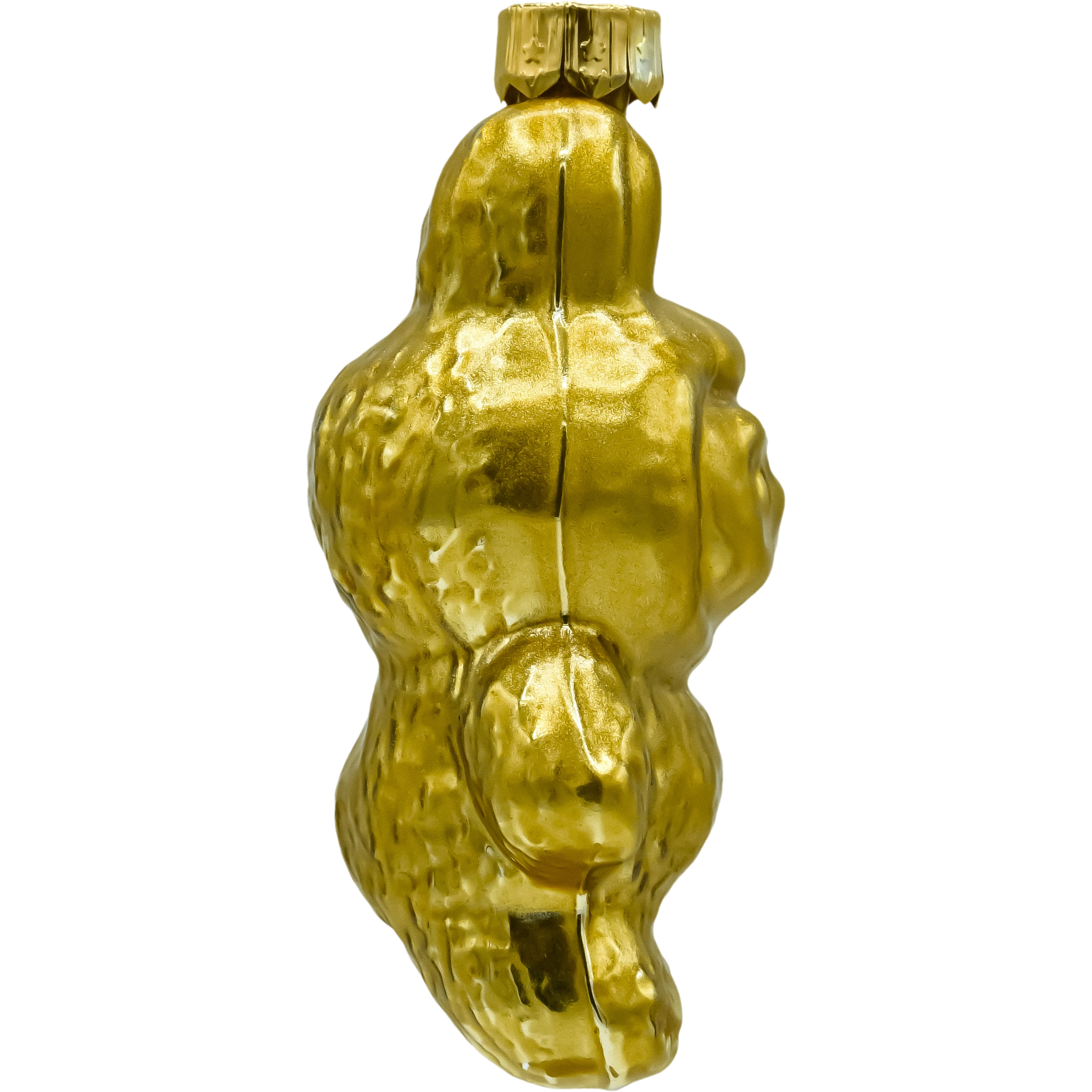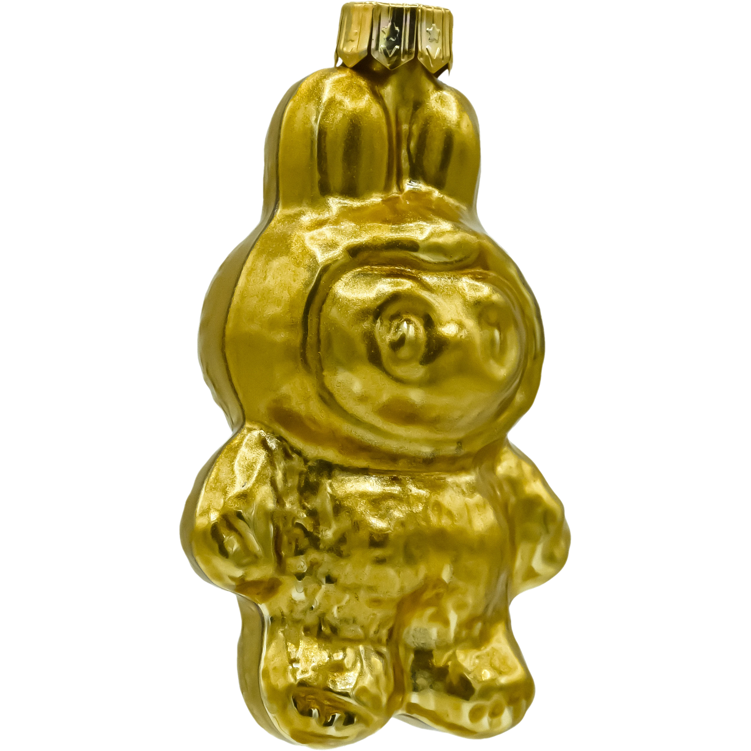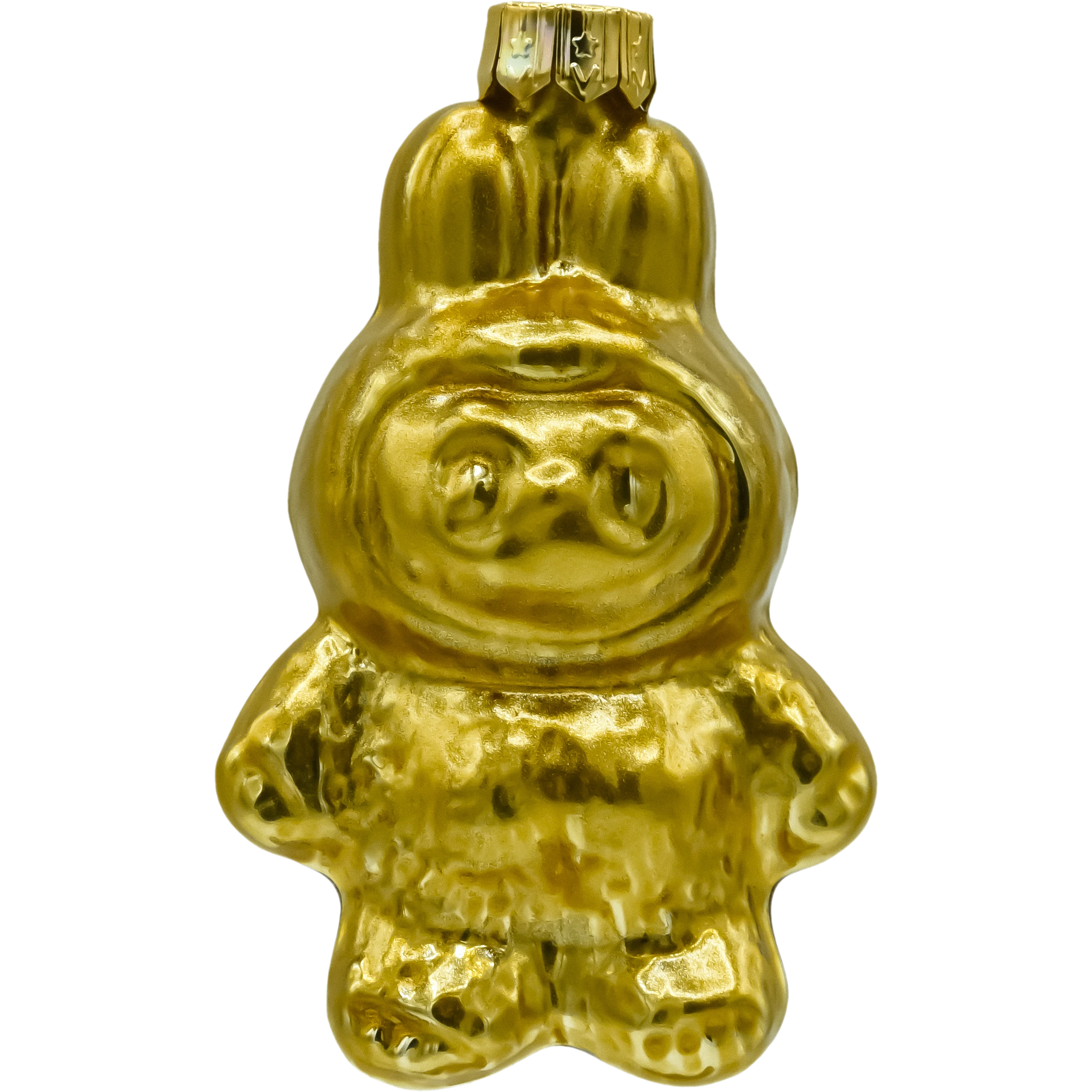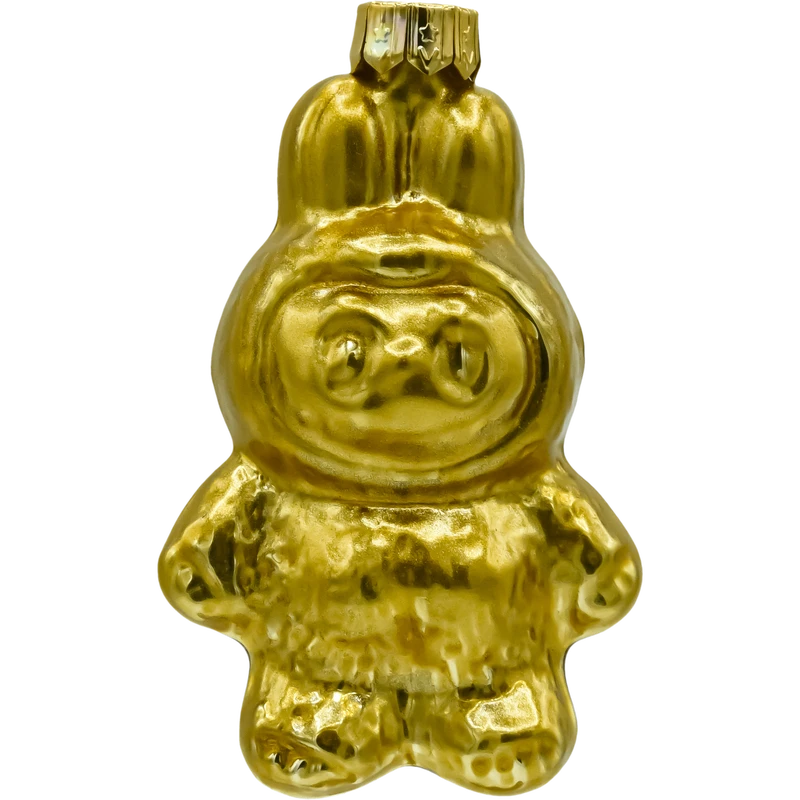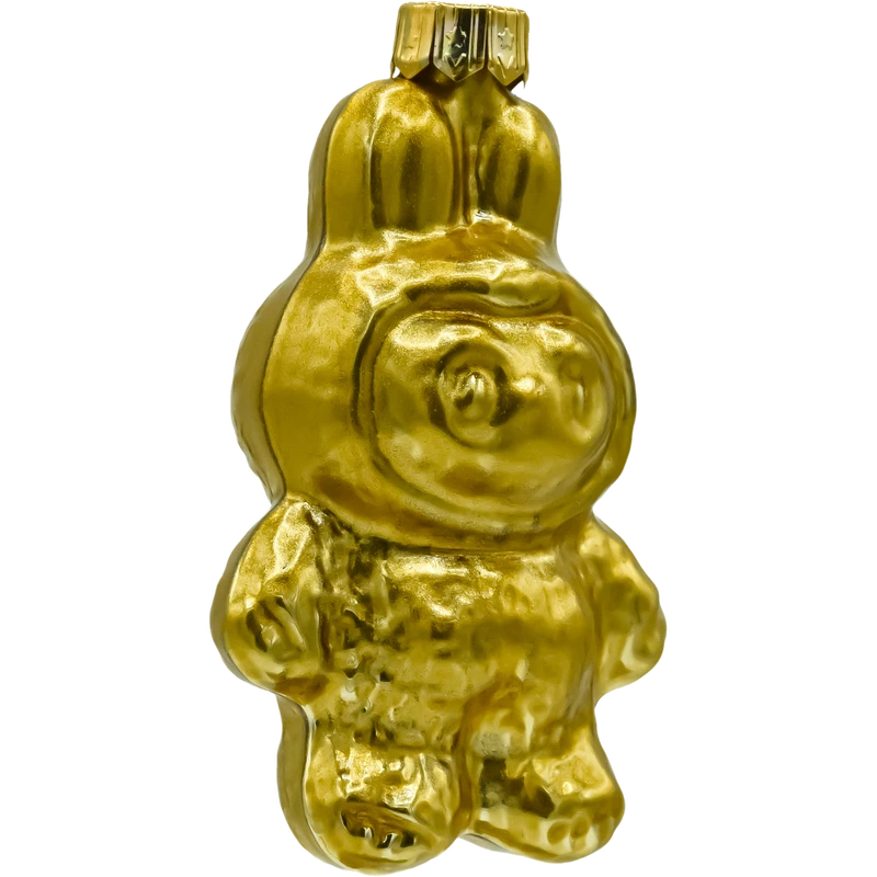 Figuralna bombka szklana inspirowana postacią Labubu – w całości wykończona metalizowanym złotem. To lekka, dmuchana ozdoba o nowoczesnym charakterze: z króliczymi uszkami, zaokrągloną sylwetką i miękkim modelowaniem detali. Lustrzana, złota powierzchnia pięknie odbija światło lampek, dzięki czemu bombka błyszczy na choince i dodaje aranżacji elegancji w stylu glamour.