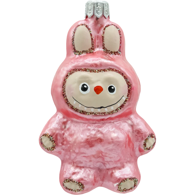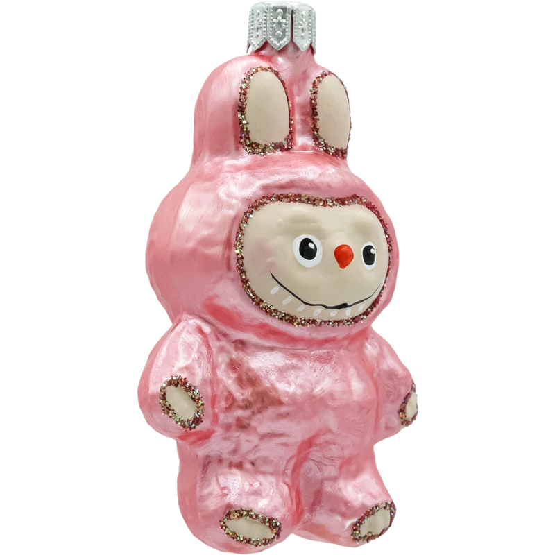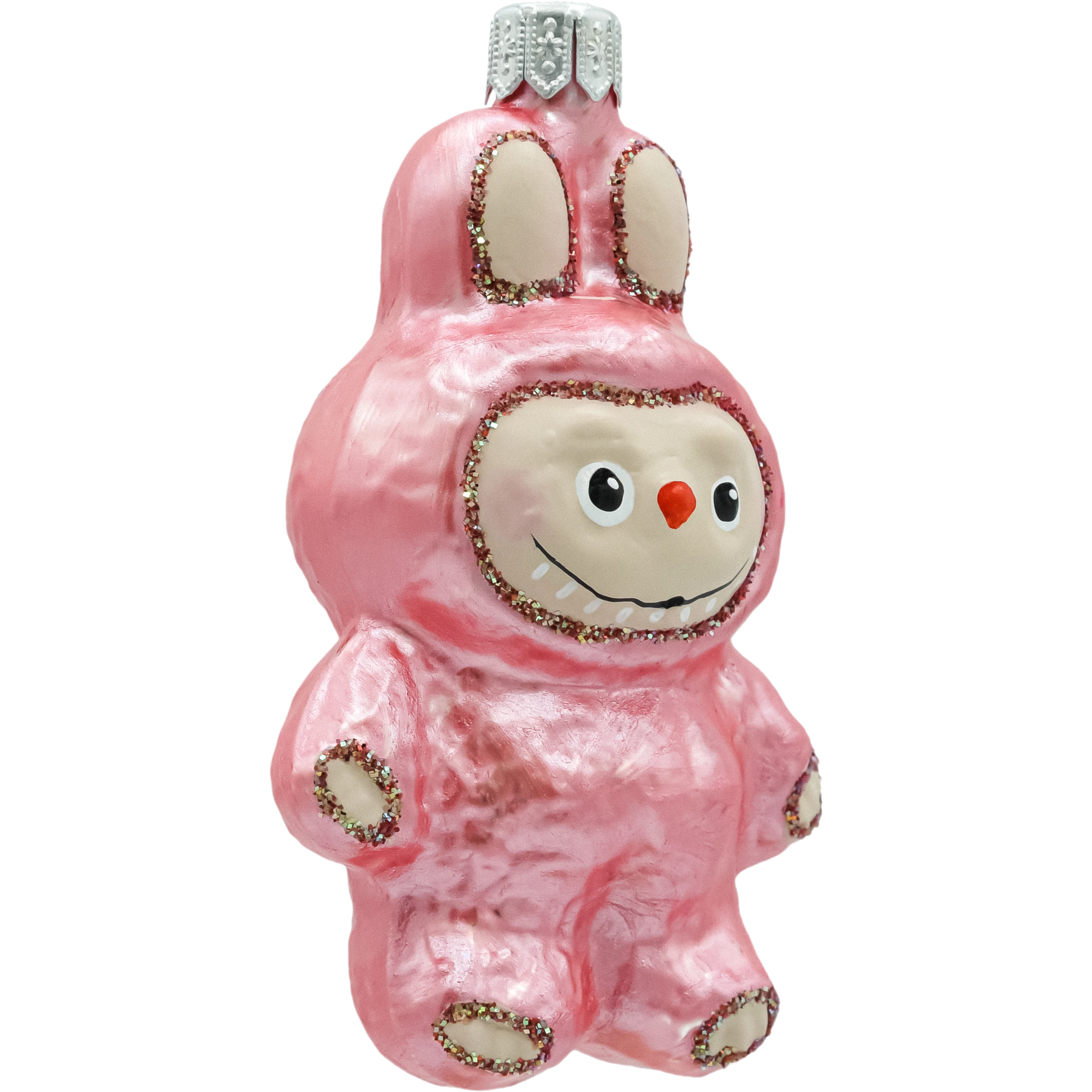 Ręcznie dmuchana bombka szklana „labubu” w różowym, perłowym kombinezonie z uszami. Malowana i brokatowana ręcznie, wysokość ok. 10 cm. Lekka, efektowna i kolekcjonerska – idealna na choinkę, do stroików i na prezent. Świąteczna ozdoba choinkowa premium, polskie rzemiosło