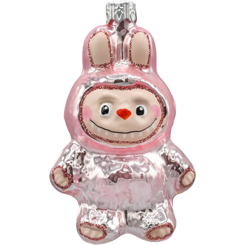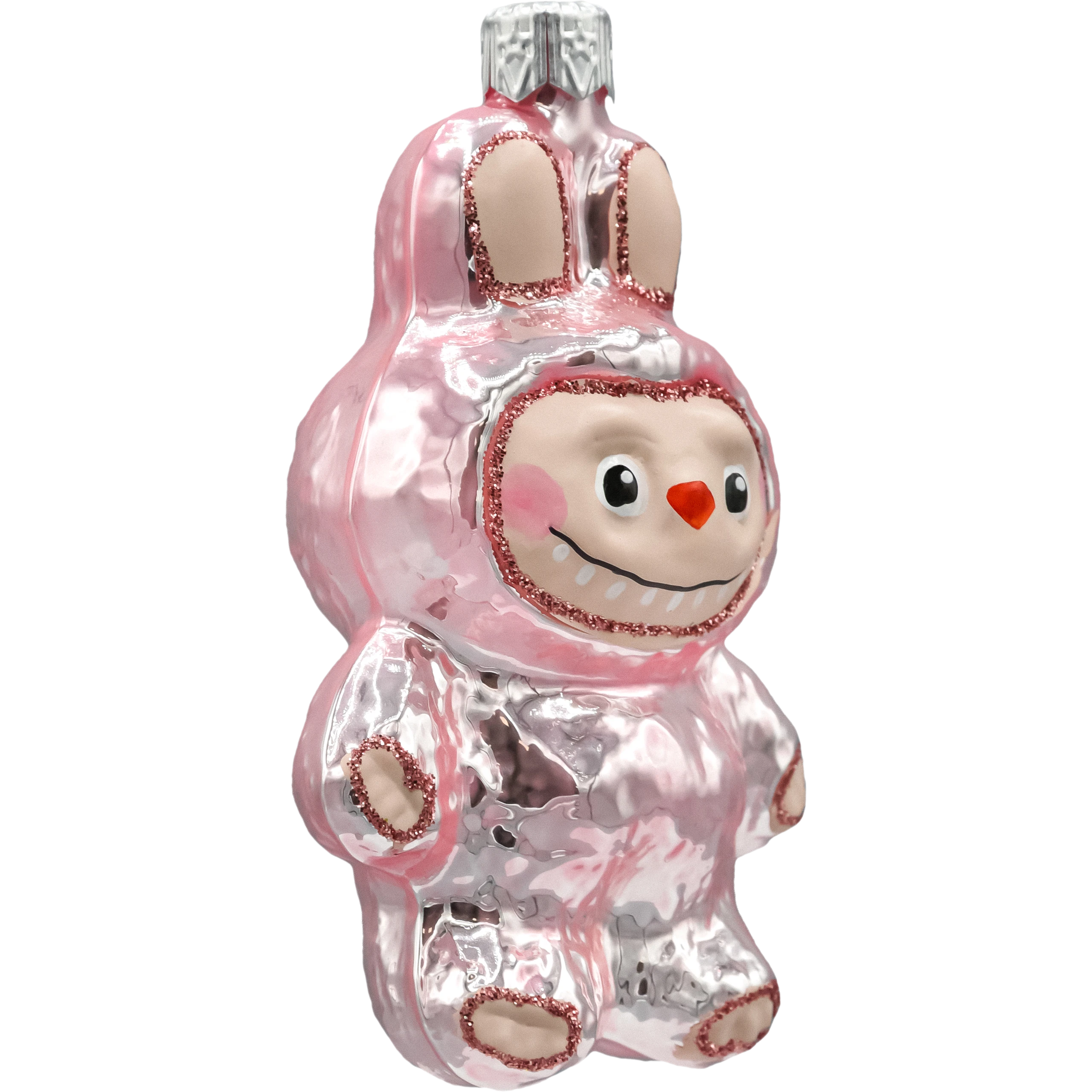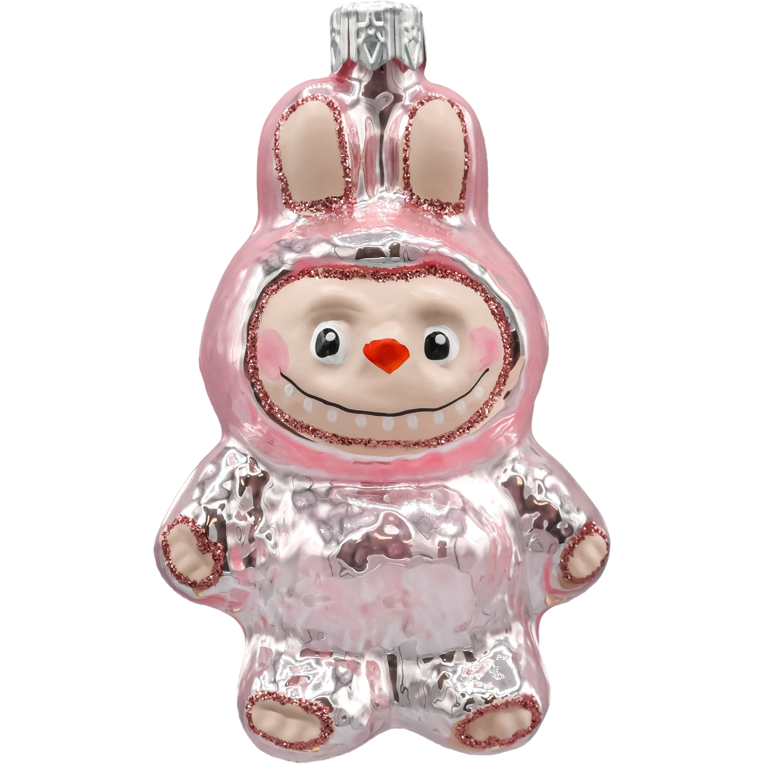 Urocza bombka choinkowa w stylu labubu – szklana figurka króliczka-stworka w pastelowym różu z lustrzanym, chromowym połyskiem. Kształt został dmuchany ze szkła, a następnie ręcznie malowany: rumiane policzki, uśmiechnięta buzia z ząbkami i marchewkowy nosek nadają jej bajkowego charakteru. Kontury pyszczka, uszu i „łapek” obsypano brokatem w odcieniu różowego złota, który iskrzy w świetle lampek. Całość dopełnia srebrna czapeczka z oczkiem, dzięki której figurka od razu jest gotowa do zawieszenia. To idealna bombka figurka handmade dla fanów estetyki labubu/kawaii, do nowoczesnych i pastelowych aranżacji.
