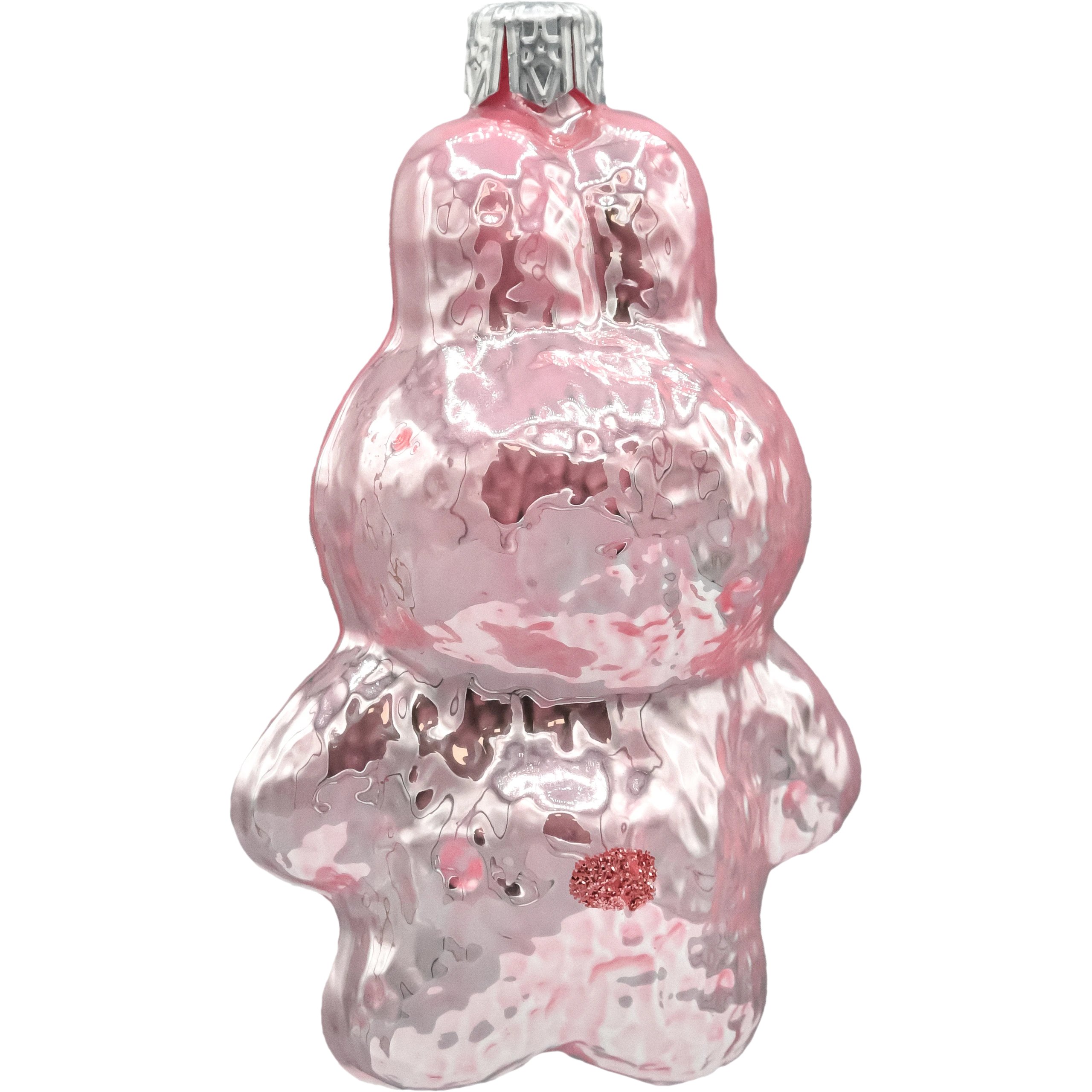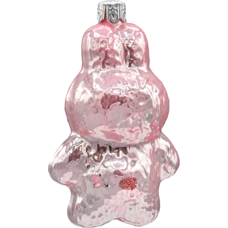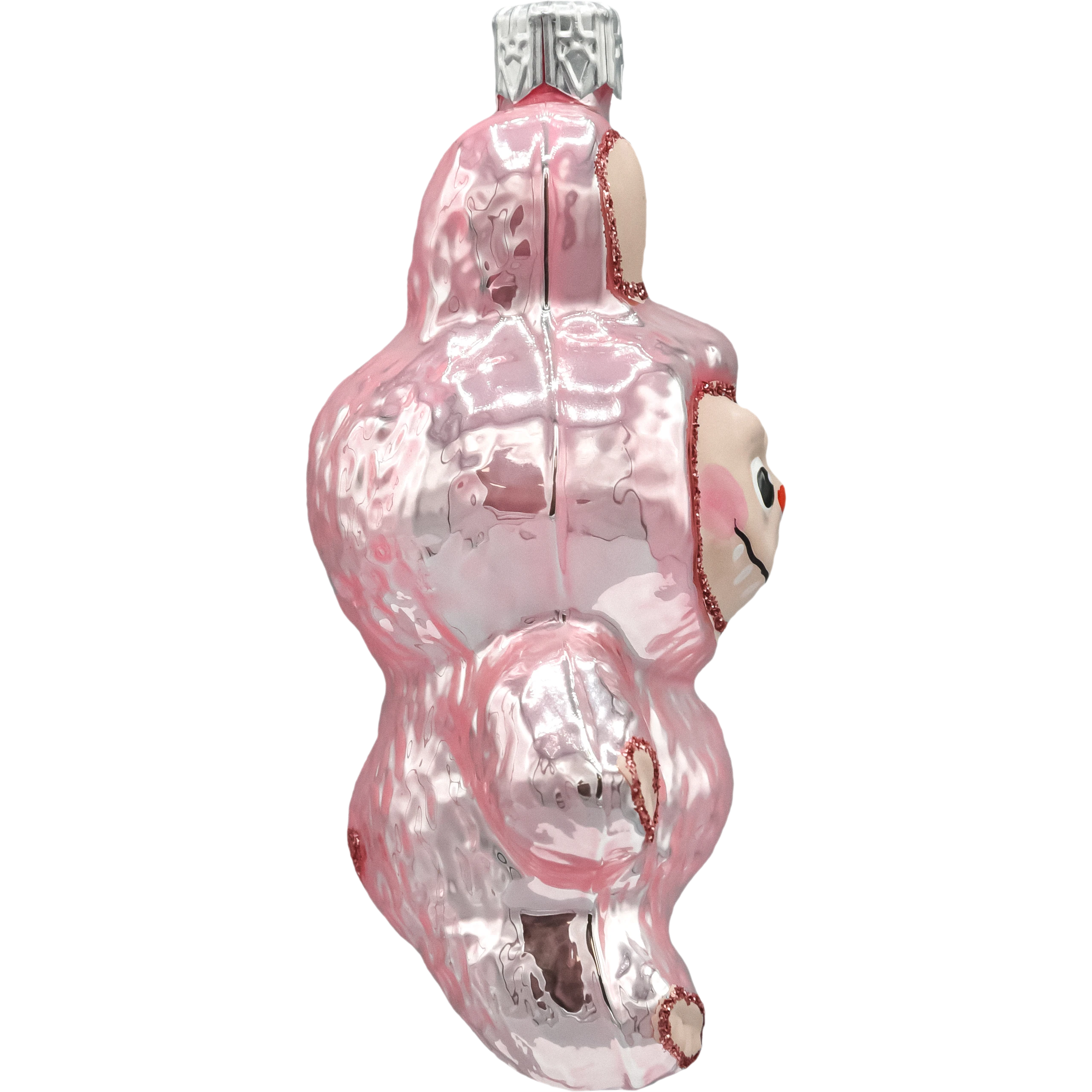 Szklana bombka – różowy stworek w stylu labubu. Ręcznie dmuchana i malowana, z chromowym połyskiem i brokatem rose-gold, wykończona srebrną czapeczką. Kolekcjonerska bombka figurka – urocza ozdoba choinkowa i świetny prezent świąteczny.