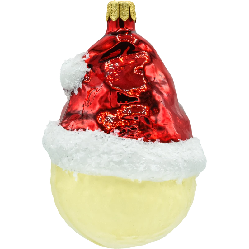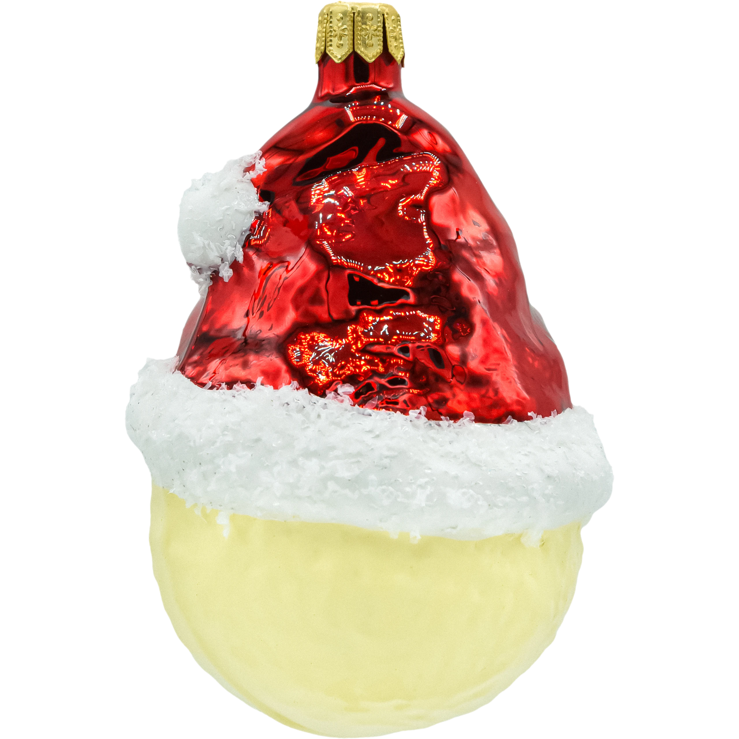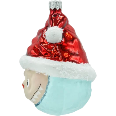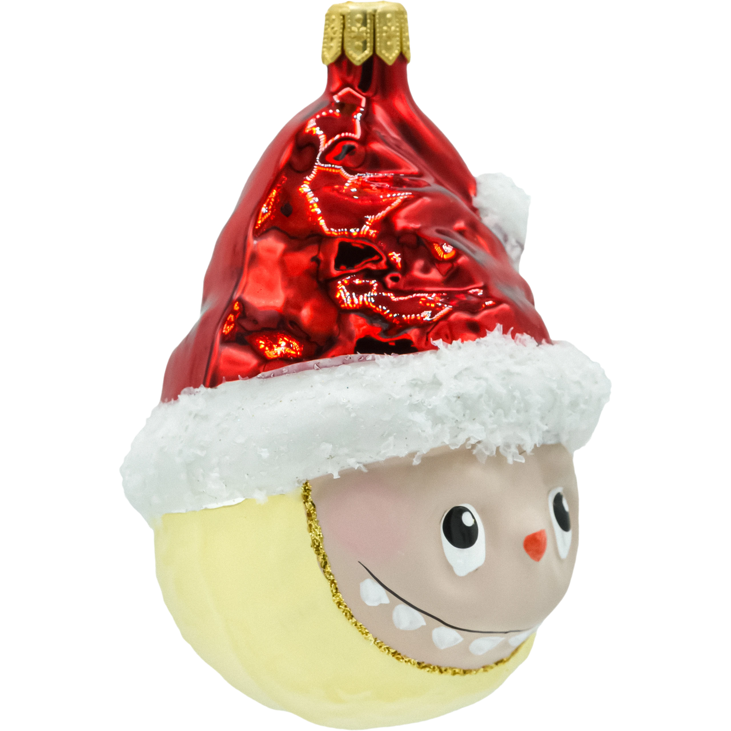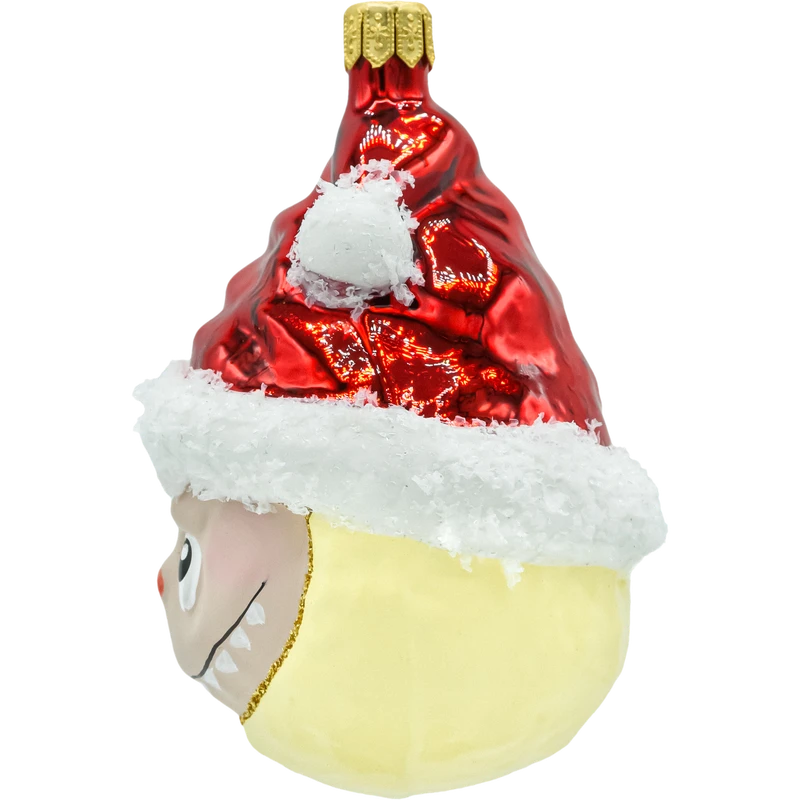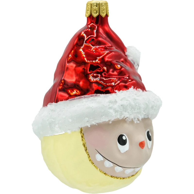 Ręcznie malowana bombka szklana inspirowana żółtą twarzą Labubu w czapce Mikołaja. Dmuchane szkło, złote brokatowe detale i połysk sprawiają, że to wyjątkowa ozdoba choinkowa i pomysł na prezent świąteczny dla miłośników oryginalnych, kolekcjonerskich dekoracji.