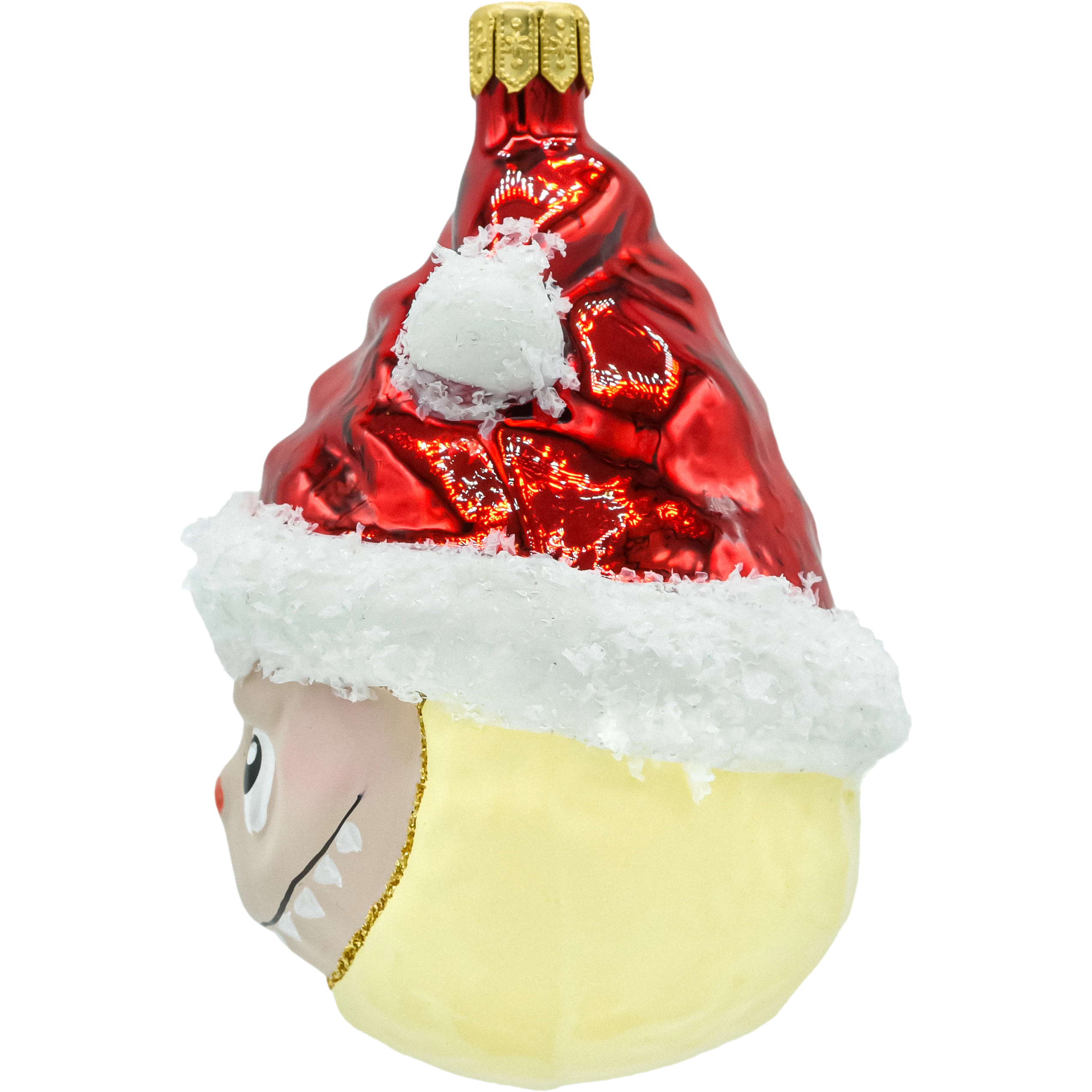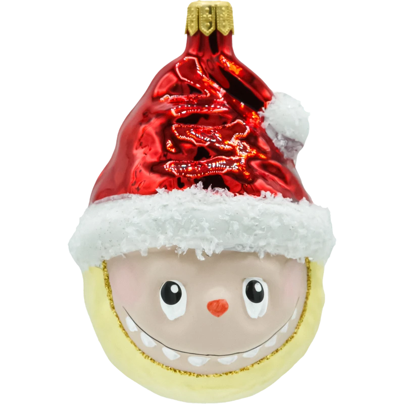 Motyw: urocza ,zółta twarz Labubu w czapce Mikołaja – nowoczesna interpretacja klasycznej ozdoby świątecznej.