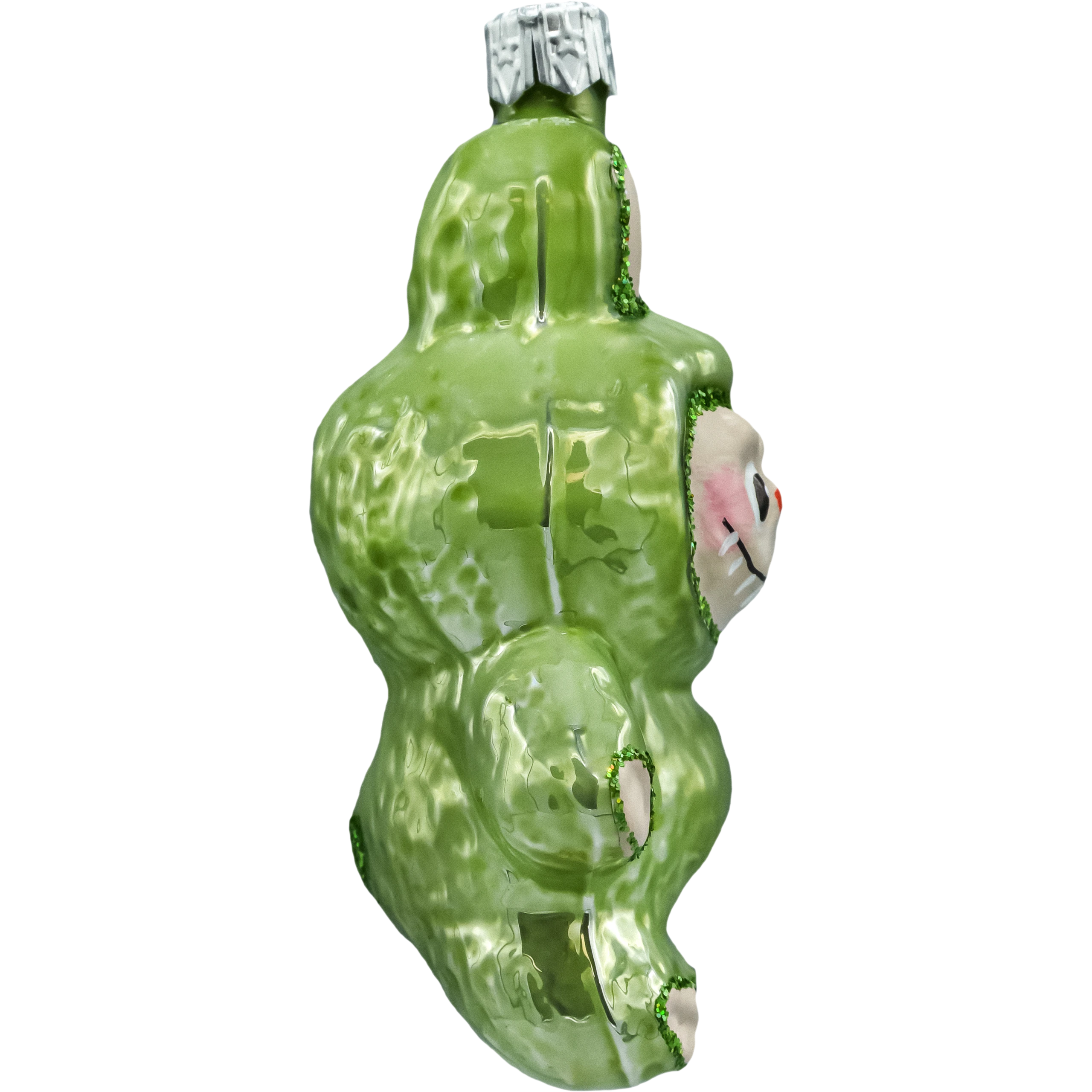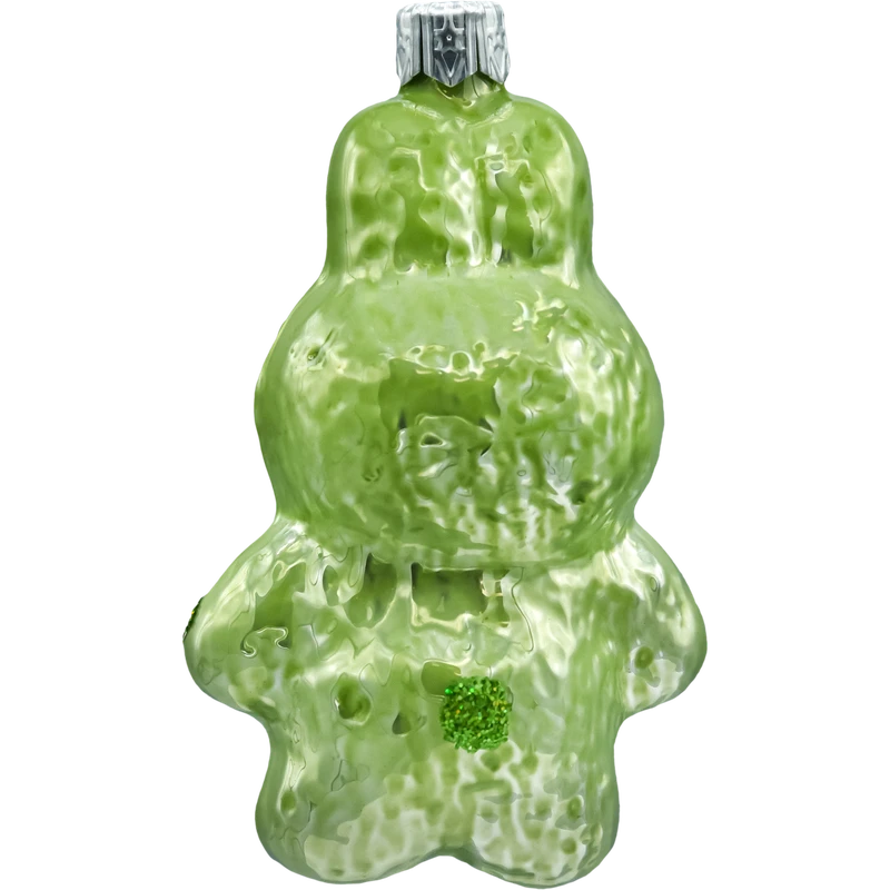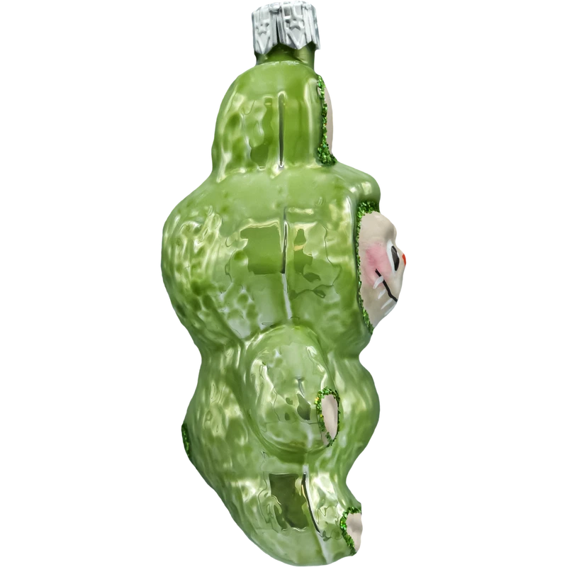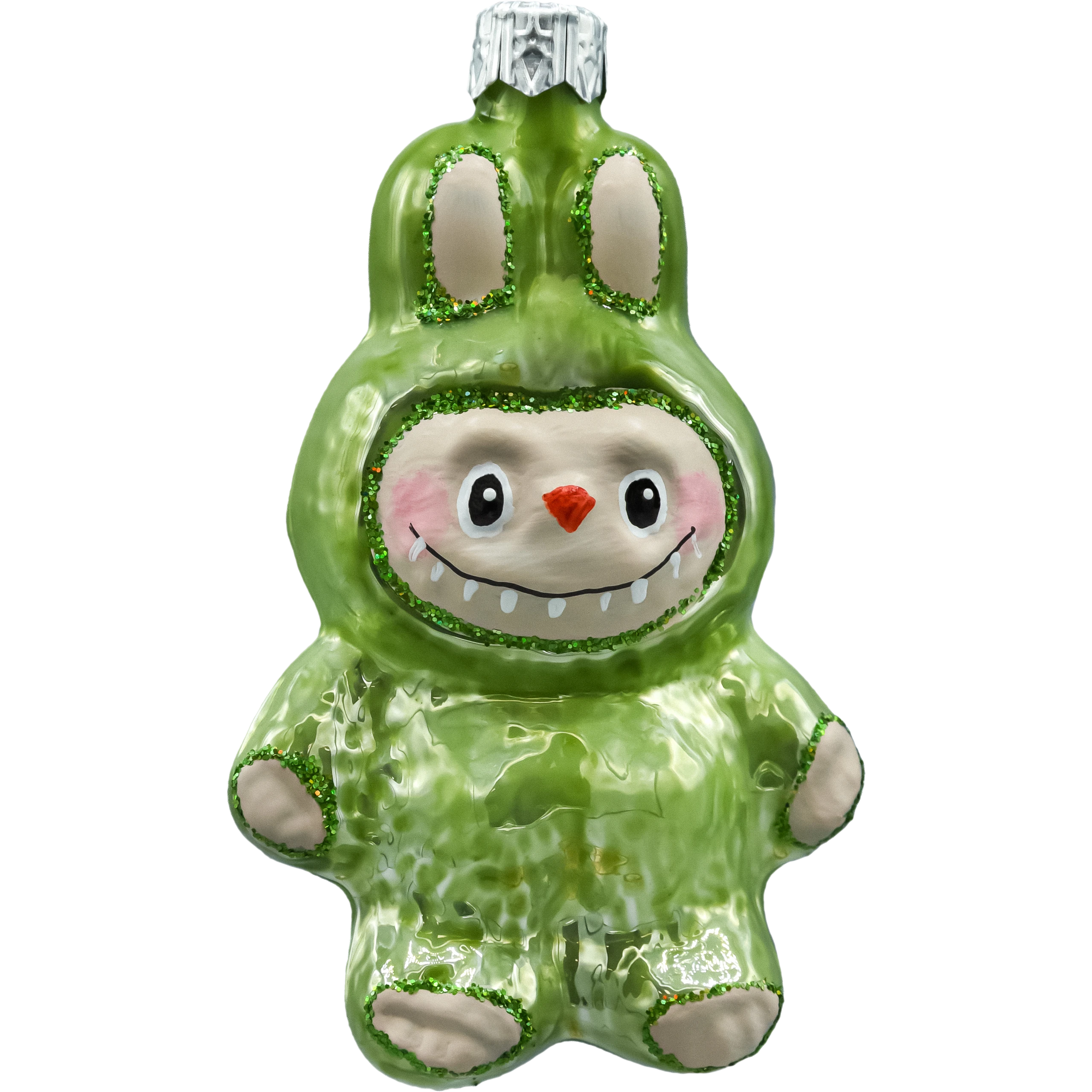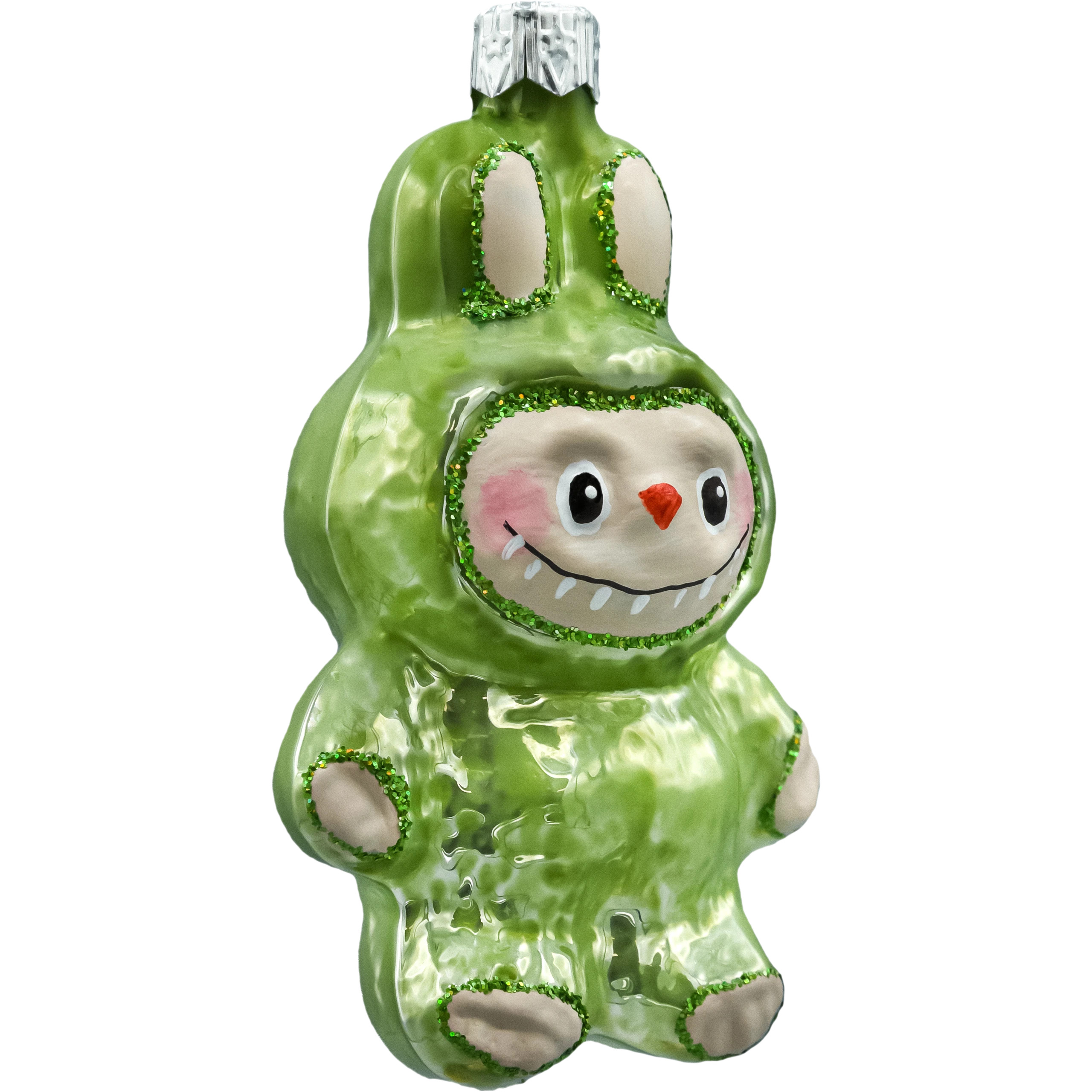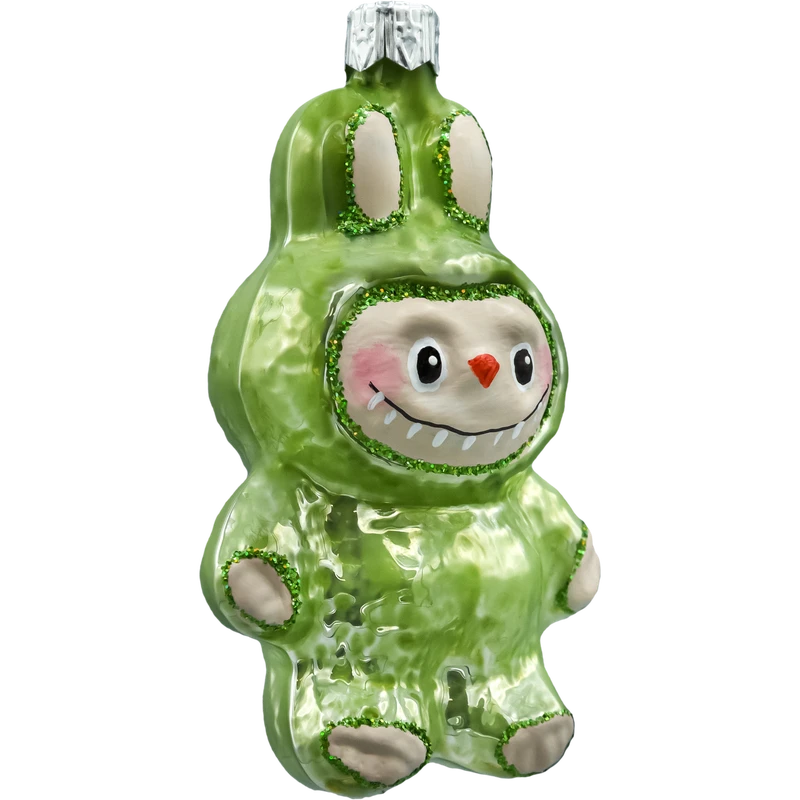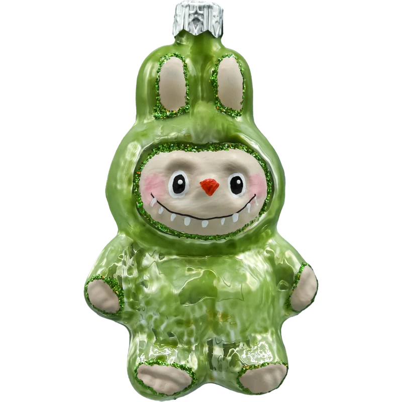 Zielona bombka figurka inspirowana postacią Labubu o wysokości 10 cm. Ręcznie malowana szklana bombka choinkowa z połyskującym zielonym kombinezonem i brokatowymi detalami. Idealna jako wyjątkowa ozdoba na choinkę, stojak lub prezent. Świąteczny must-have dla fanów kolekcjonerskich ozdób i nowoczesnego designu.