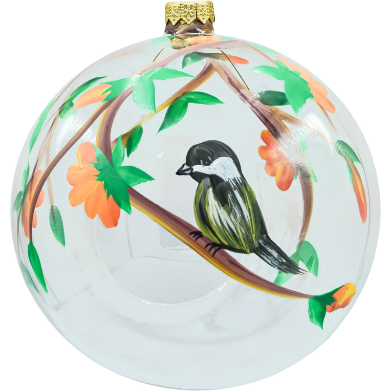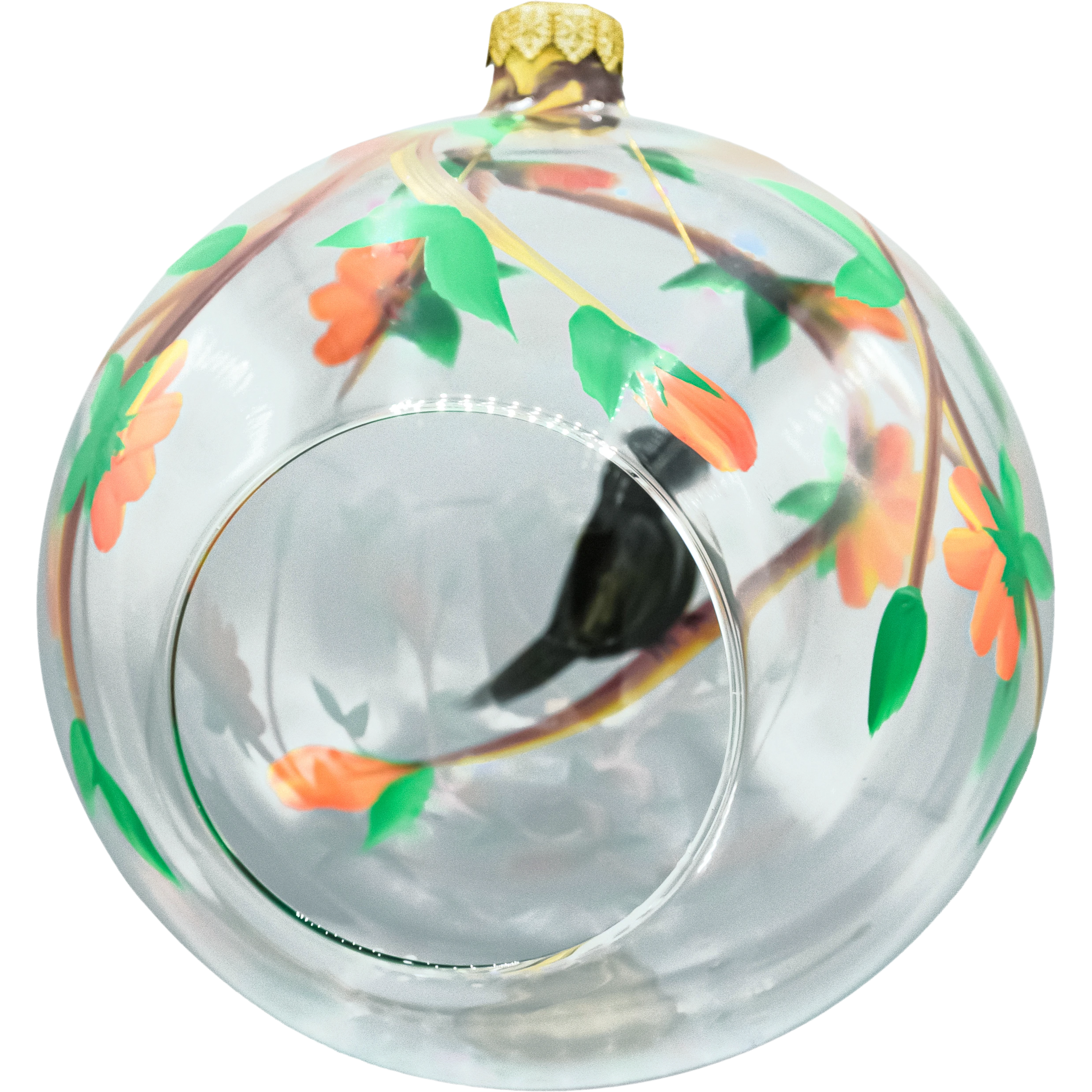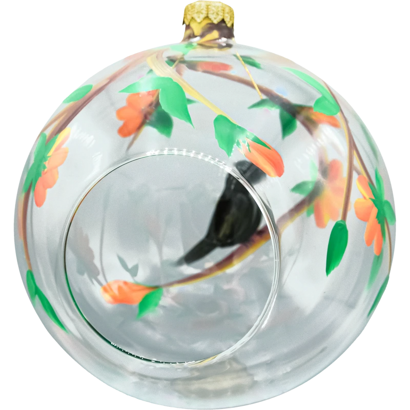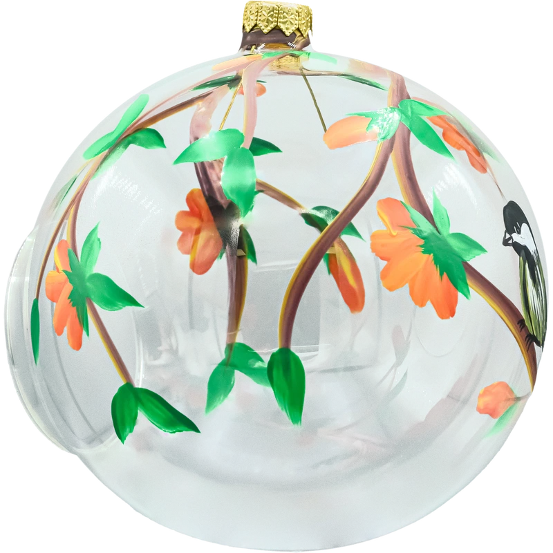 Przeźroczysta kula typu lampion z panoramicznym wycięciem (diorama). Ręcznie namalowane gałązki z zielonymi liśćmi i pomarańczowymi kwiatami oraz uroczy ptaszek siedzący na konarze tworzą lekką, wiosenno-letnią scenę. To dekoracja całoroczna – piękna na święta i poza sezonem.