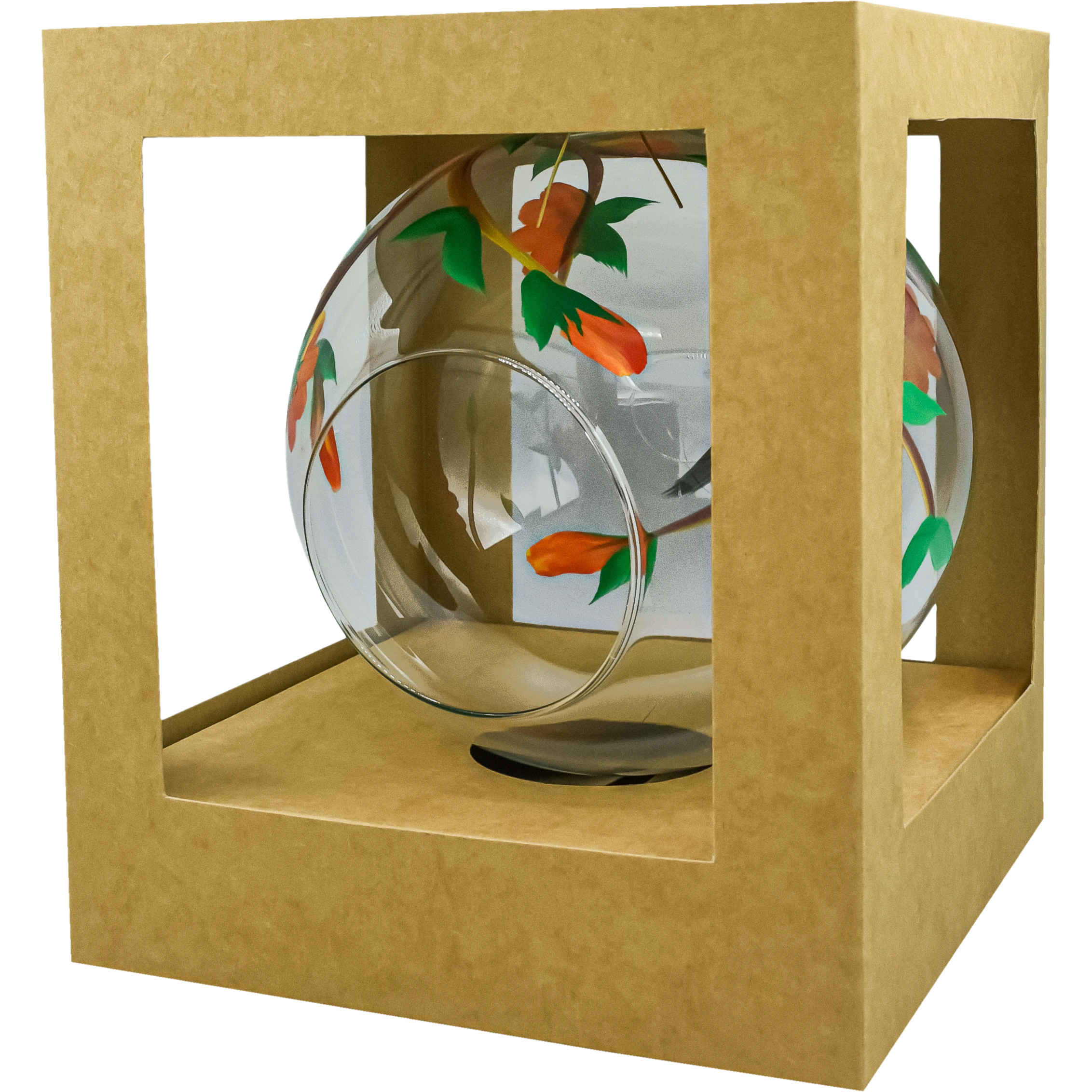 Ręcznie malowana bombka–lampion z przezroczystego szkła, ozdobiona gałązkami, kwiatami i ptaszkiem. Kształt kuli z dużym otworem tworzy efektowną „witrynę” – świetnie wygląda na choince, w oknie lub jako dekoracja na stojaku z małą świeczką LED w środku. Średnica ok. 15 cm sprawia, że to wyrazista dekoracja świąteczna i całoroczna. Idealna na prezent – unikatowa szklana bombka, która doda lekkości i natury każdemu wnętrzu.