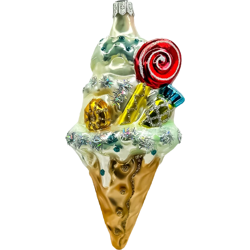 Bombka zachwyca detalami – lód o kremowym odcieniu topi się apetycznie na rożku, zdobionym złotymi akcentami, które nadają mu elegancji i blasku. Wśród dekoracji znajdują się również połyskujące śnieżynki oraz cukierki w intensywnych kolorach czerwieni, żółci i niebieskiego, które dodają całości świątecznego, radosnego charakteru. Jest to idealny wybór zarówno dla miłośników nietypowych ozdób, jak i dla dzieci, które uwielbiają słodkie, kolorowe dekoracje na choince.