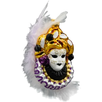 Wprowadź na swoją choinkę nutę tajemniczości i barokowego przepychu z wyjątkową, ręcznie zdobioną szklaną bombką w formie maski karnawałowej. Ta artystyczna ozdoba nawiązuje do stylu weneckich bali i teatralnych tradycji, urzekając detalami i finezyjnym wykończeniem.