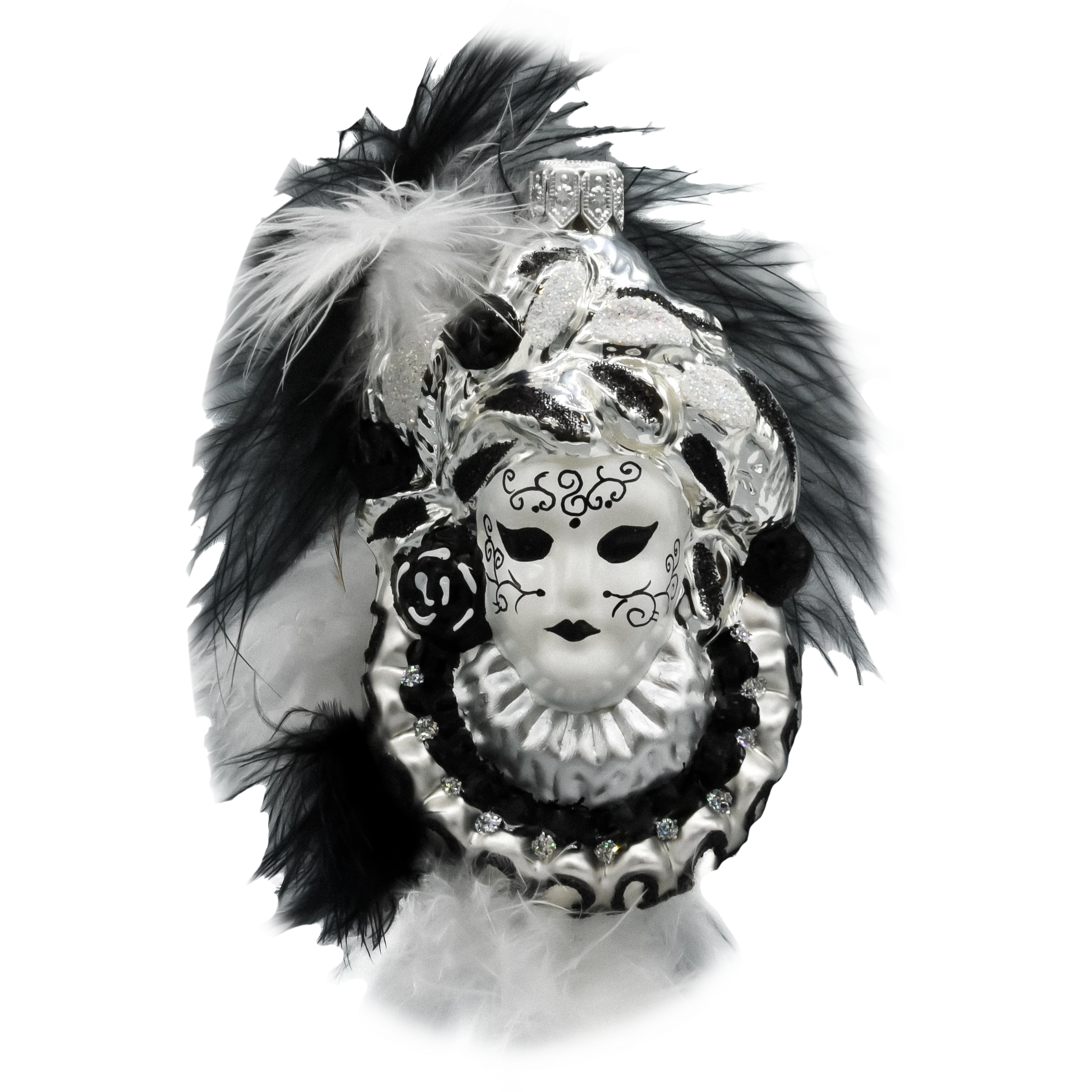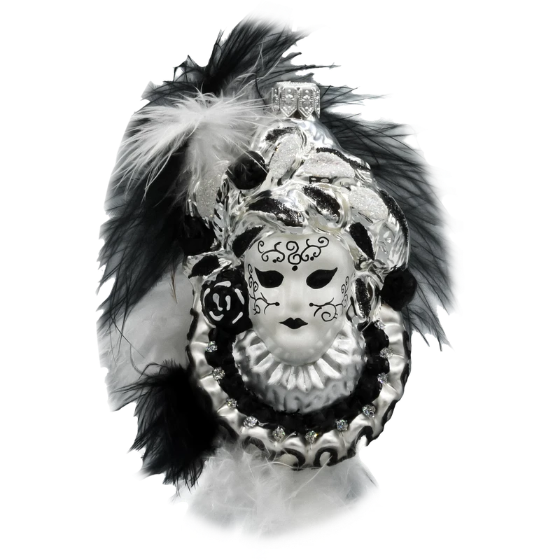 Szklana twarz w masce pokryta jest precyzyjnym, czarnym ornamentem z motywem wirujących zawijasów. Otaczają ją pióra w odcieniach bieli i głębokiej czerni, układające się w efektowną kompozycję przestrzenną. Dodatkowego blasku nadają bombce wkomponowane kamienie oraz metaliczne akcenty na kołnierzu i hełmowym nakryciu głowy. Całość tworzy spektakularną ozdobę, która przyciąga wzrok i nadaje aranżacji świątecznej charakter teatralnego glamour.