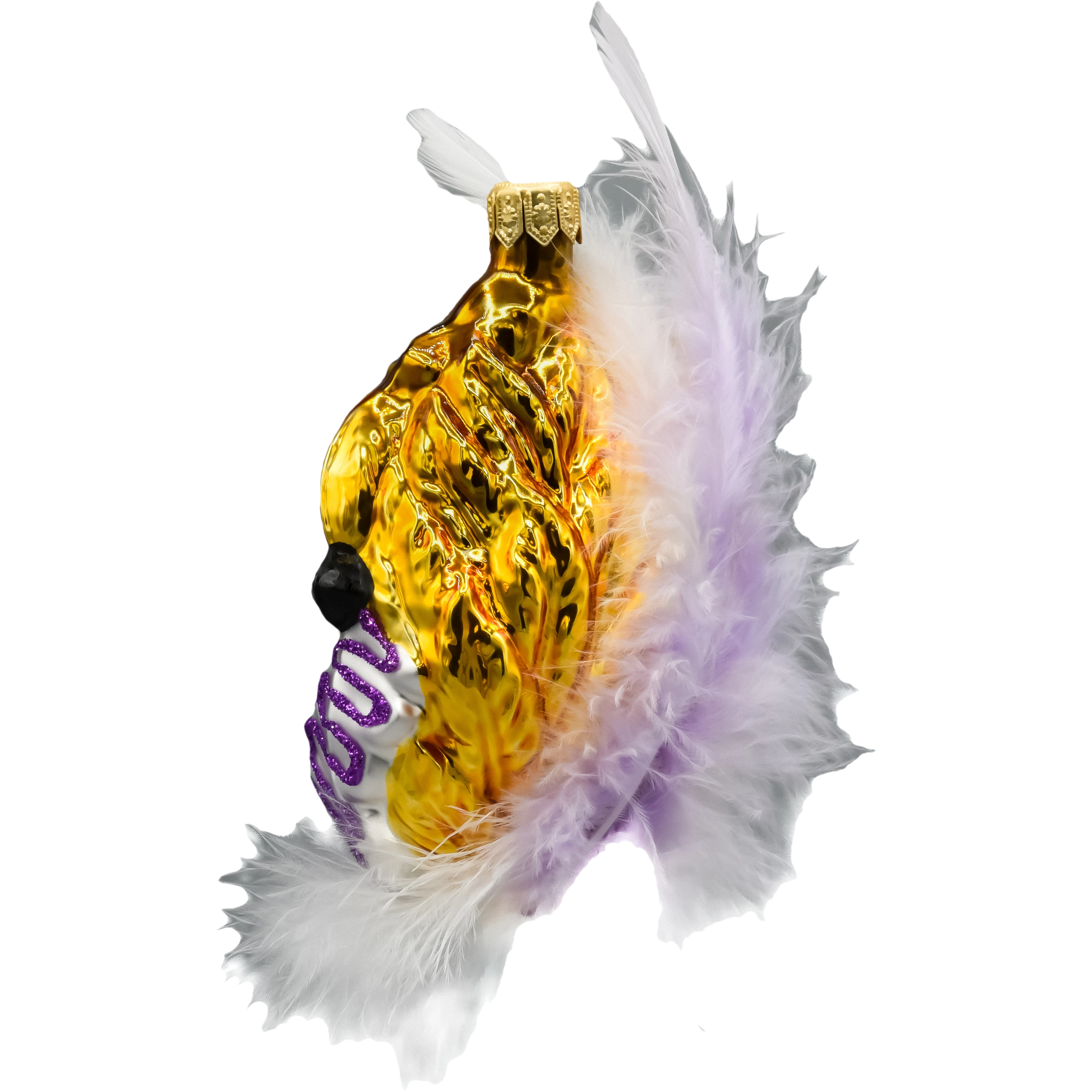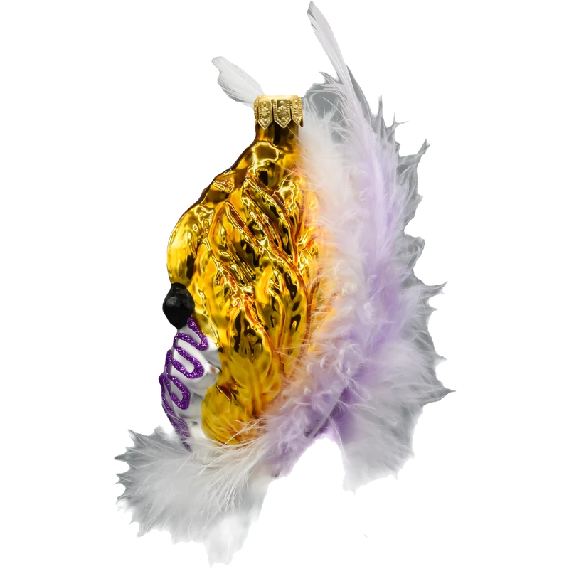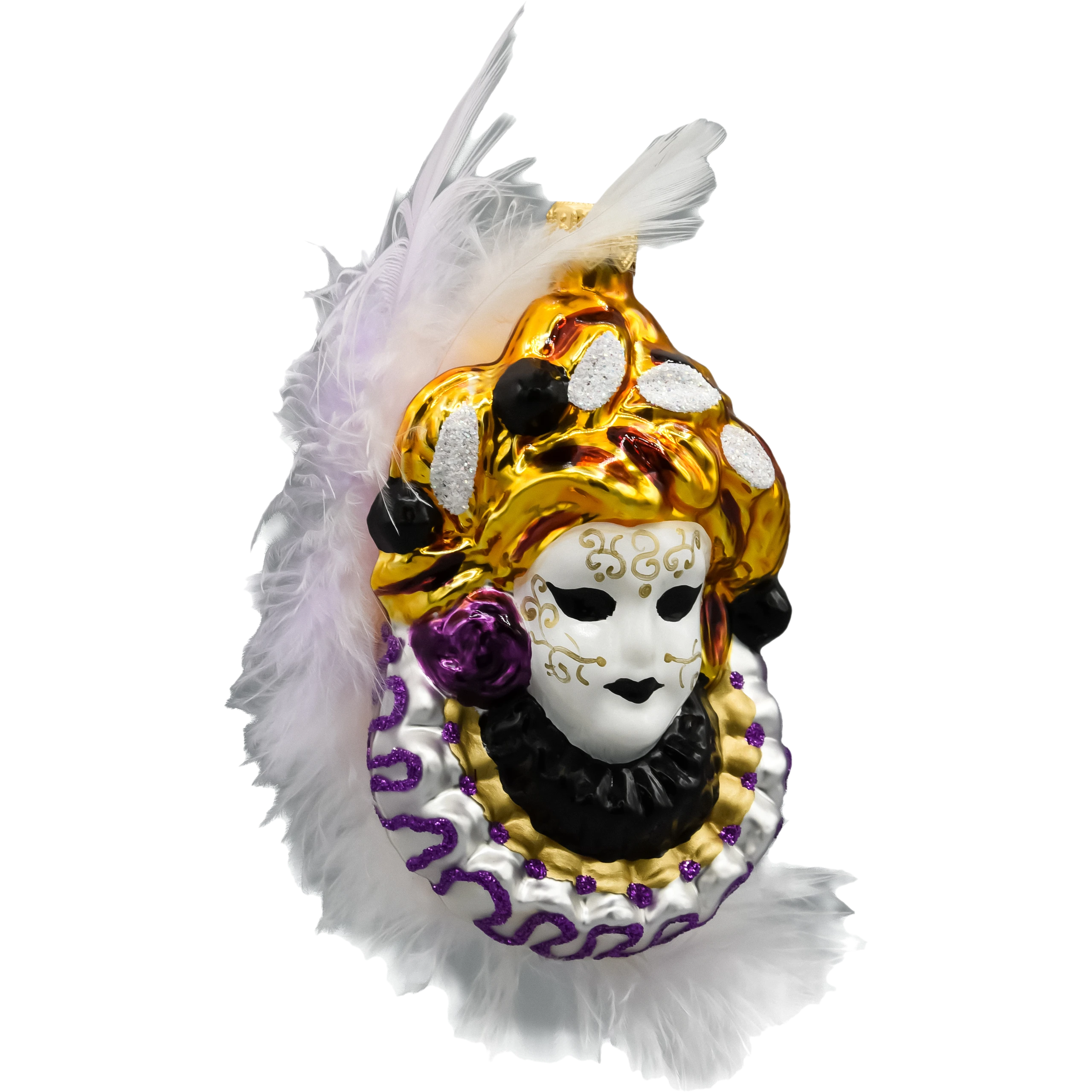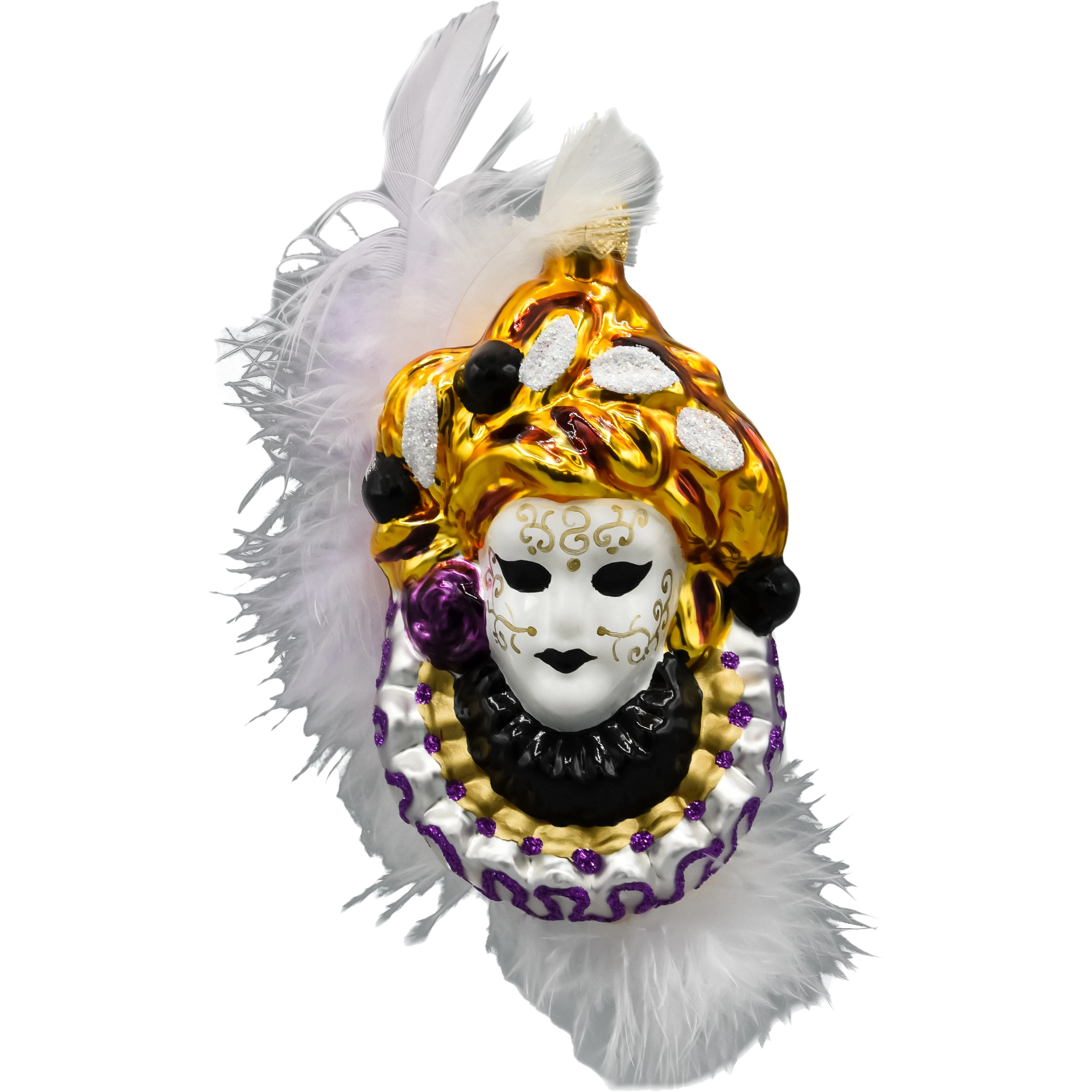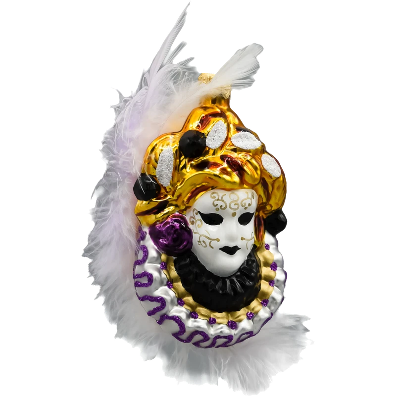 Ta szklana bombka w kształcie karnawałowej maski to prawdziwe dzieło sztuki rękodzielniczej, które łączy w sobie teatralny przepych i świąteczny blask. Ręcznie malowana twarz w białej masce ozdobiona jest delikatnym złotym ornamentem, który przywodzi na myśl barokowe freski. Otacza ją fantazyjne nakrycie głowy w odcieniach złota, czerni i purpury, z dodatkiem mieniących się brokatem liści i jedwabistego pióra w pastelowym fiolecie, które dodaje lekkości i wdzięku. Szyję otacza wielowarstwowy, plisowany kołnierz w kolorach bieli, złota i czerni, ozdobiony purpurowymi akcentami.