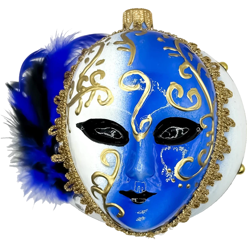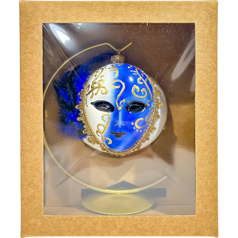 Ta niezwykła ozdoba inspirowana jest tajemniczymi maskami weneckimi, które od wieków są symbolem elegancji i wyrafinowania. Bombka wyróżnia się kontrastem intensywnego niebieskiego koloru i złotych zdobień, a także delikatnymi piórami, które dodają jej lekkości i luksusu.