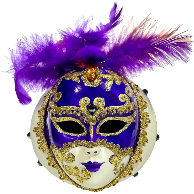 Odkryj magię karnawału! Ta ręcznie wykonana ozdoba to doskonałe połączenie elegancji i wyrafinowanego stylu, które nada Twojemu wnętrzu luksusowego charakteru. Bombka utrzymana jest w głębokim, fioletowym kolorze, który pięknie kontrastuje ze złotymi ornamentami oraz ozdobnymi piórami, tworząc wyjątkową, świąteczną dekorację. Zdobiona złotymi, brokatowymi detalami i wzbogacona o małe kamienie.