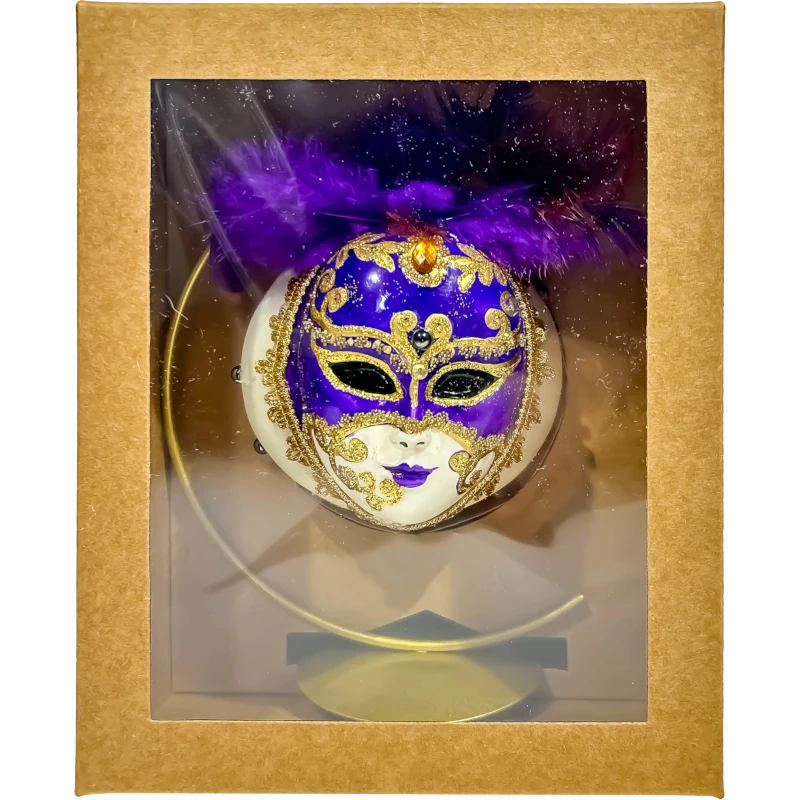 Każda bombka „Maska wenecka” została stworzona przez doświadczonych rzemieślników, którzy z niezwykłą precyzją oddali jej charakterystyczne wzory i zdobienia. Głęboka purpurowa barwa bombki, w połączeniu ze złotymi, misternie wykonanymi ornamentami, tworzy unikalny design. Urok bombki podkreślają delikatne pióra w odcieniach fioletu, dodające lekkości i teatralnego efektu. Złote i czarne kamienie stanowiące detale zdobienia sprawiają, że bombka lśni i przyciąga wzrok, podkreślając jej elegancki wygląd.