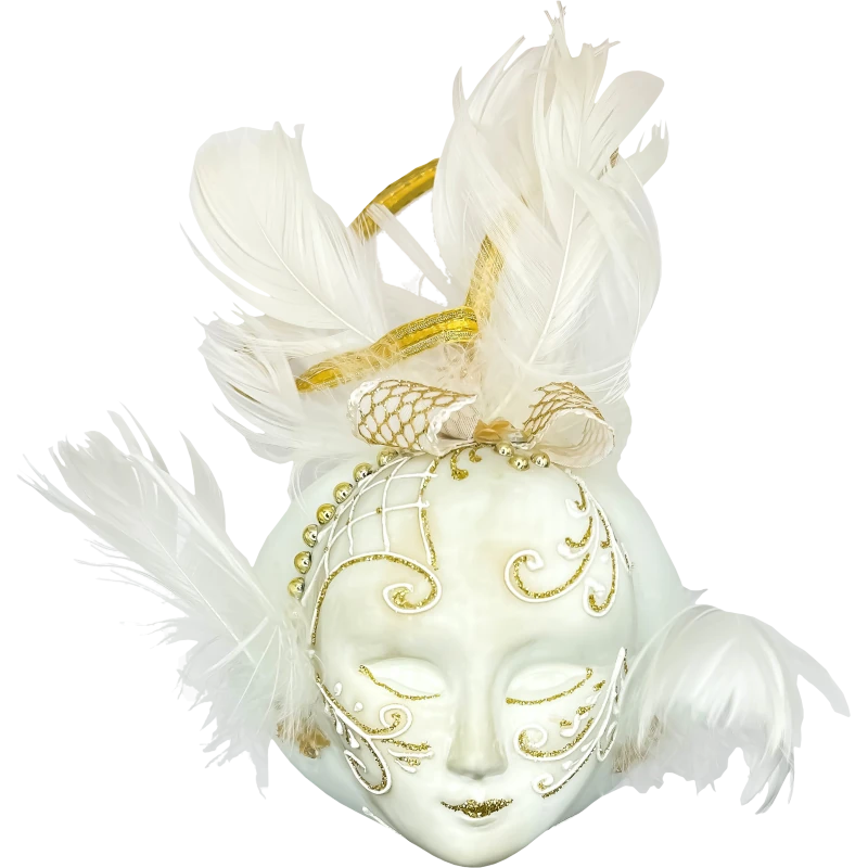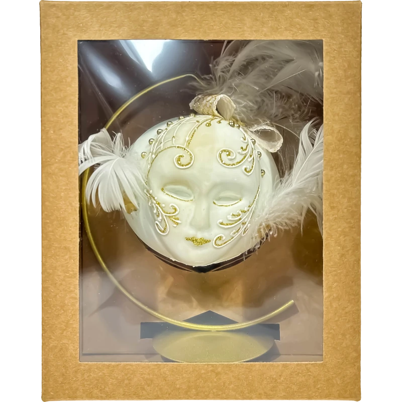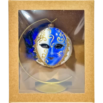 Prezentowana szklana bombka choinkowa wyróżnia się niepowtarzalnym, luksusowym wyglądem, inspirowanym tradycyjnymi weneckimi maskami. Twarz maski zdobiona jest subtelnymi złotymi ornamentami, które nadają jej elegancji i klasy. Każdy element bombki jest starannie przemyślany, a ręcznie malowane detale podkreślają jej wyjątkowość. To ozdoba, która natychmiast przyciągnie wzrok i stanie się centralnym punktem Twojego świątecznego drzewka.