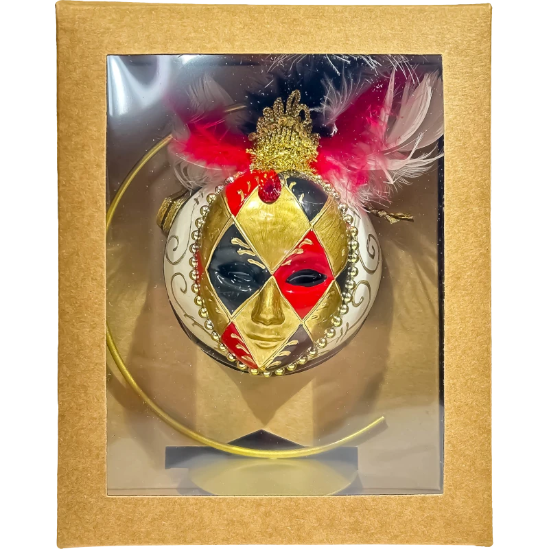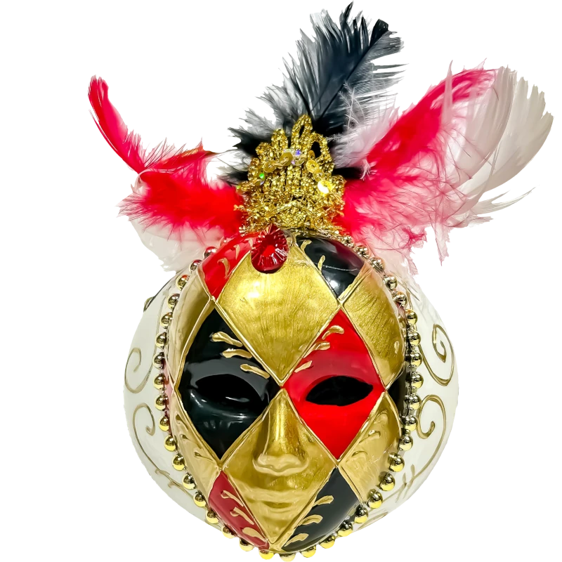 Bombka „Maskowa bombka wenecka z piórami” została stworzona przez doświadczonych rzemieślników, którzy z niezwykłą starannością odwzorowali każdy detal. Twarz maski ozdobiona jest złotymi i czarnymi elementami, przeplatanymi czerwonymi akcentami w stylu diamentowych wzorów, które nawiązują do tradycyjnych motywów karnawałowych. Korona na górze bombki zdobiona jest kamieniem oraz mieniącymi się złotymi elementami, które dodają jej królewskiego charakteru. Pióra w kolorach czerwonym, białym i czarnym nadają bombce lekkości i tworzą efektowny kontrast, który podkreśla jej artystyczny wyraz.