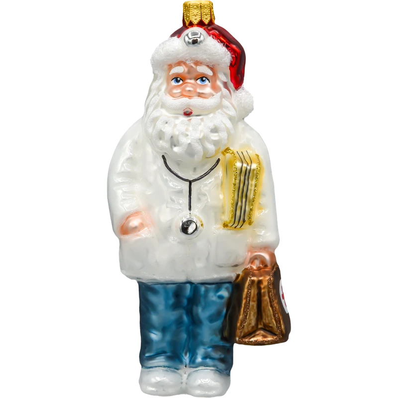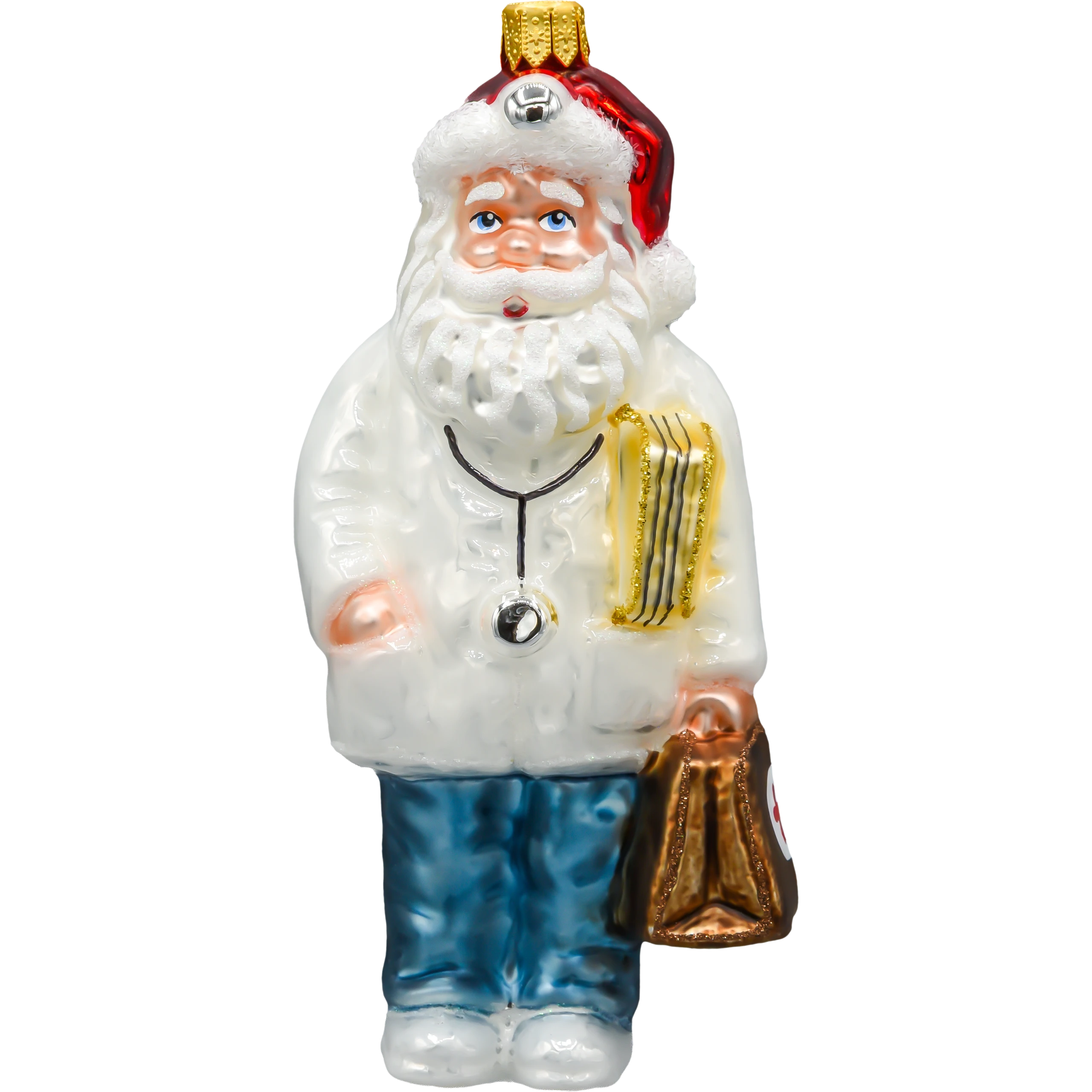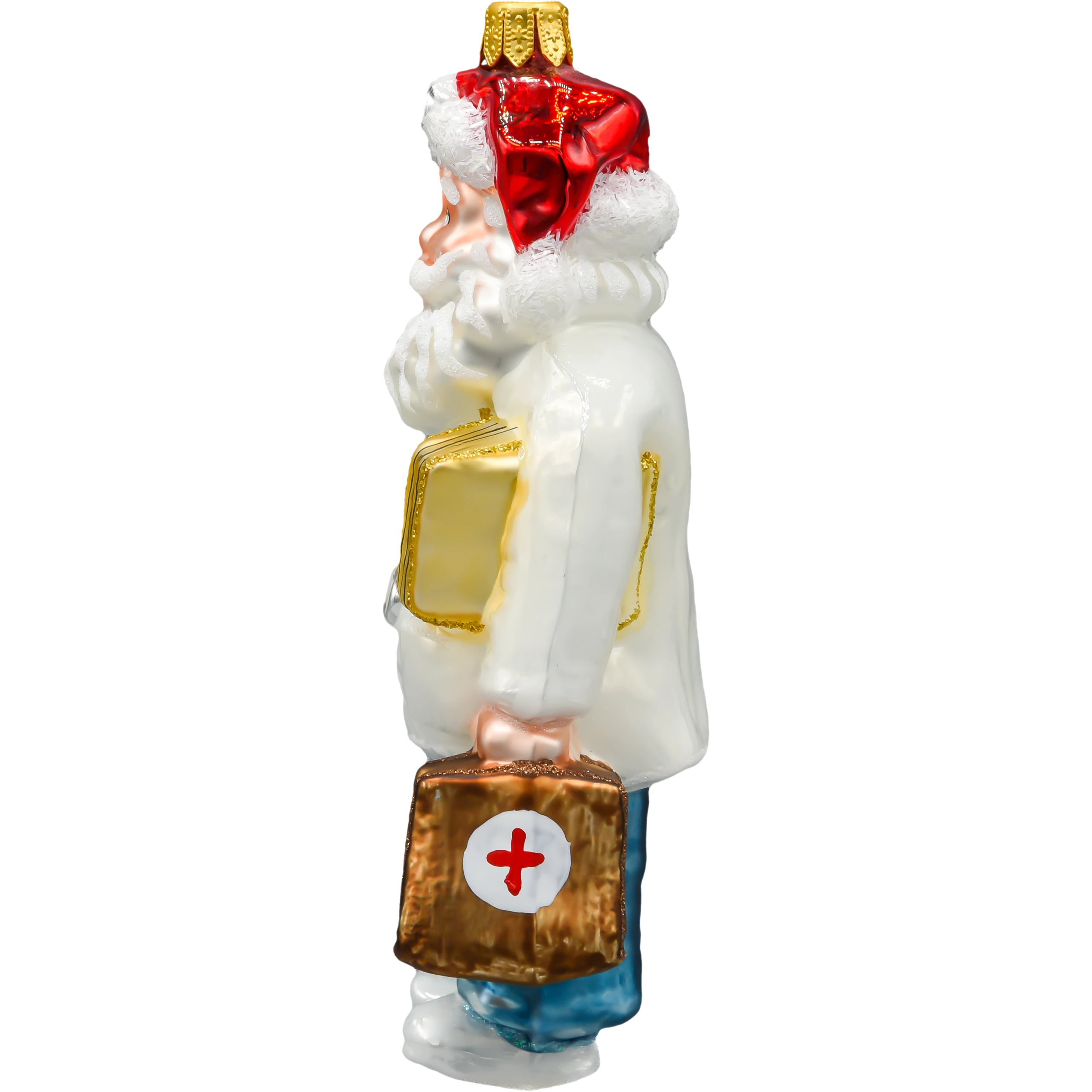 Święty Mikołaj w białym fartuchu z stetoskopem na szyi oraz torbą lekarską w dłoni łączy tradycyjny wizerunek z nowoczesnym przesłaniem. Uśmiechnięta twarz i czerwony kaptur podkreślają świąteczny nastrój, a detale związane z zawodem lekarza nadają bombce niepowtarzalnego charakteru.