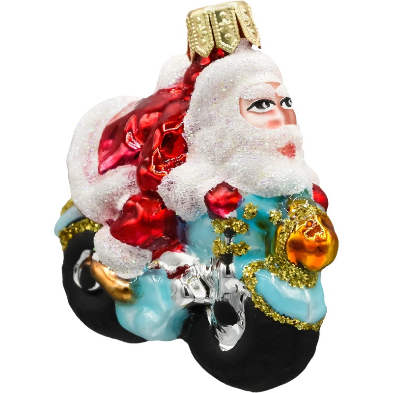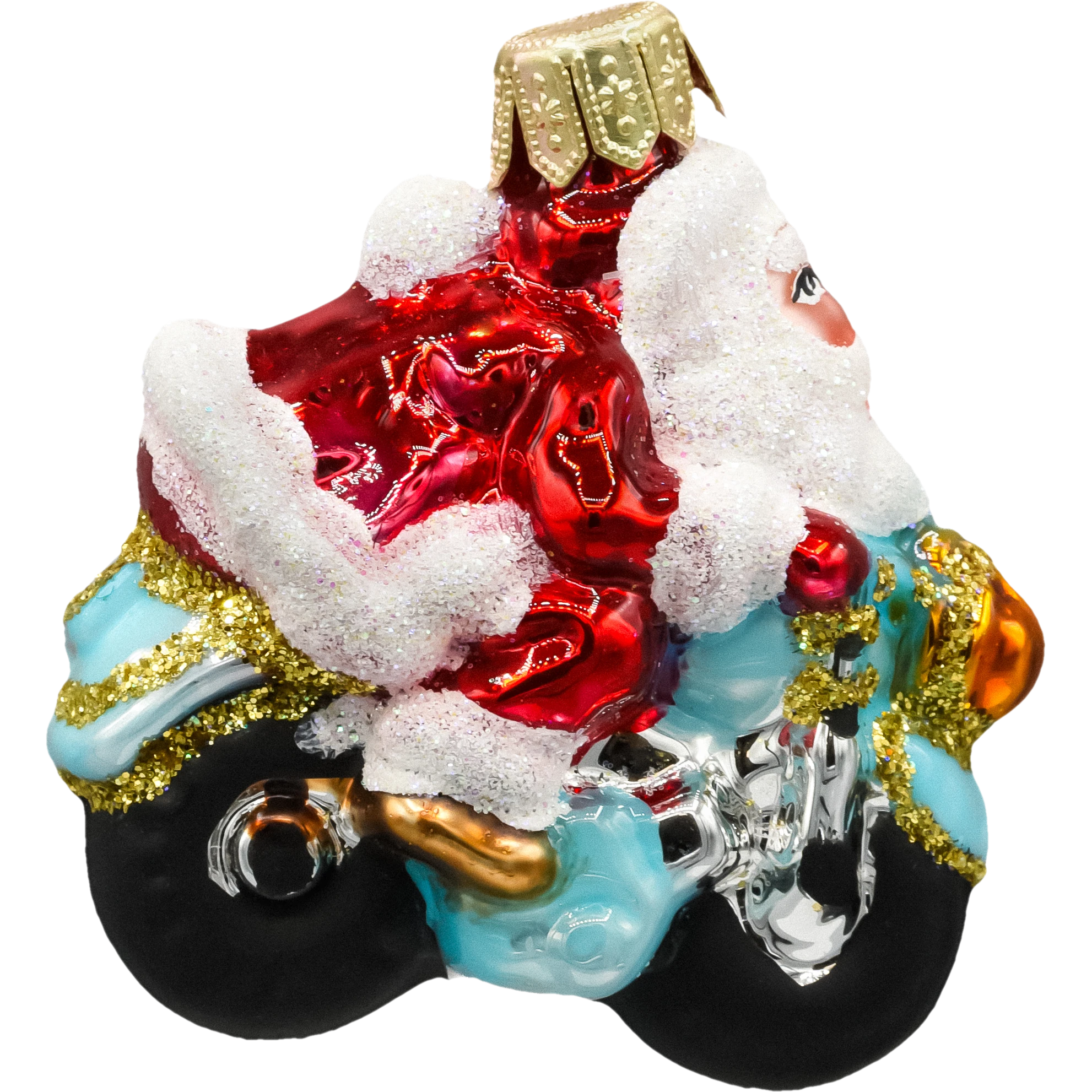 Postać Mikołaja wykonana została z najwyższej jakości szkła dmuchanego i starannie ozdobiona ręcznie – z brokatową brodą, ciepłym wyrazem twarzy i dokładnie odwzorowanym strojem. Błyszczące złote i czerwone akcenty przyciągają uwagę i dodają bombce świątecznego uroku. Każdy detal, od rączek kierownicy po połysk lakieru motoru, został precyzyjnie wykończony.