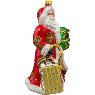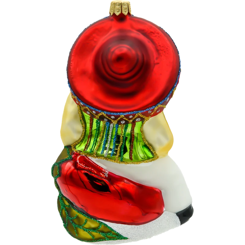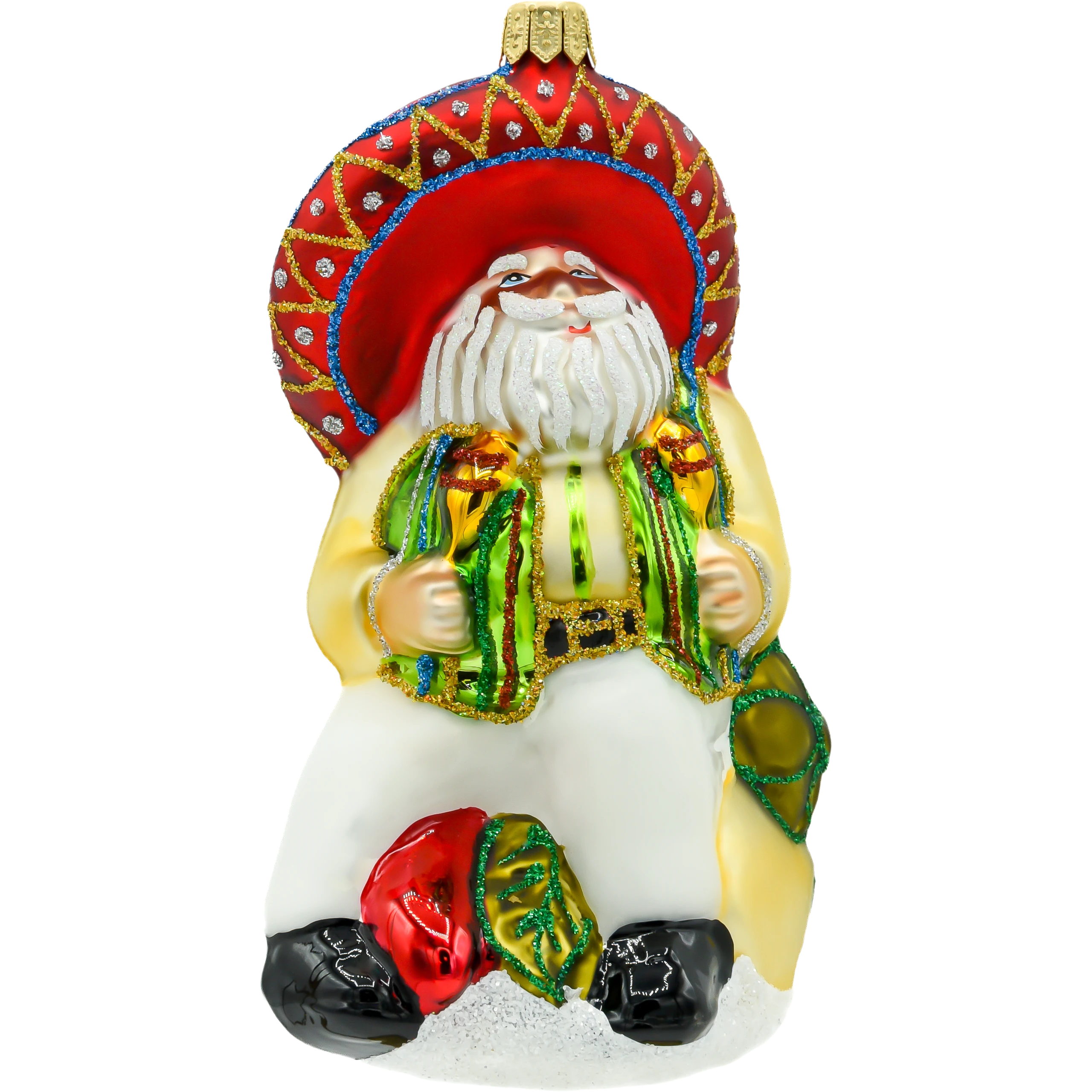 Ręcznie malowana bombka wyróżnia się żywymi kolorami i szczegółowymi zdobieniami, które przyciągają wzrok i dodają świątecznego klimatu. Mikołaj ma na sobie tradycyjny strój inspirowany meksykańską kulturą – dużą, czerwoną sombrero zdobioną złotym brokatem oraz kolorową, zielono-żółtą kamizelkę. W dłoniach trzyma dwa chile, symbolizujące meksykański charakter ozdoby.