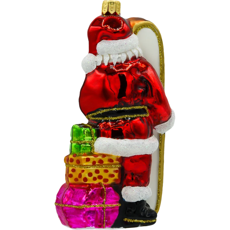 Wprowadź na swoją choinkę odrobinę magicznego ciepła dzięki tej wyjątkowej bombce – szklanej ozdobie przedstawiającej Świętego Mikołaja z białą tablicą i kolorowymi prezentami. Ręcznie malowana bombka zachwyca detalami: błyszczący czerwony strój Mikołaja z brokatowymi akcentami, misternie wymodelowana broda i śnieżna czapka z iskrzącym puchem przyciągają wzrok i tworzą klasyczną świąteczną atmosferę.