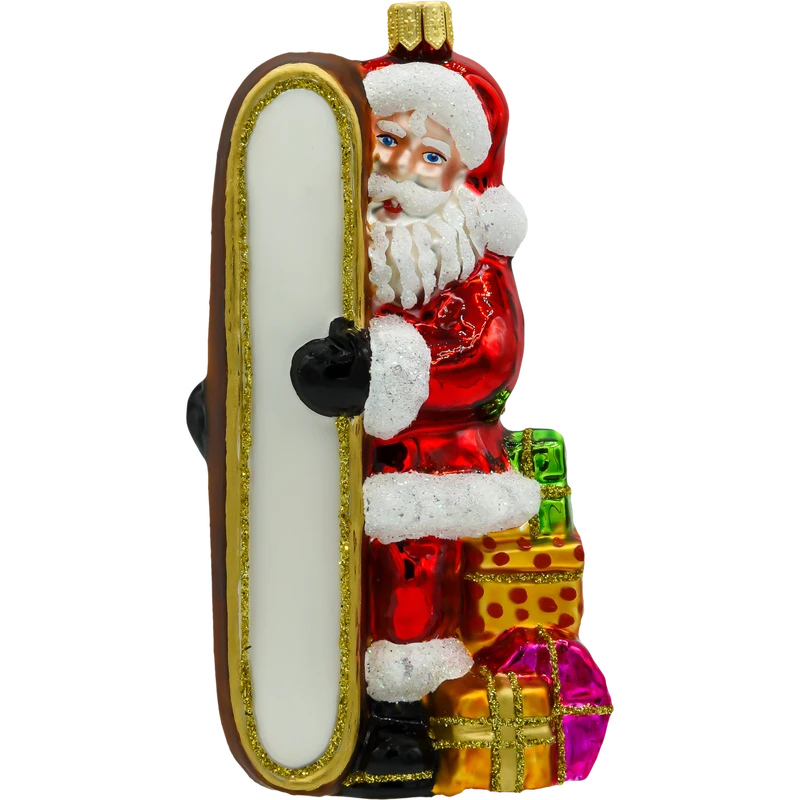 Bombka choinkowa Mikołaj z tablicą i prezentami – ręcznie malowana szklana ozdoba świąteczna