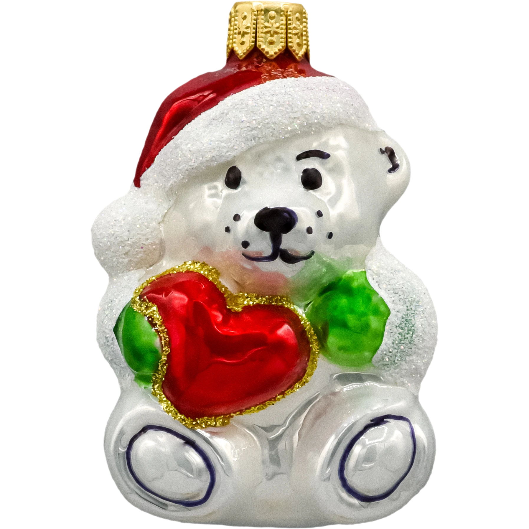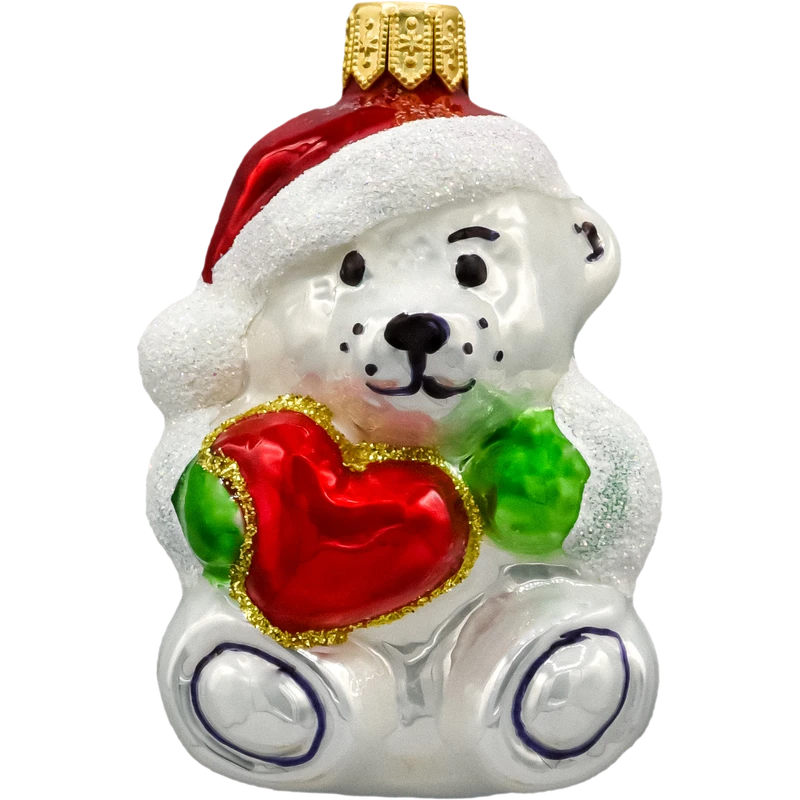 Wzbogać świąteczne dekoracje o uroczą bombkę, przedstawiającą misia polarnego w świątecznej czapce Mikołaja. Ta ręcznie malowana bombka wykonana z wysokiej jakości szkła prezentuje misia trzymającego czerwone serce, otoczone złotym brokatem, co dodaje mu wyjątkowego blasku i elegancji. Biały miś polarny symbolizuje zimową aurę, a czerwone serce i zielone rękawiczki nadają mu świątecznego charakteru, wprowadzając do domu ciepło i radość Bożego Narodzenia.