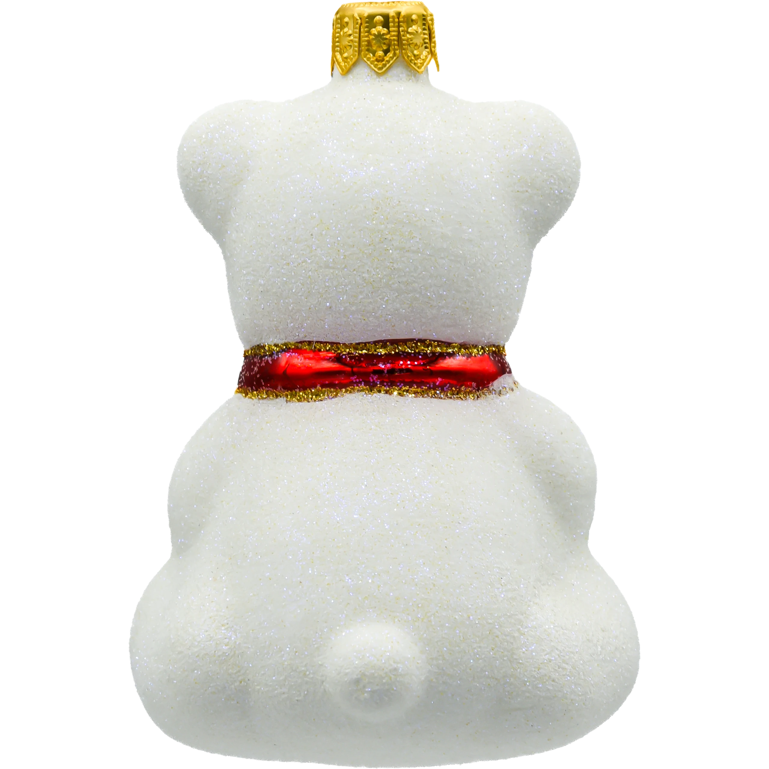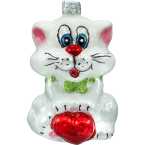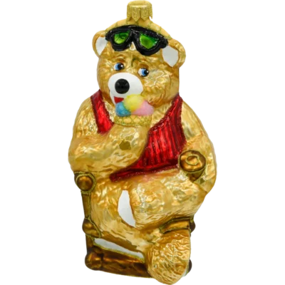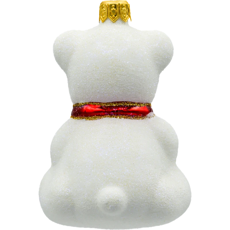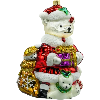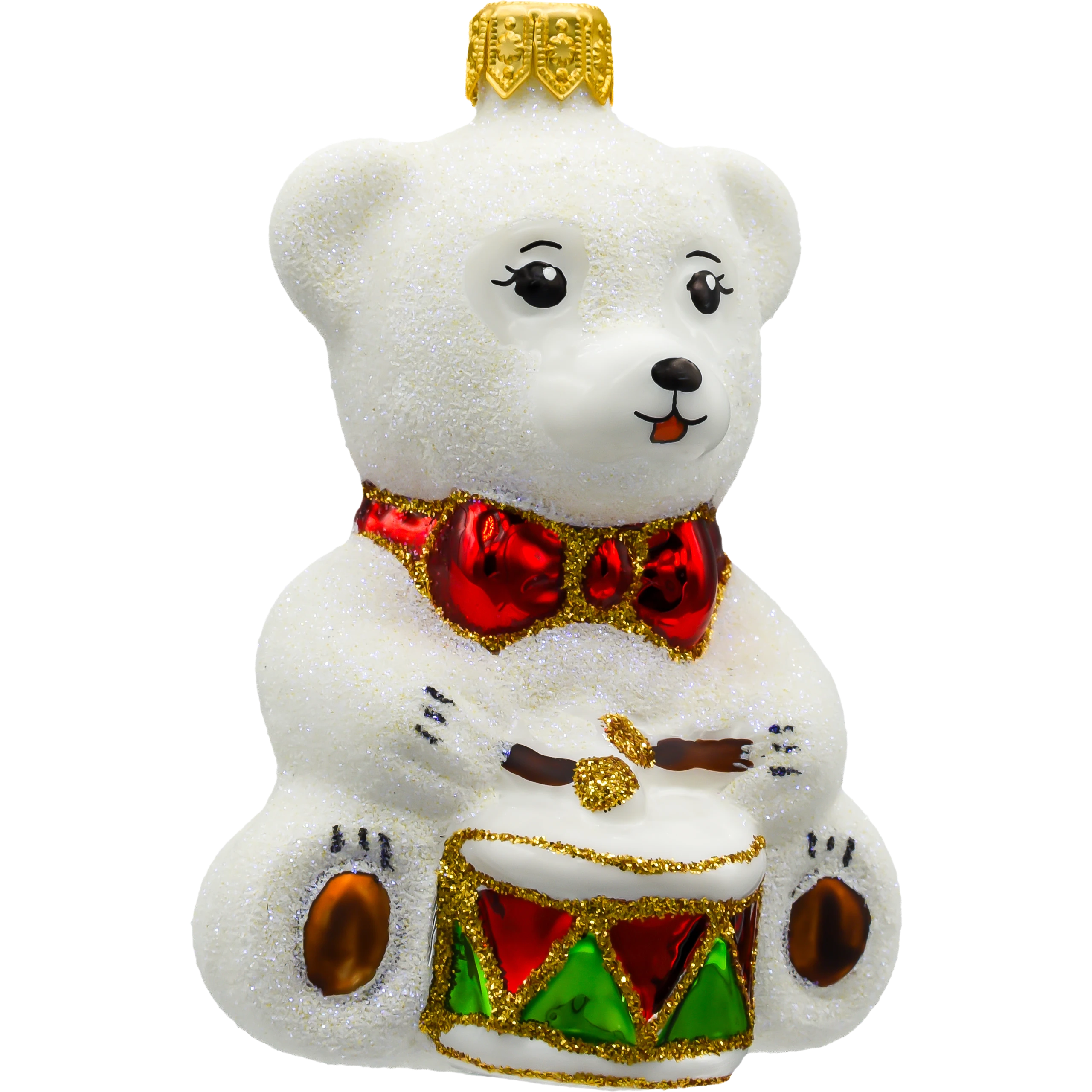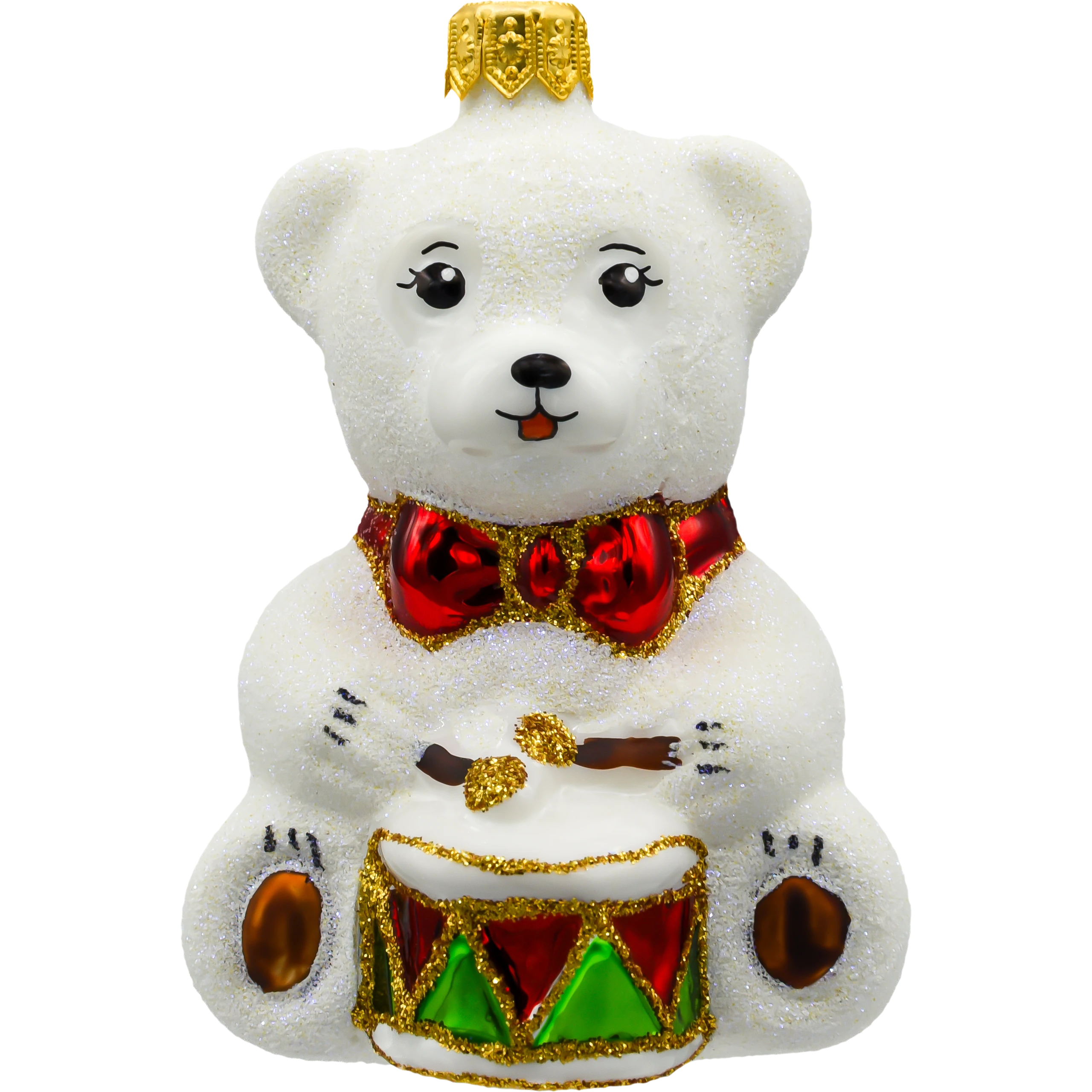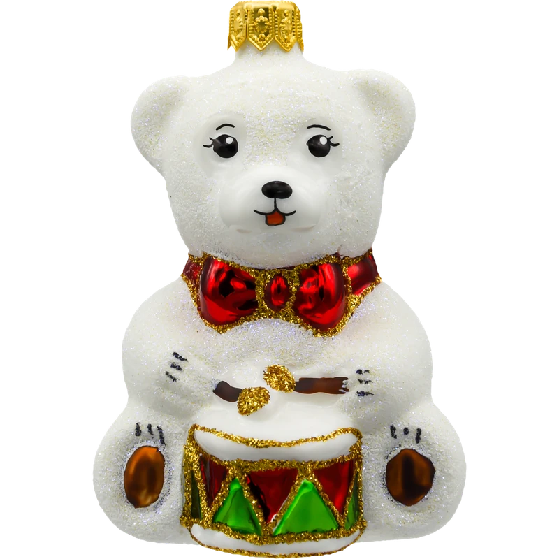 Bombka przedstawia siedzącego misia o śnieżnobiałym, brokatowym futerku, które subtelnie mieni się w świetle lampek choinkowych. Misio trzyma w łapkach kolorowy bębenek zdobiony trójkątnymi wzorami w czerwieni i zieleni, z wykończeniem w złotym brokacie. Całość dopełnia efektowna czerwona mucha pod szyją, która nadaje ozdobie eleganckiego uroku.