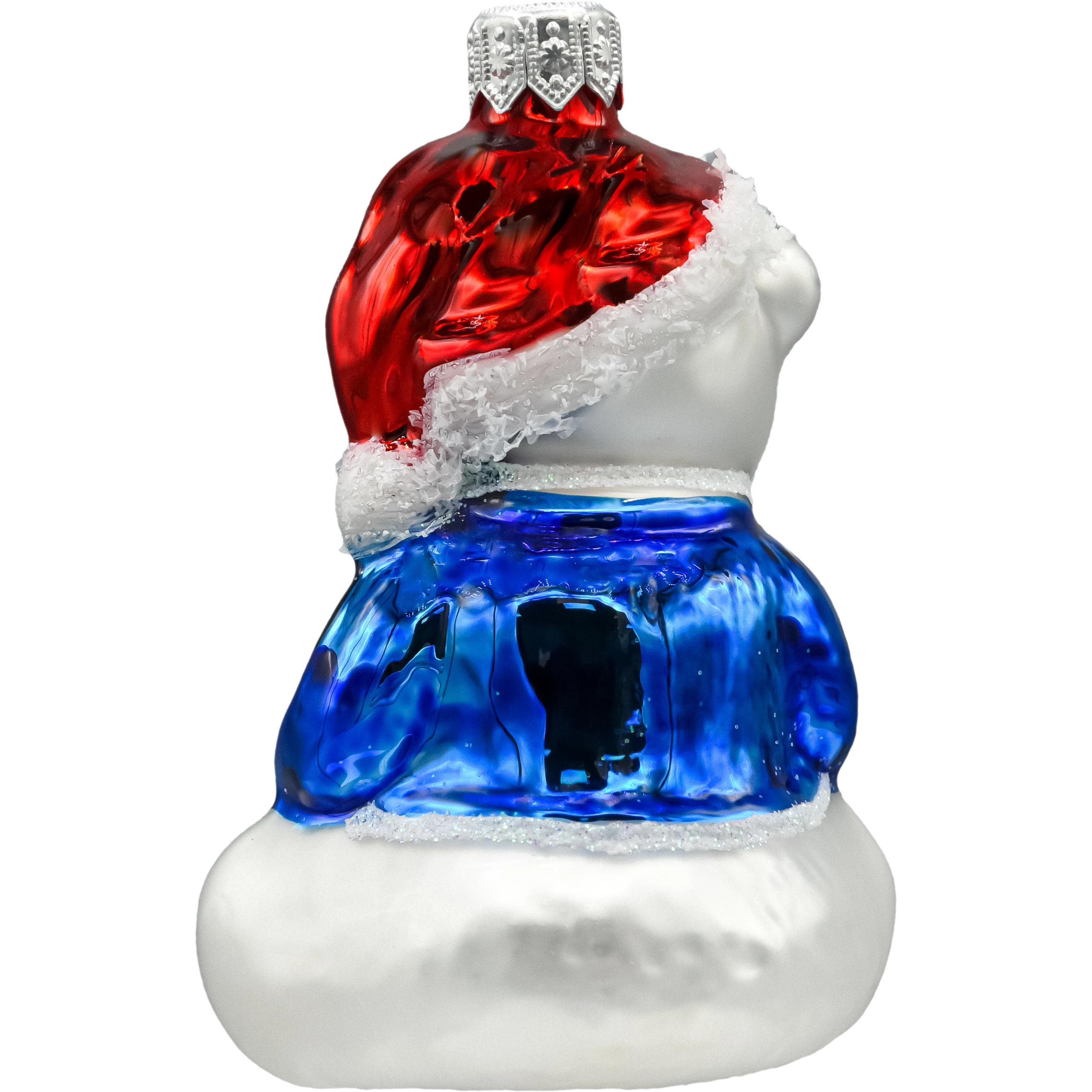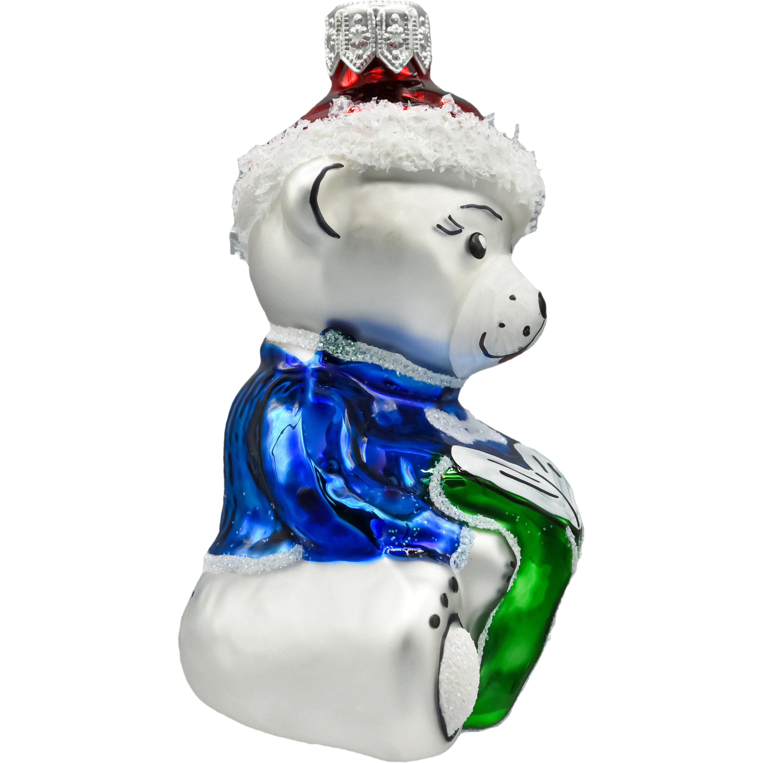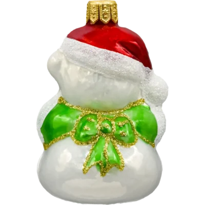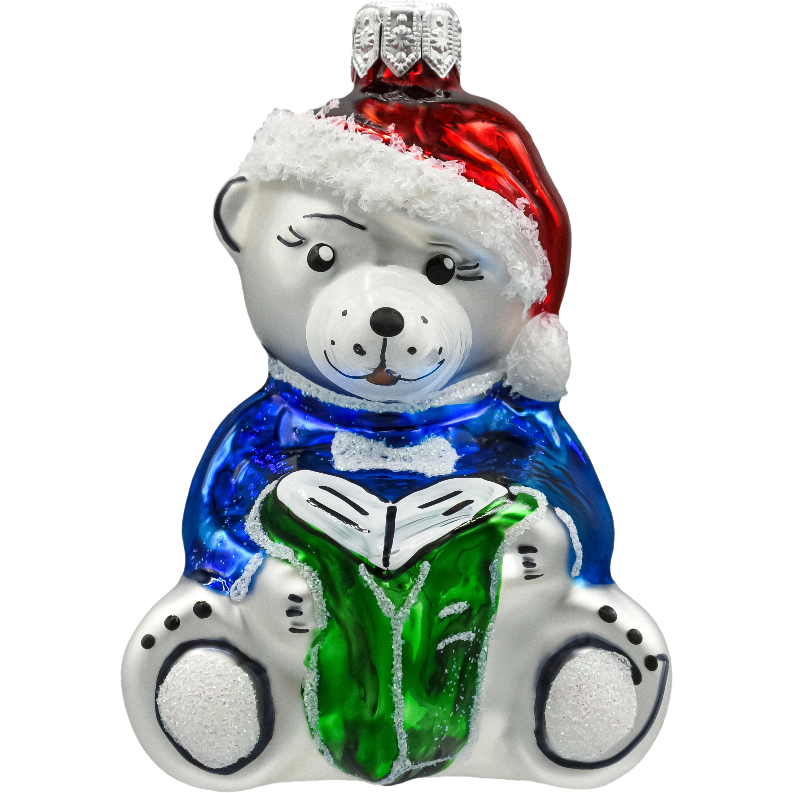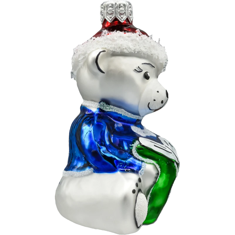 Szklana bombka figurka „Miś w czapce Mikołaja z książką” – dmuchana i ręcznie malowana. Lśniące emalie, cukrowy śnieg, srebrna zawieszka. Lekka, efektowna ozdoba choinkowa do rodzinnych aranżacji i świetny prezent świąteczny.