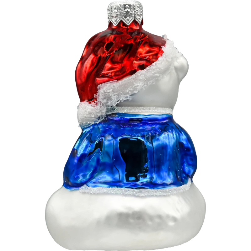 Urocza bombka choinkowa – miś polarny w czerwonej czapce Mikołaja, w kobaltowym swetrze i z zieloną książką w łapkach. Figurkę wykonano ze szkła dmuchanego, następnie ręcznie malowano i zdobiono „cukrowym śniegiem” oraz brokatem. Lśniące, żelowe emalie pięknie załamują światło lampek, a kremowo-białe futerko misia ma delikatny, satynowy połysk. To pogodna, przytulna ozdoba świąteczna dla dzieci i dorosłych – wprowadza klimat zimowych opowieści.