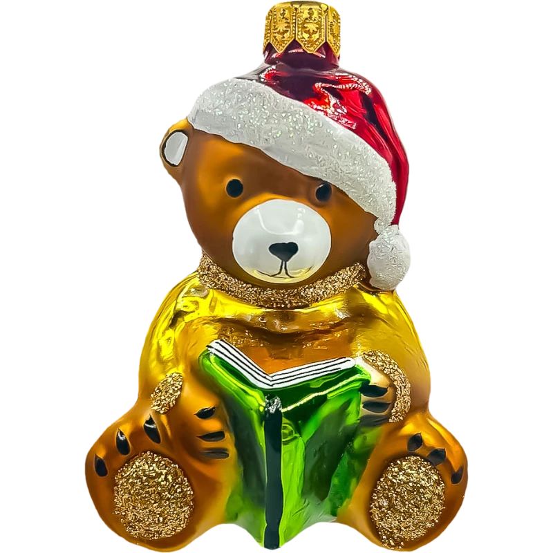 Bombka przedstawia siedzącego misia w świątecznej czapce, z książką w łapkach. Subtelny uśmiech oraz przyjazny wyraz twarzy tworzą ciepłą atmosferę, przywołując wspomnienia o świątecznych opowieściach.