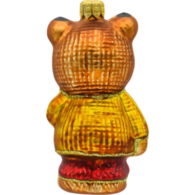 Bombka lśni dzięki złotym akcentom na łapkach i ciele misia, które doskonale komponują się z zieloną książką i czerwienią czapki świętego Mikołaja.