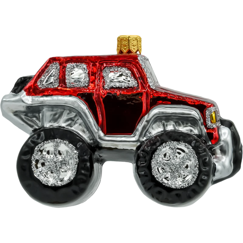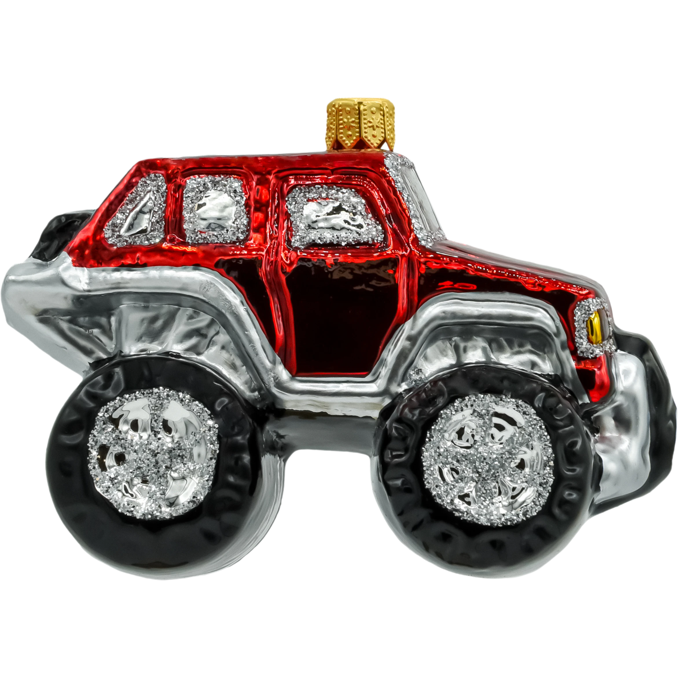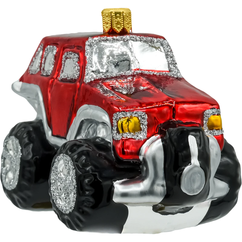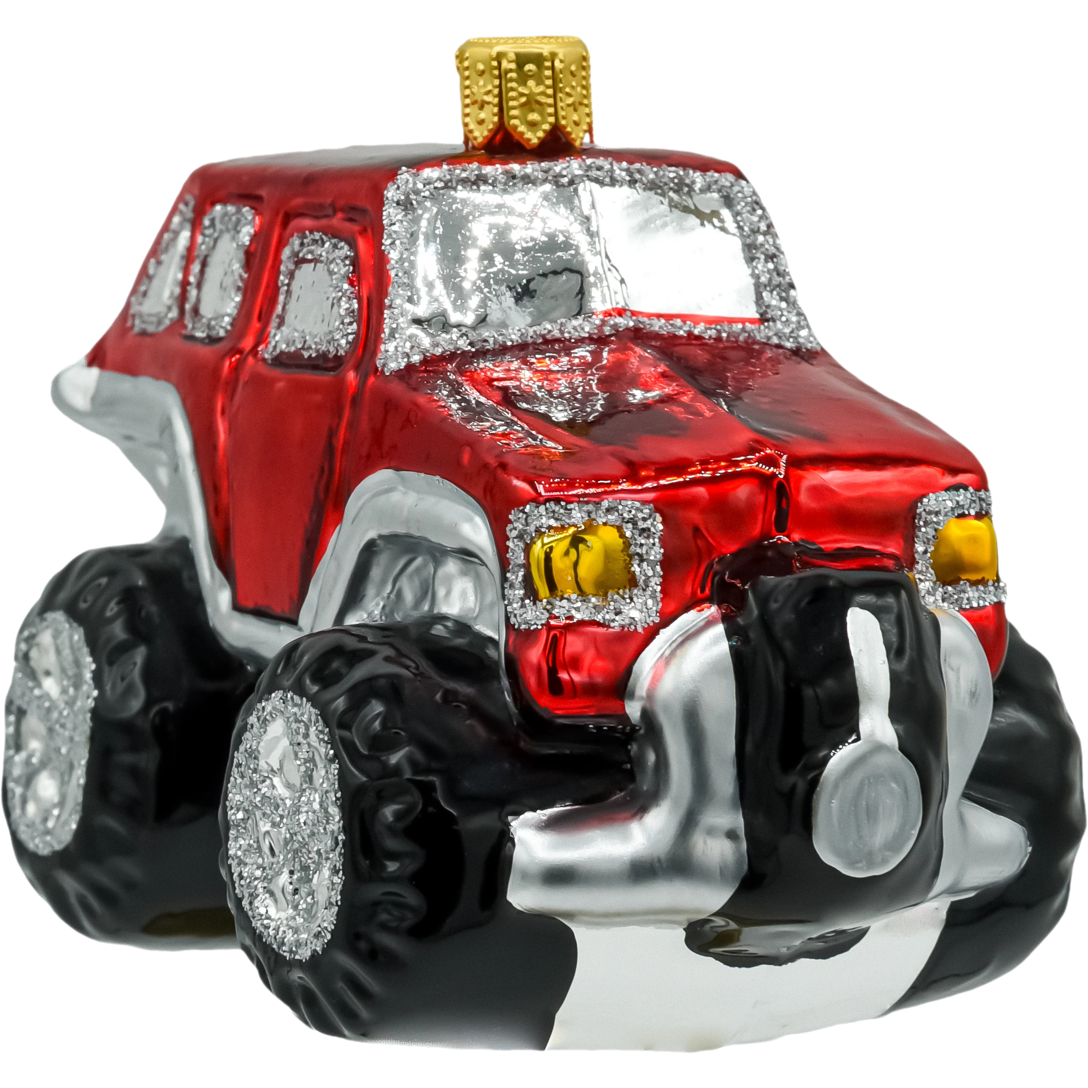 Szklana bombka choinkowa Monster Truck – ręcznie malowana ozdoba świąteczna ze szkła dmuchanego w kształcie terenowego auta z dużymi kołami. Idealna dla dzieci i fanów motoryzacji.