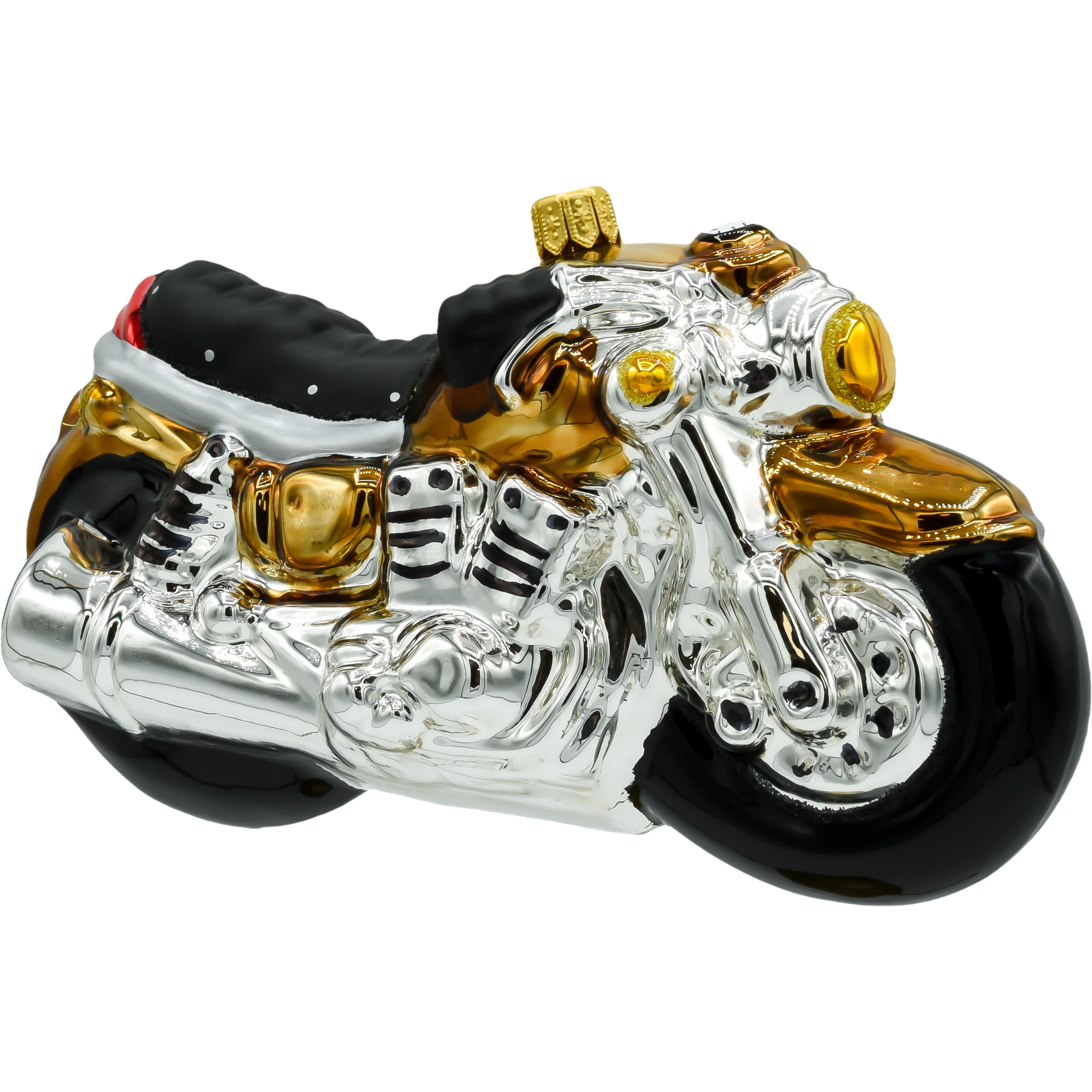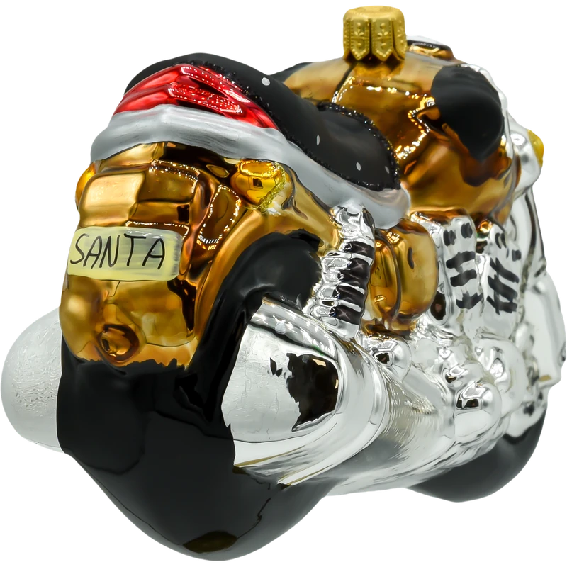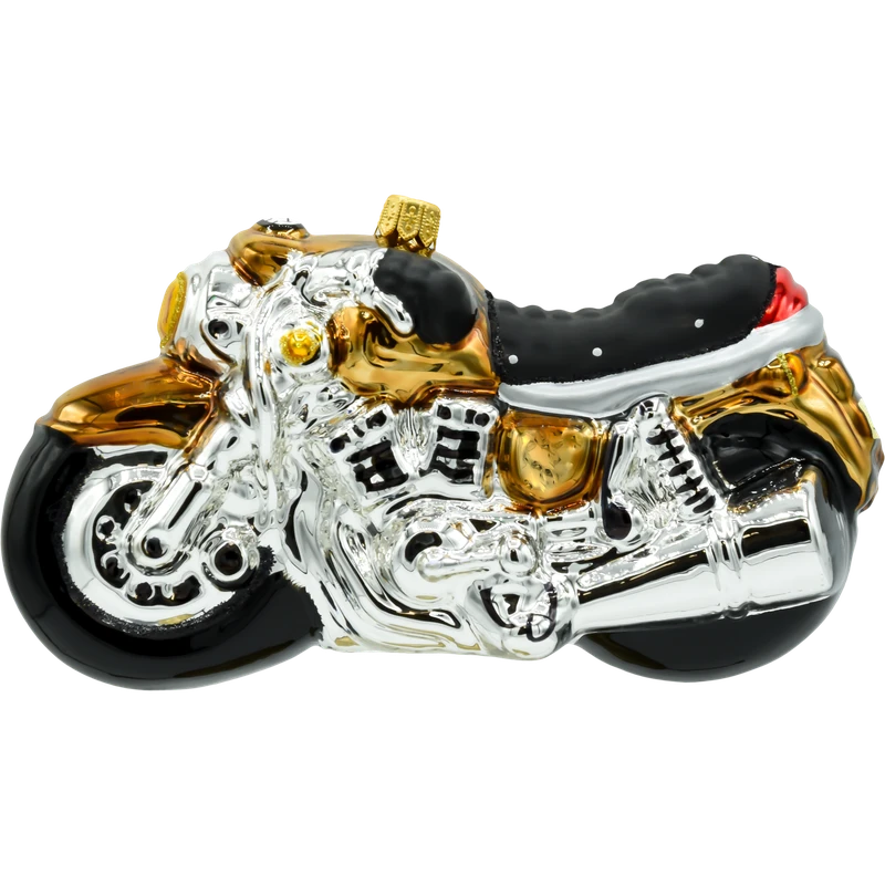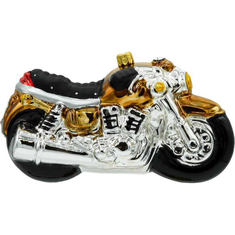 Złote i srebrne detale Ożyw swoją choinkę tą niezwykłą bombką w kształcie motocykla i wprowadź odrobinę świątecznej pasji motoryzacyjnej do swojego wnętrza!