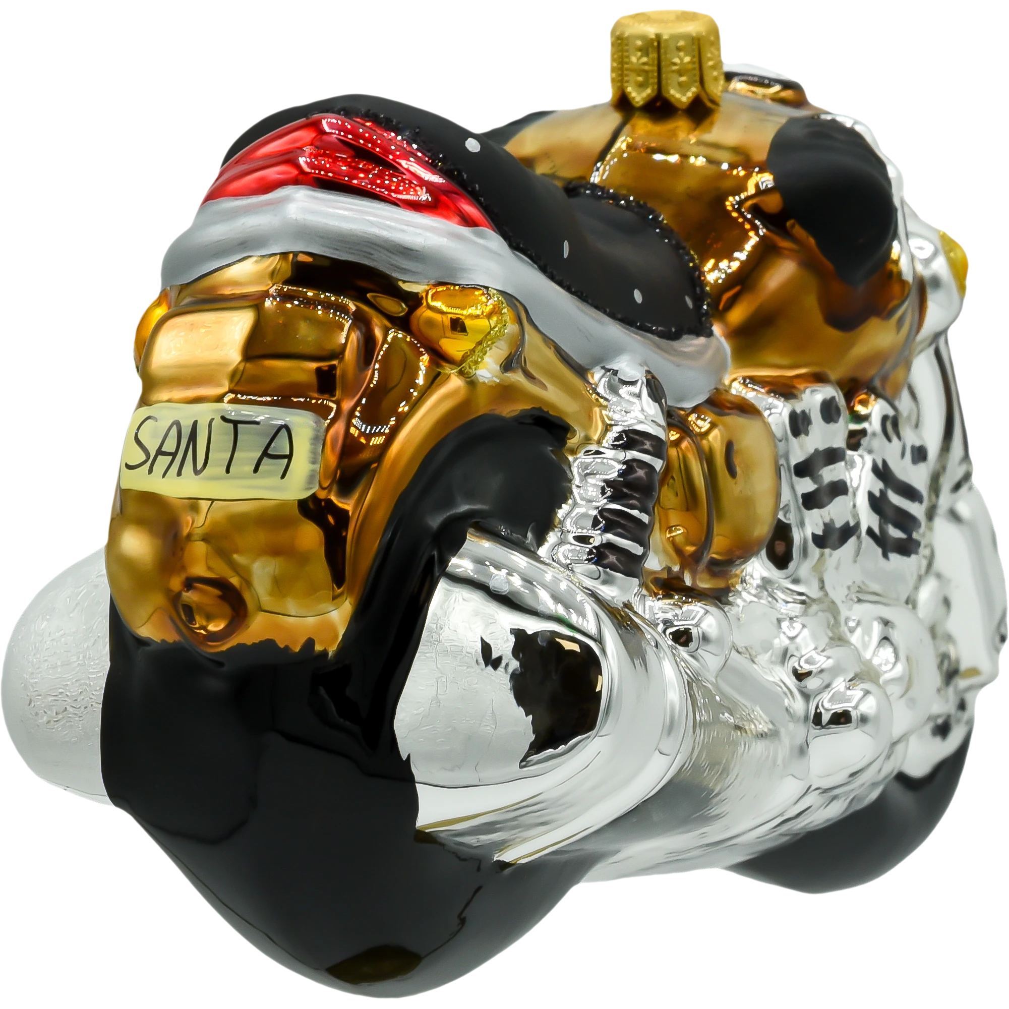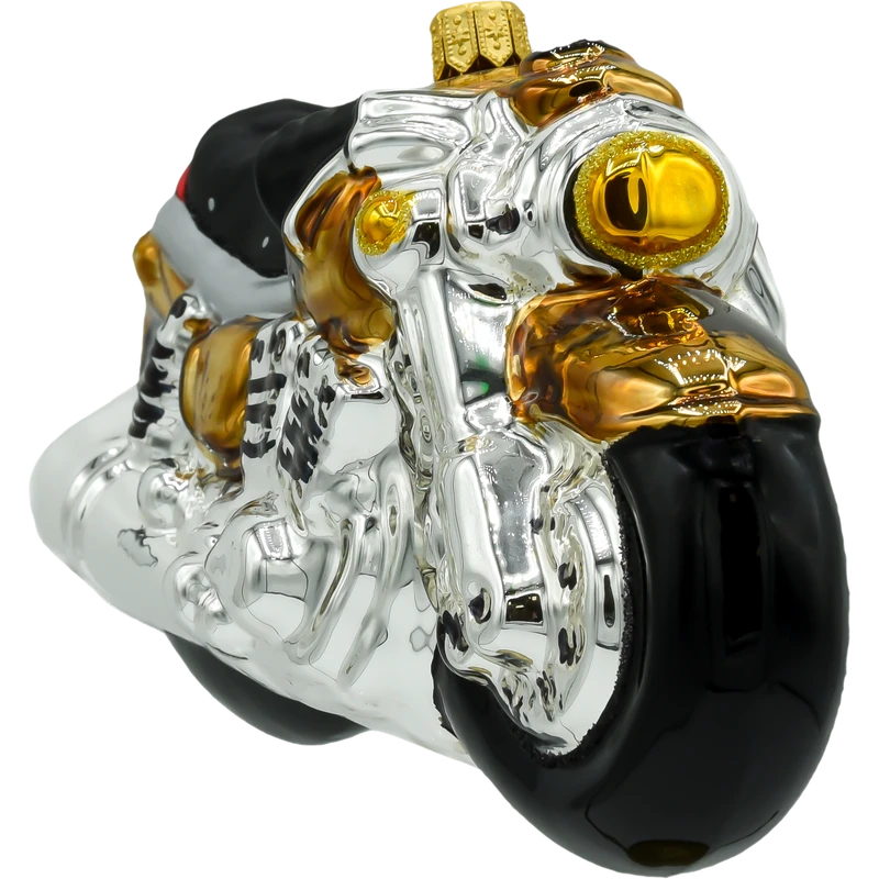 Motocykl mieni się srebrnymi i złotymi akcentami, co dodaje mu elegancji i blasku. Złote detale, takie jak reflektor, kierownica oraz wykończenia silnika, pięknie kontrastują z klasycznym, srebrnym wykończeniem nadwozia, tworząc bombkę, która przyciąga wzrok i będzie centralnym punktem na świątecznym drzewku. Ta bombka doskonale komponuje się z nowoczesnymi dekoracjami, wprowadzając odrobinę motoryzacyjnego stylu i elegancji do wnętrza.