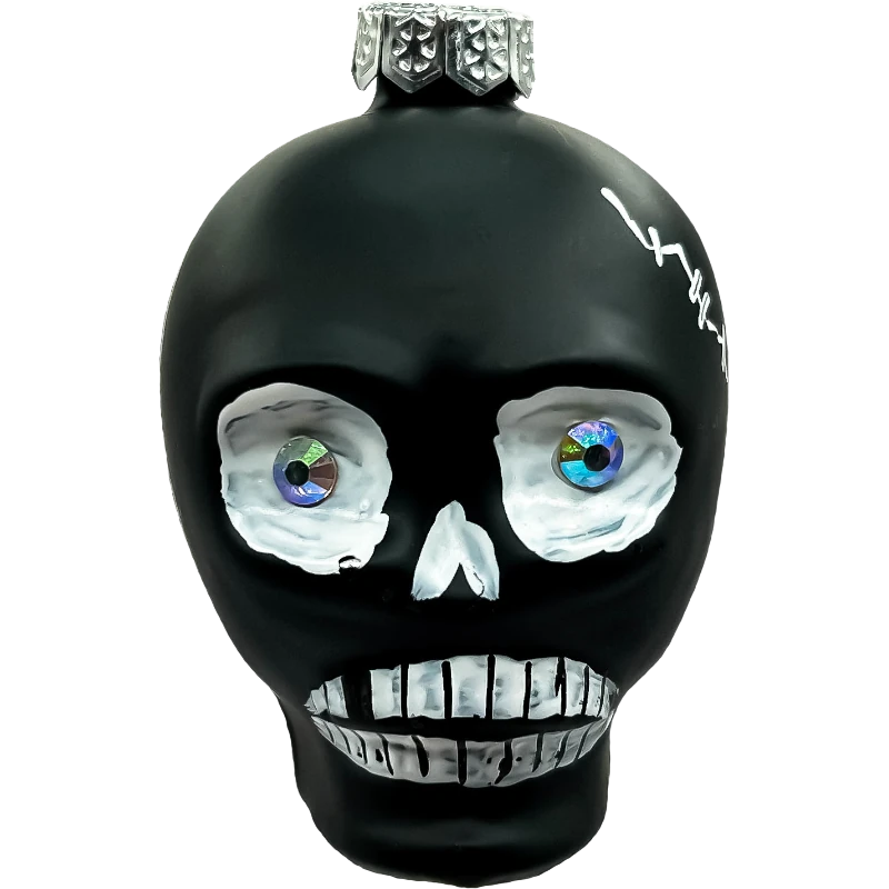 Szklana bombka w kształcie czaszki z hipnotyzującymi oczami i matowym czarnym wykończeniem