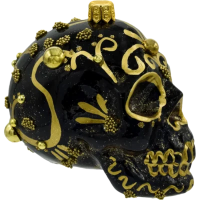 Szklana bombka w kształcie czaszki z czarnym matowym wykończeniem, które dodaje jej głębi i elegancji.