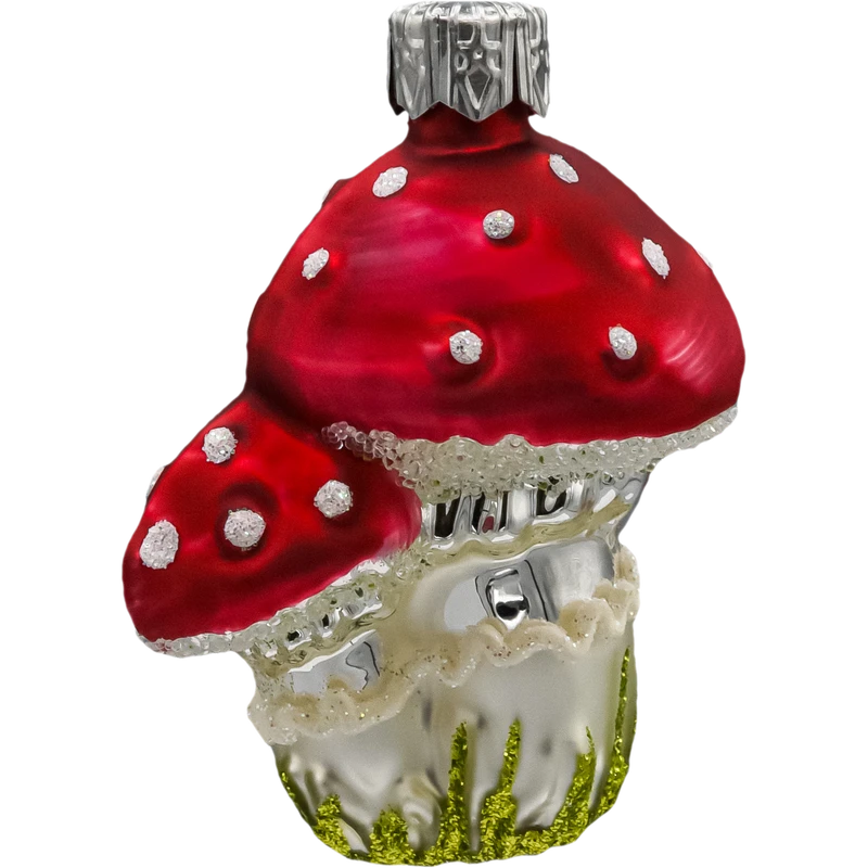 Wnieś odrobinę magicznego lasu do swojego domu dzięki tej wyjątkowej bombce choinkowej w kształcie pary muchomorków. Ta ręcznie wykonana figurka ze szkła dmuchanego przedstawia dwa grzybki o intensywnie czerwonych kapeluszach, ozdobionych klasycznymi białymi kropkami z brokatu. Całość spoczywa na dekoracyjnej podstawie przypominającej trawiastą ściółkę i pokryta jest delikatnym, mieniącym się brokatem imitującym szron i śnieg.