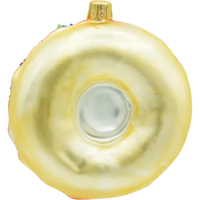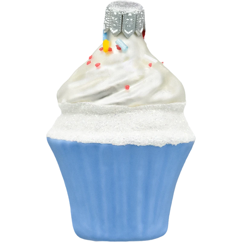 Motyw: Muffin z intensywnie niebieskim spodem, udekorowany kremem w kolorze perłowej bieli, bogato zdobiony kolorową posypką. Wzory z czerwonych, żółtych, niebieskich i białych cukrowych granulek nadają bombce wesoły i świąteczny charakter.