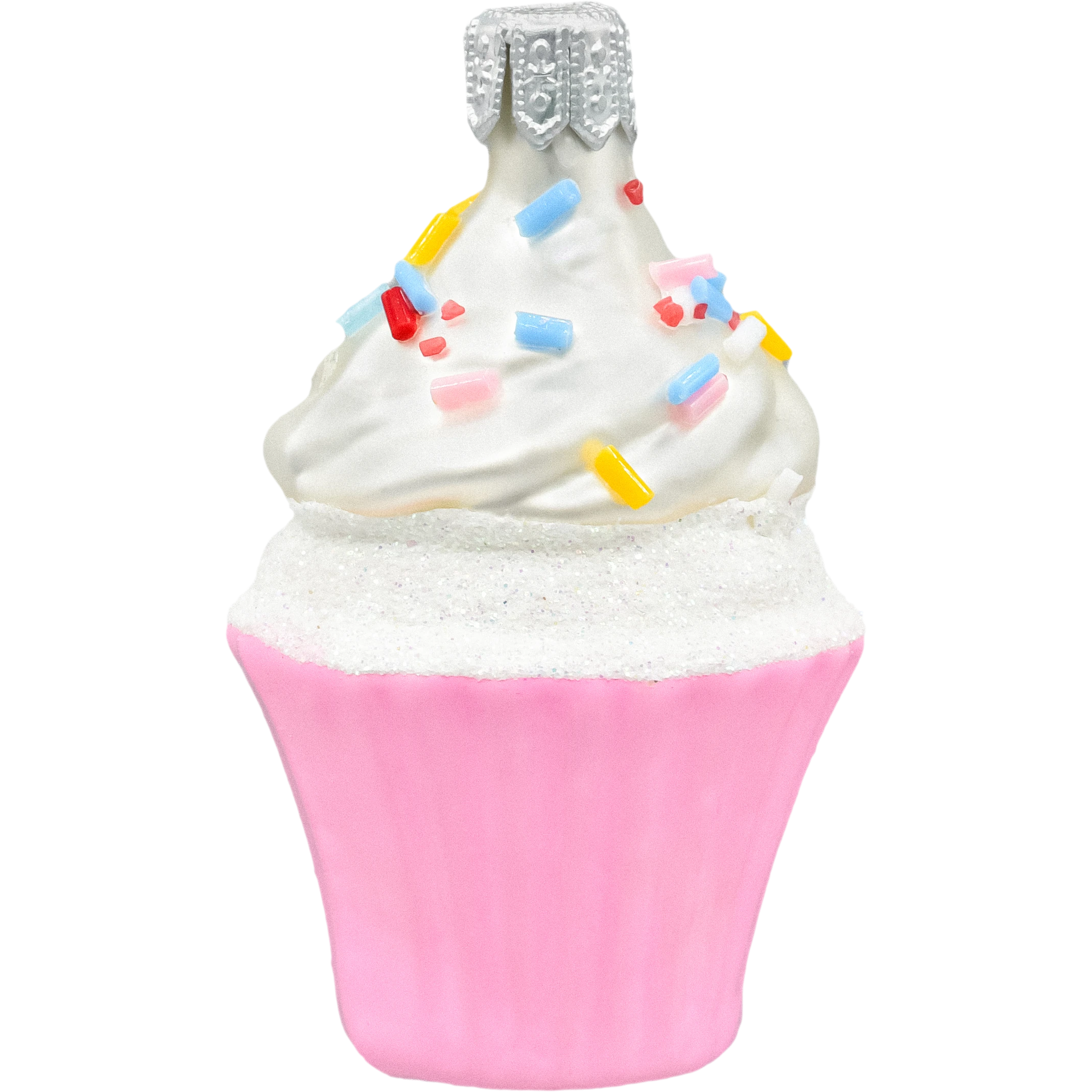 Motyw: Muffin z delikatnym, różowym spodem, ozdobiony kremem w kolorze perłowej bieli, posypany kolorowymi cukrowymi perełkami w odcieniach czerwieni, żółci, różu i niebieskiego. Brokatowe wykończenie nadaje ozdobie elegancji i sprawia, że błyszczy w świetle choinkowych lampek.