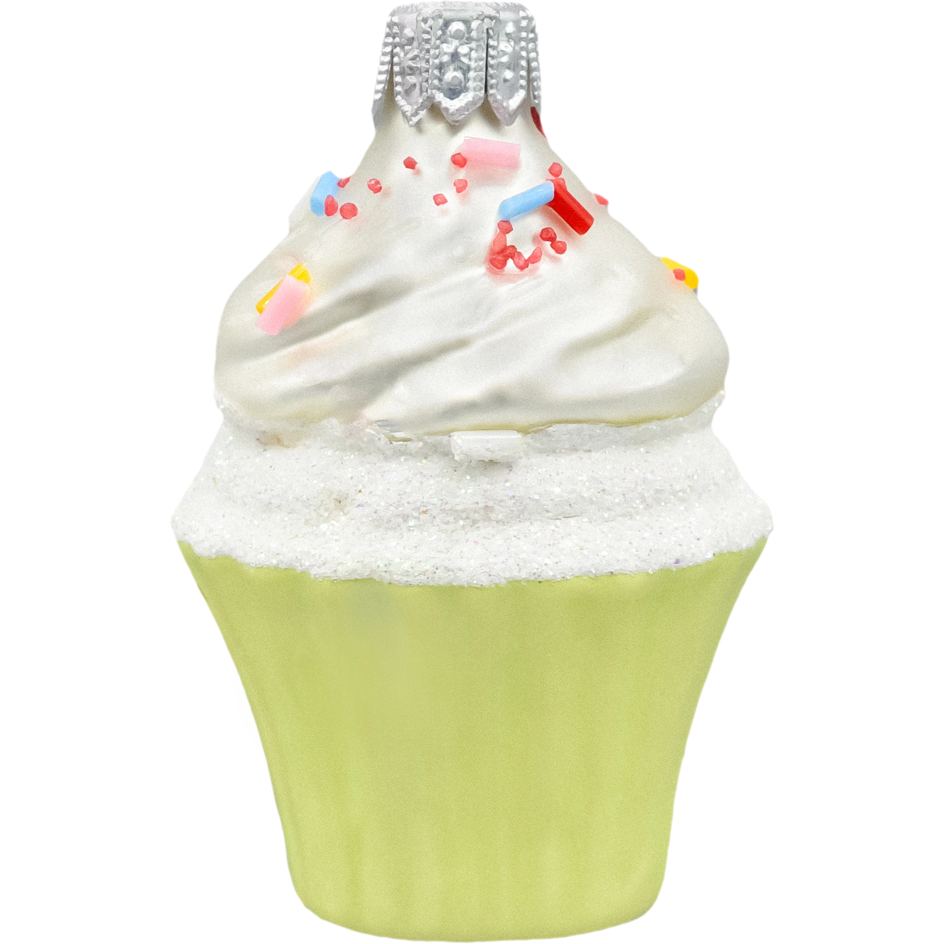 Kolorystyka: Soczysta zieleń spodu babeczki kontrastuje z kremowym wykończeniem oraz kolorowymi, cukrowymi posypkami. Błyszczące, brokatowe akcenty sprawiają, że bombka pięknie odbija światło choinkowych lampek, tworząc magiczny efekt.