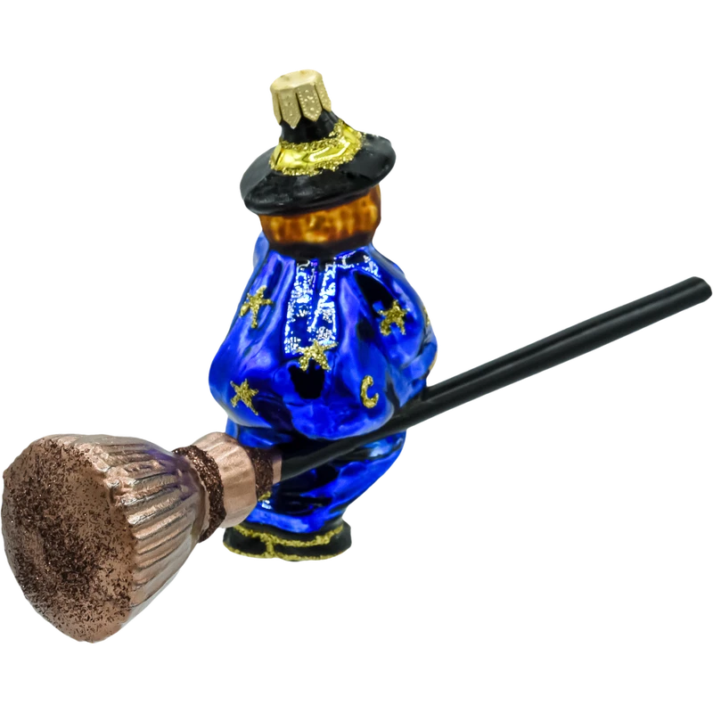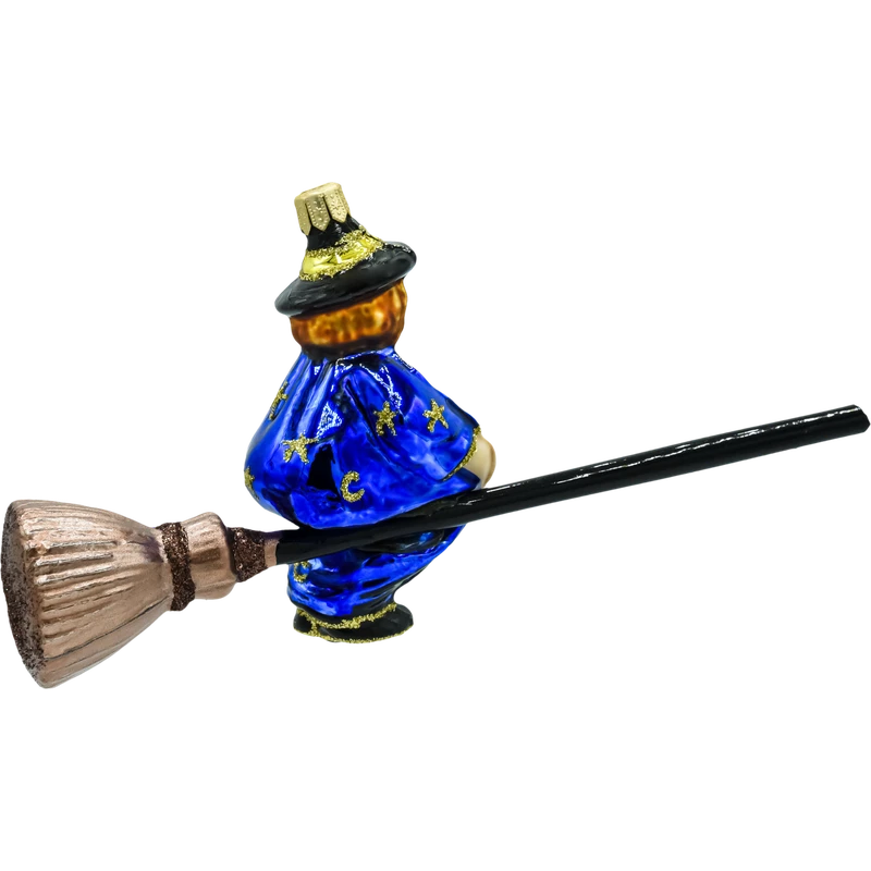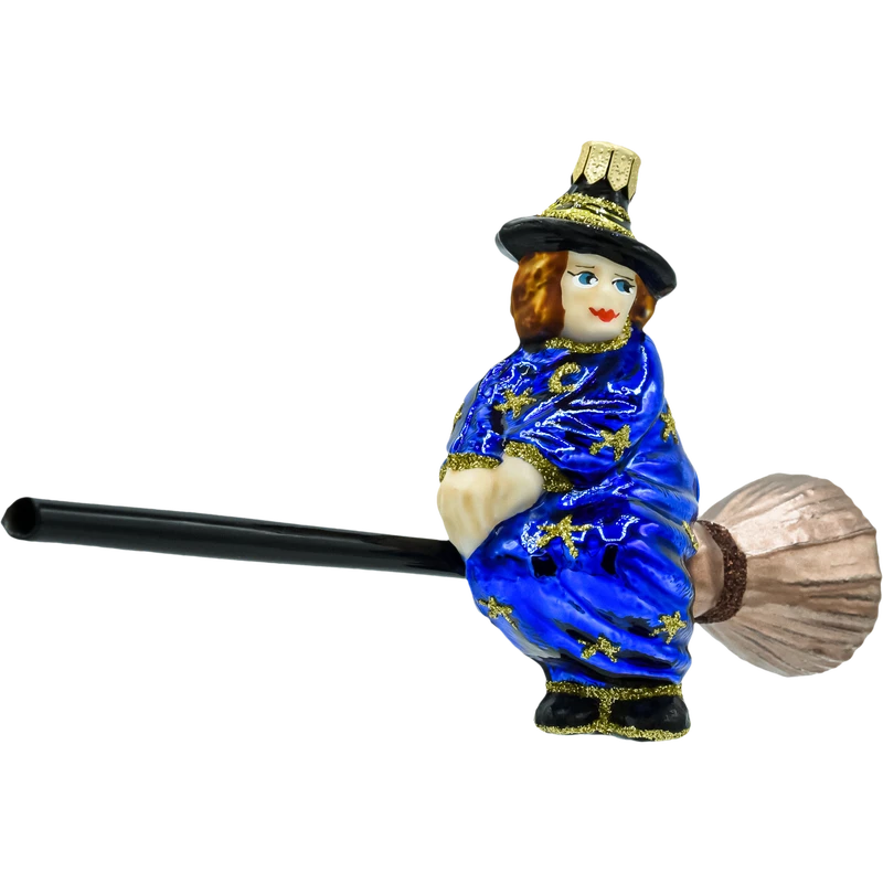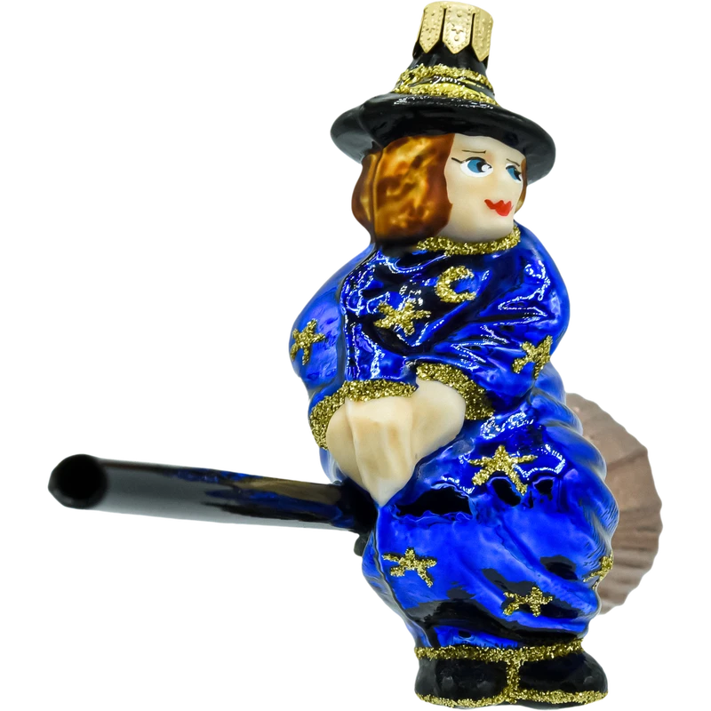 Bombka „Niebieska Czarownica na Miotle” to wyjątkowa ozdoba, która zachwyca swoim baśniowym charakterem i niebanalnym stylem. Postać czarownicy w intensywnie niebieskiej szacie, zdobionej złotymi gwiazdami, wprowadza unikalny akcent na każdej choince. Miotła z błyszczącą główką i złotymi detalami dodaje całości elegancji, a starannie wykonane detale sprawiają, że bombka prezentuje się spektakularnie.