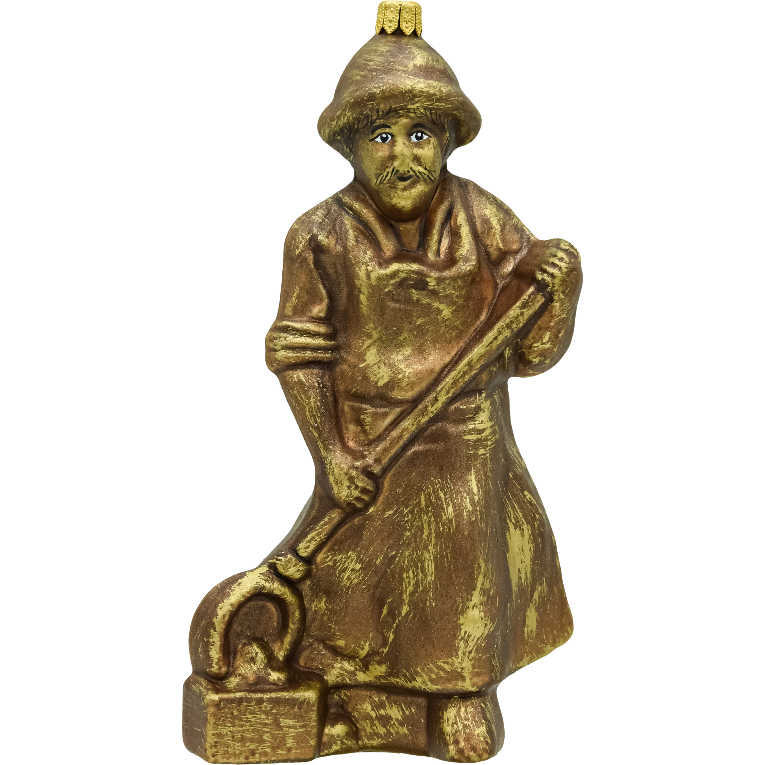 Hołd dla rzemiosła i ciężkiej pracy. Szklana bombka „Odlewnik” przedstawia robotnika z odlewni metali – w fartuchu, z charakterystycznym kapeluszem ochronnym i długim prętem/łyżką odlewniczą przy rozgrzanym tyglu. Całość utrzymana jest w złoto–brązowej patynie, która nadaje figurze wygląd starego metalu i pięknie mieni się w świetle lampek. Subtelne przetarcia i ręcznie malowane detale twarzy podkreślają kolekcjonerski charakter ozdoby.