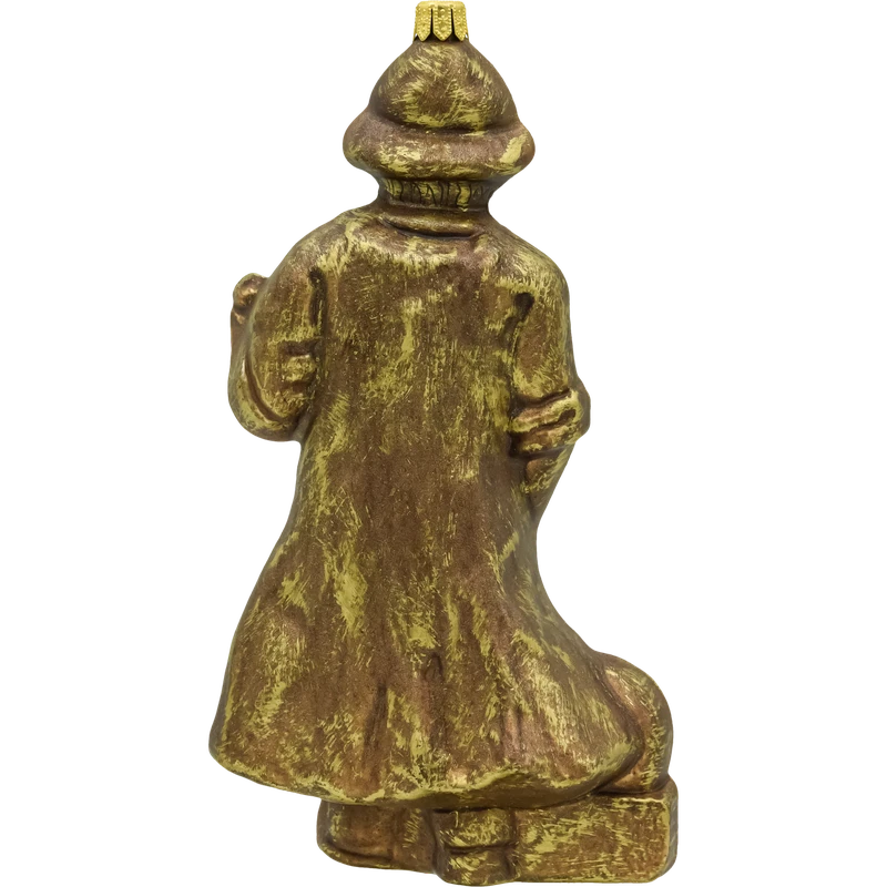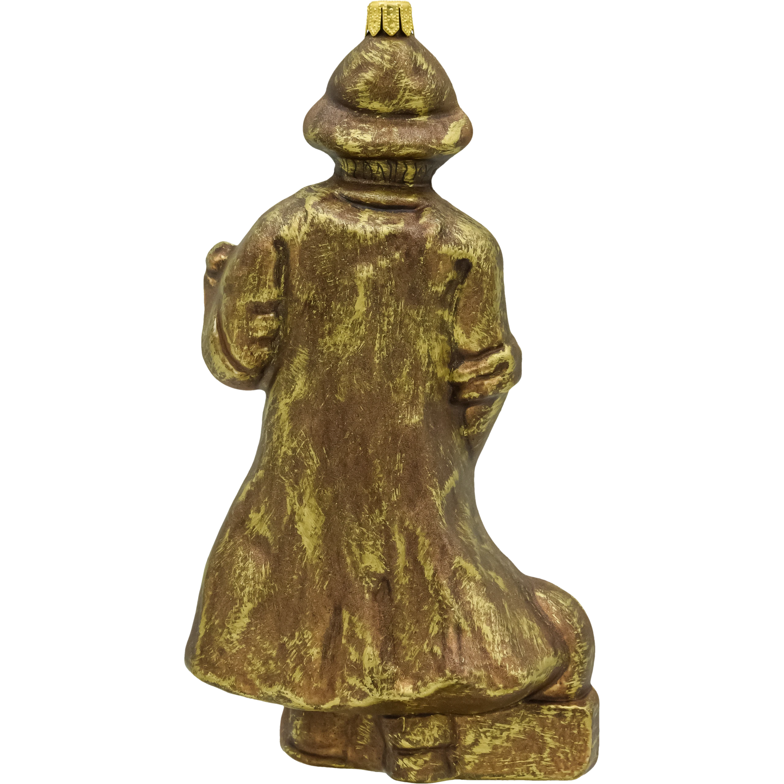 „Odlewnik” – szklana, ręcznie malowana bombka figurka w złoto-brązowej patynie, przedstawiająca pracownika odlewni z łyżką i tyglem. Elegancka ozdoba choinkowa w stylu industrial/vintage; oryginalny prezent dla hutnika, odlewnika lub kolekcjonera bombek.
