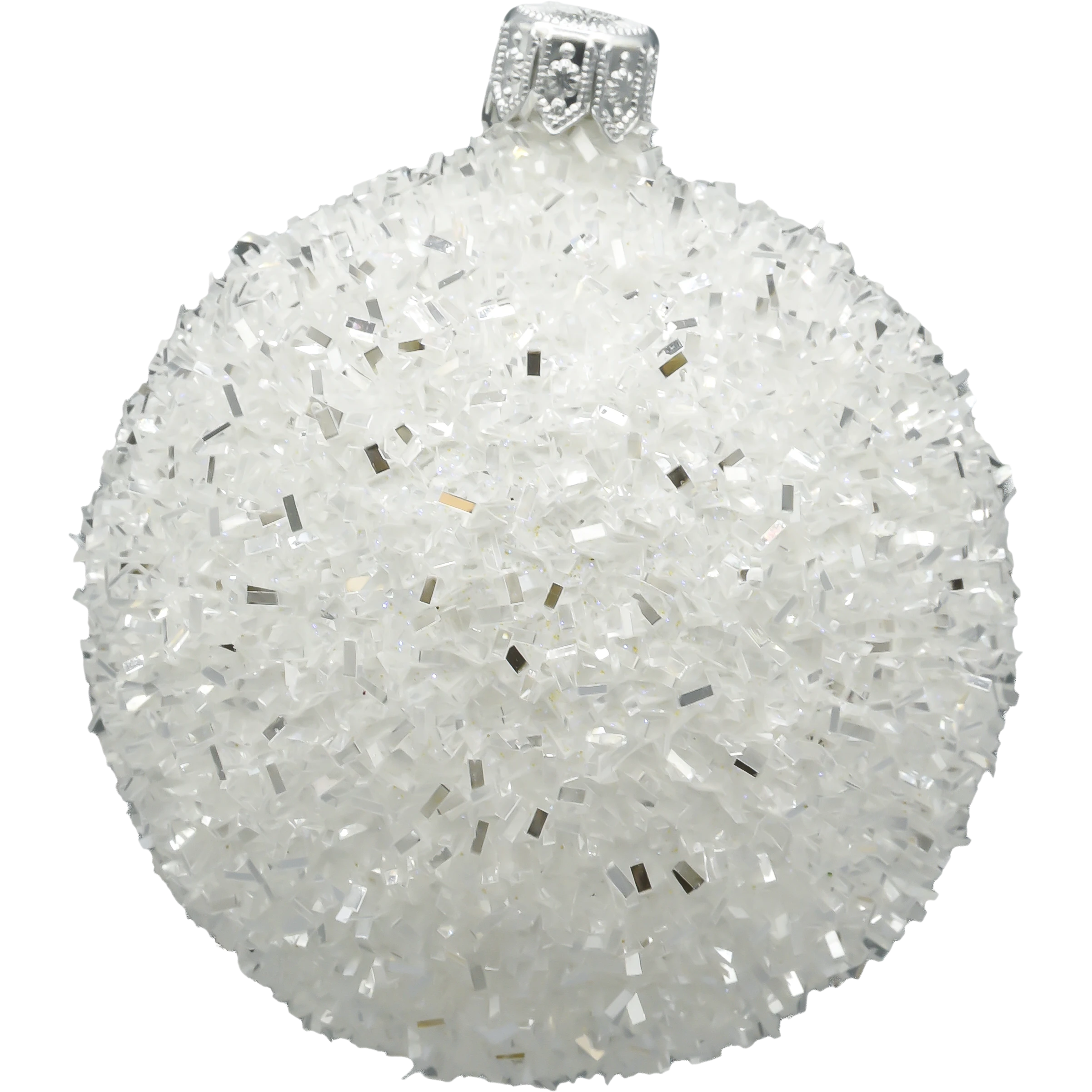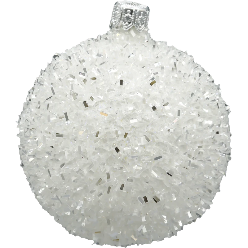 Dodaj swojej choince klasy i subtelnego blasku dzięki tej efektownej szklanej bombce choinkowej o średnicy 8 cm. Pokryta delikatną białą posypką z dodatkiem srebrnych, migoczących drobinek tworzy wyjątkowy efekt śnieżnej kuli, która pięknie rozprasza światło i przyciąga wzrok. To ponadczasowa dekoracja w zimowym stylu, idealna zarówno do klasycznych, jak i nowoczesnych aranżacji świątecznych.
