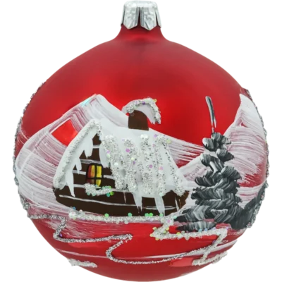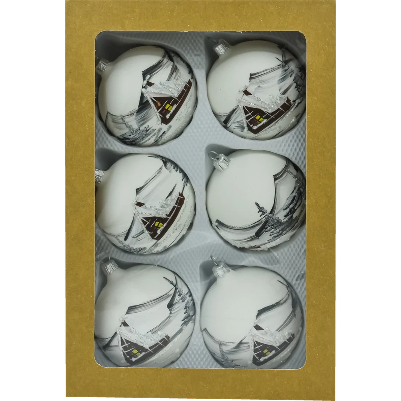 Elegancki komplet 6 szklanych bombek choinkowych o średnicy 8 cm w klasycznym, śnieżnobiałym (matowym) wykończeniu. Każda bombka jest dmuchana ze szkła i ręcznie malowana – dekor przedstawia przytulny zimowy domek z ośnieżonym dachem i choinkami, podkreślony srebrnym brokatem imitującym skrzący się śnieg. Matowa baza pięknie równoważy blask lampek i chromowanych ozdób, dzięki czemu dekor wygląda subtelnie i bardzo elegancko. Zestaw zapakowany w kraftowe pudełko z okienkiem – gotowy prezent i bezpieczne przechowywanie.