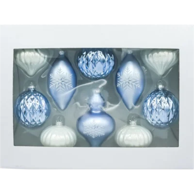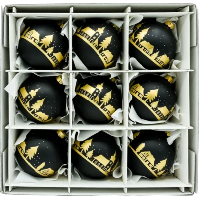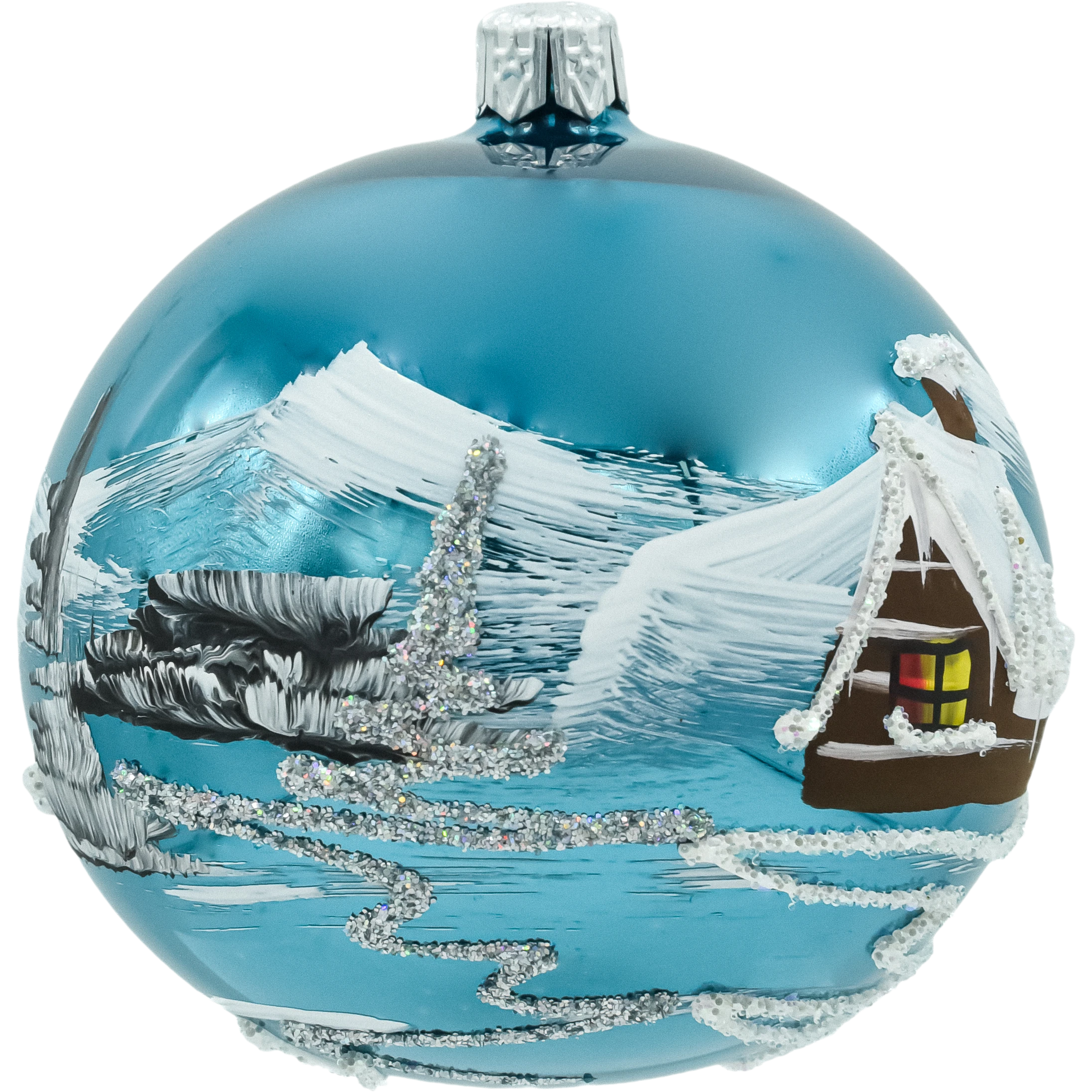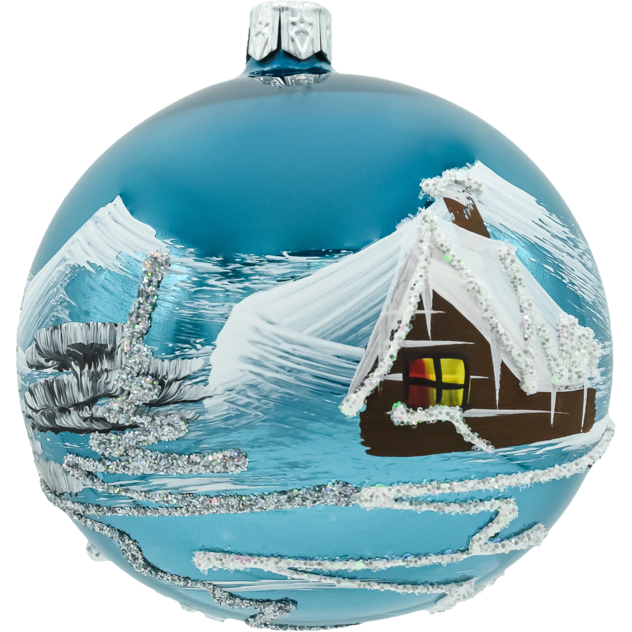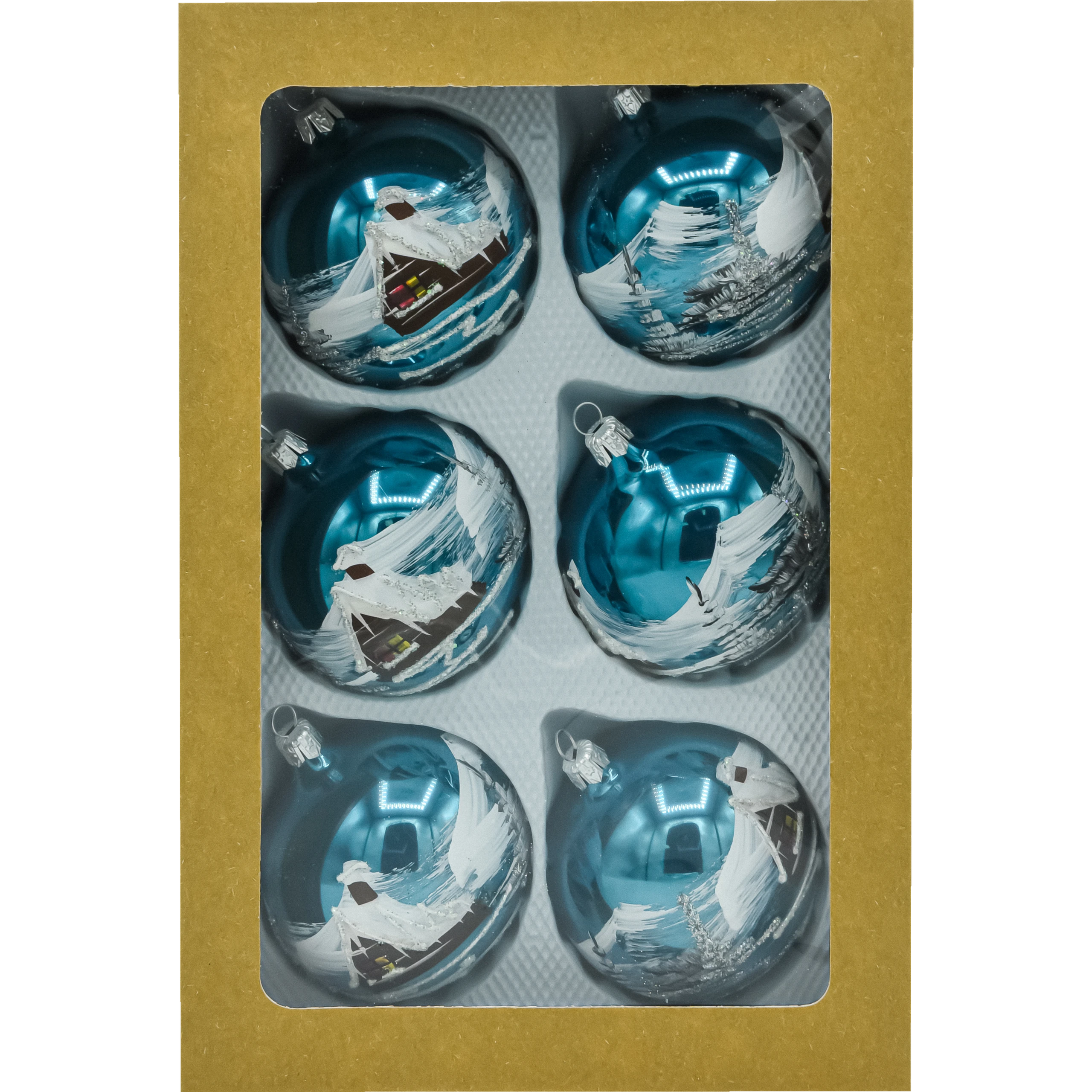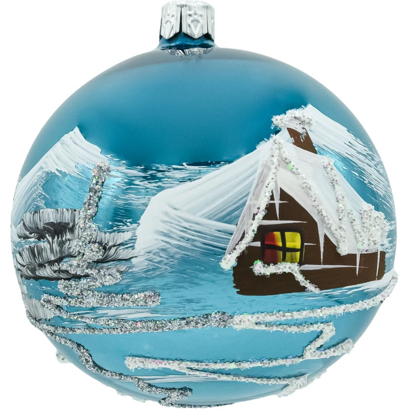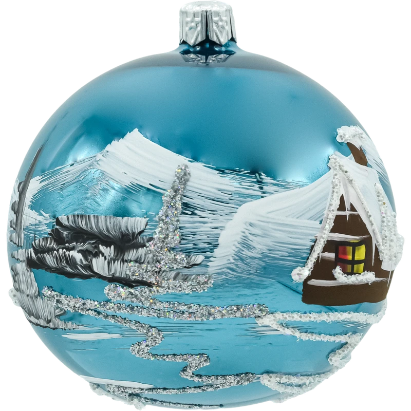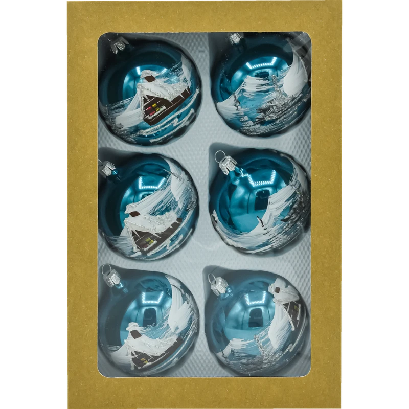 Elegancki komplet 6 szklanych bombek choinkowych 8 cm w kolorze głębokiego, połyskującego niebieskiego. Każda sztuka została dmuchana ze szkła i ręcznie malowana malarskim motywem zimowego domku z ośnieżonym dachem i choinkami. Błyszczące tło w odcieniu turkusowo-niebieskim intensywnie odbija światło lampek, a srebrny brokat podkreśla „iskrzący się śnieg”. Bombki są zapakowane w kraftowe pudełko z okienkiem – bezpieczne do przechowywania i gotowe na prezent. Idealny wybór dla osób szukających klasycznych, ręcznie wykonanych ozdób świątecznych w nowoczesnej, niebieskiej palecie.