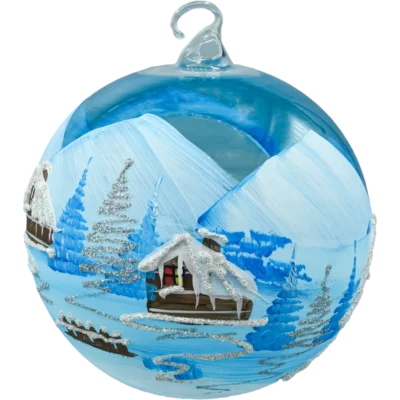• Ręcznie malowane bombki choinkowe – unikatowy, malowany pejzaż (chatka w górach, śnieg, drzewa), delikatnie połyskujący srebrnym brokatem.