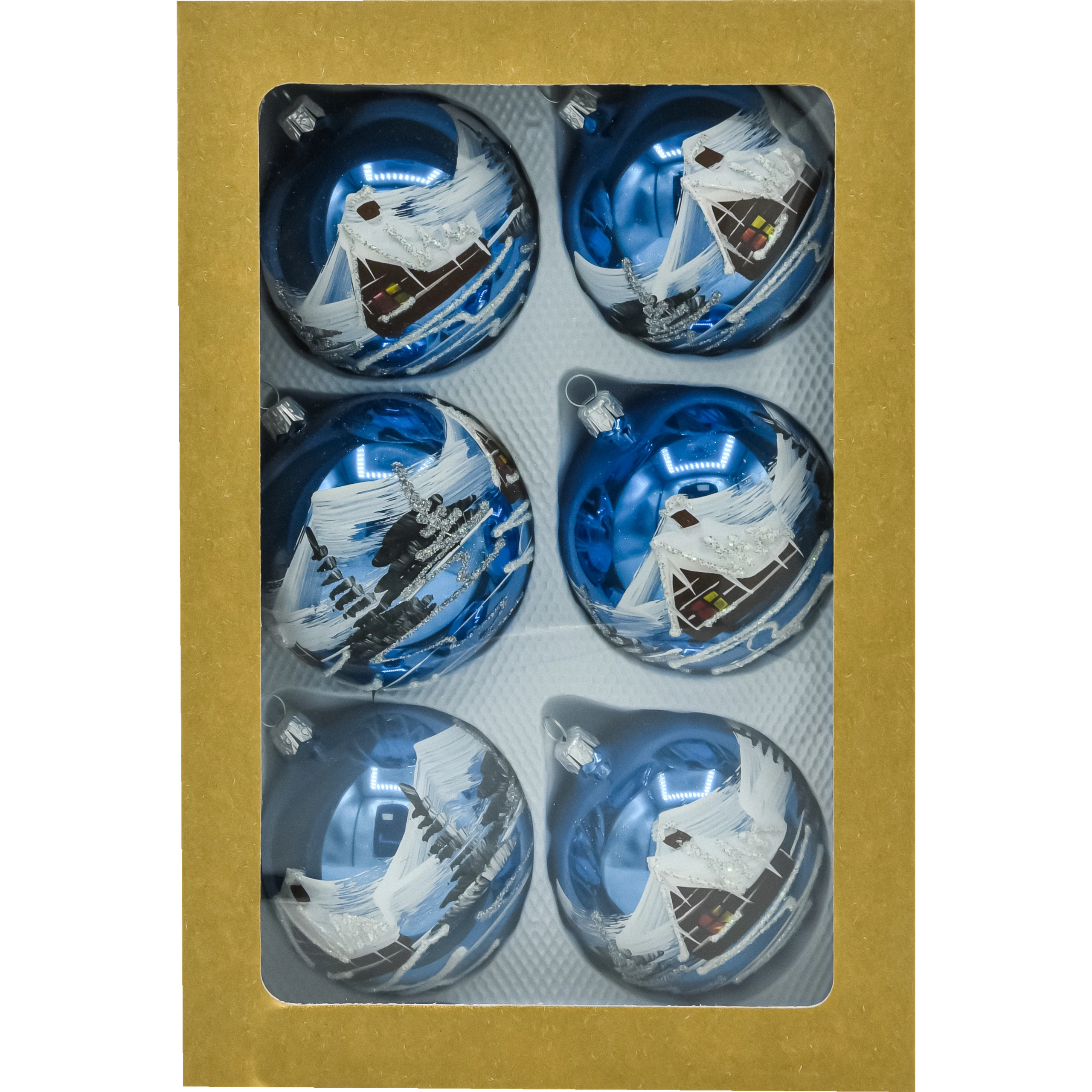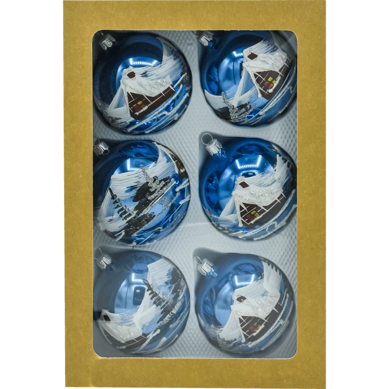 Zestaw 6 szklanych bombek choinkowych 10 cm w kolorze niebieskim, ręcznie malowanych w zimowy pejzaż z chatką i ośnieżonymi drzewami. Dmuchane szkło, srebrny brokat, metalowe czapeczki, eleganckie pudełko prezentowe. Idealne ozdoby na choinkę, do stroików i na prezent świąteczny. Polska produkcja, unikatowe rękodzieło.