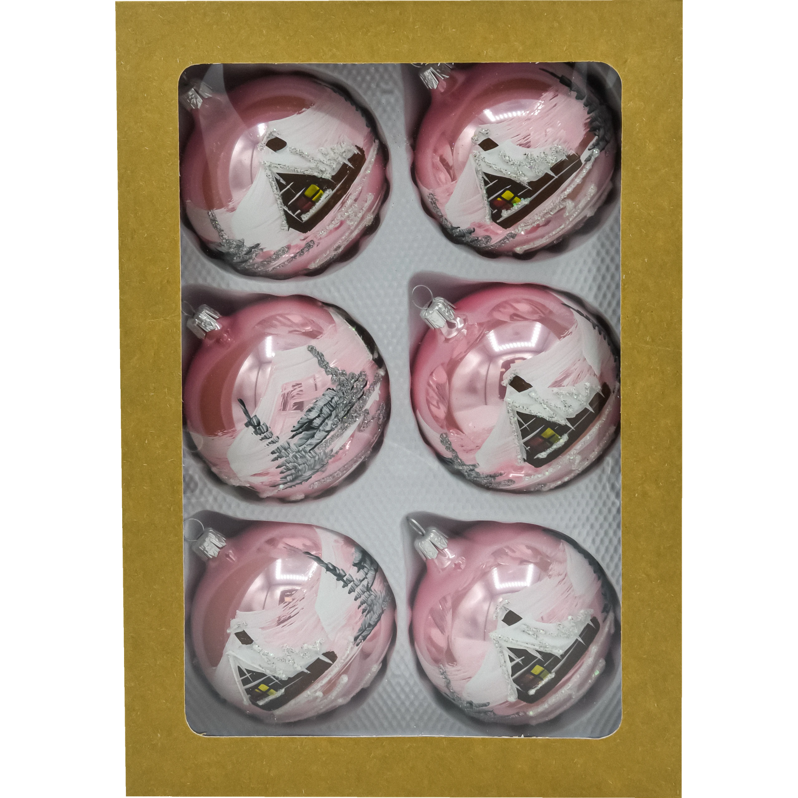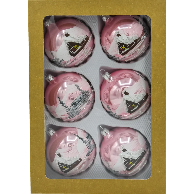 Bombki choinkowe szklane 8 cm – komplet 6 sztuk, róż z zimowym pejzażem