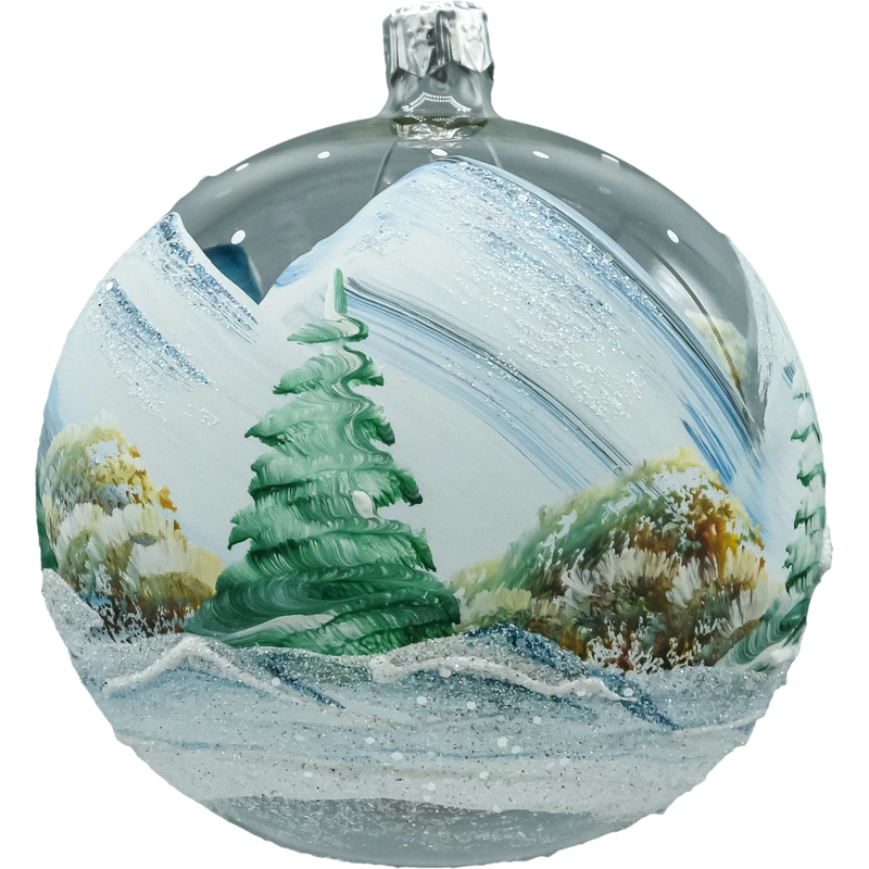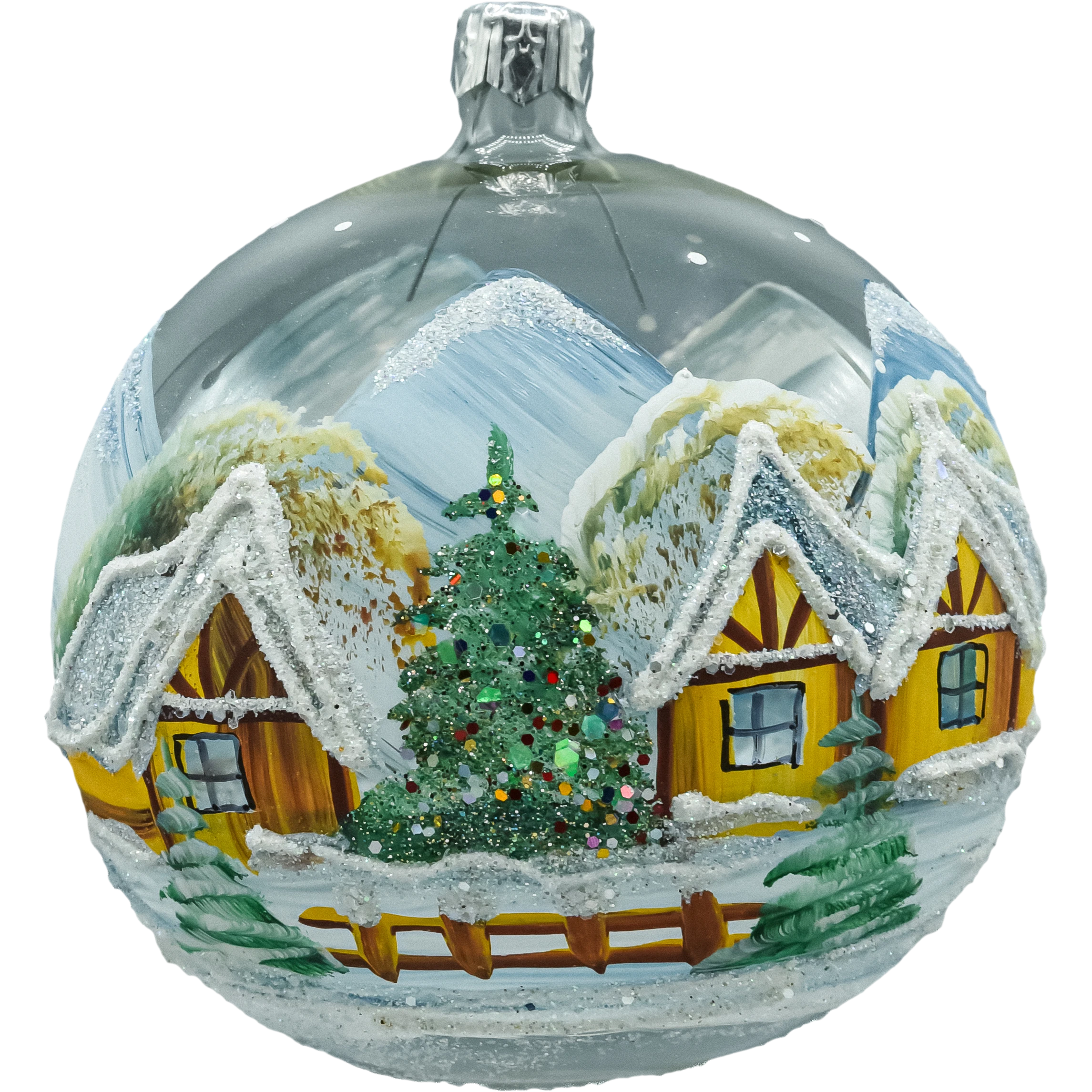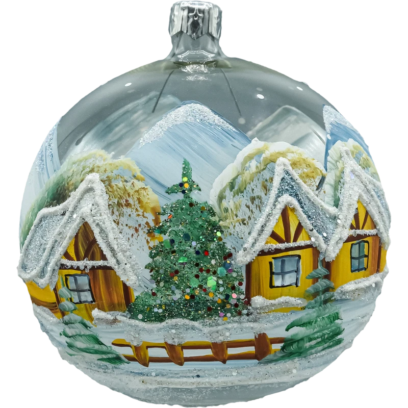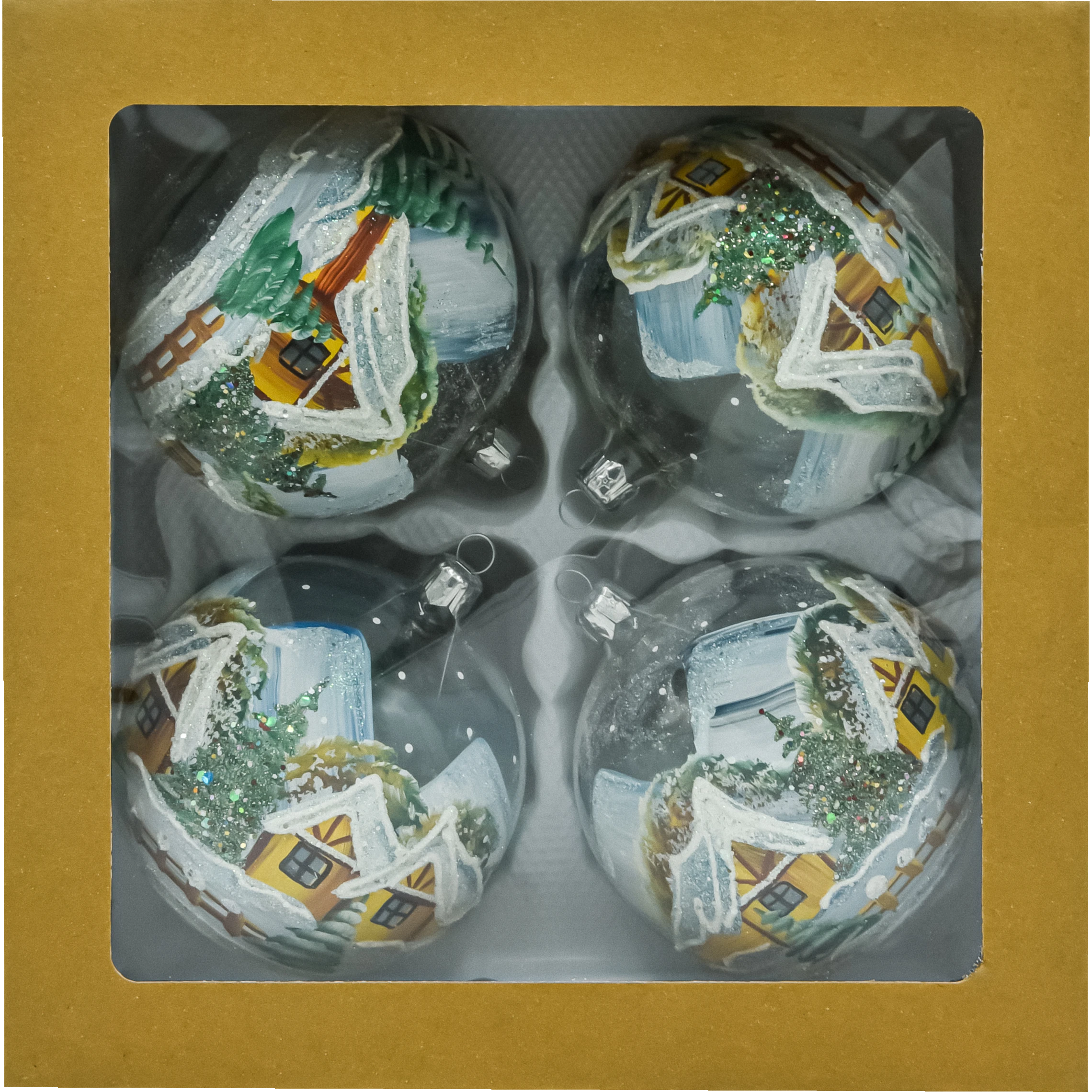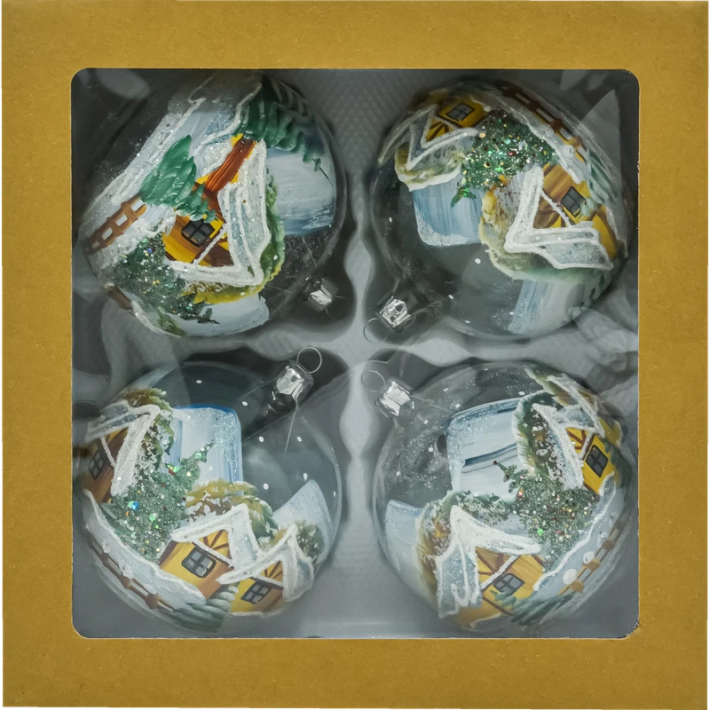 Ręcznie malowane bombki szklane 10 cm „Zimowy domek” – zestaw 4 sztuki. Satynowe szampańskie wykończenie, śnieżny pejzaż ze srebrzystym brokatem, metalowa zawieszka i eleganckie pudełko prezentowe. Idealne bombki choinkowe do aranżacji w stylu klasycznym, glamour i scandi – piękny prezent świąteczny i ponadczasowa ozdoba na wiele sezonów.