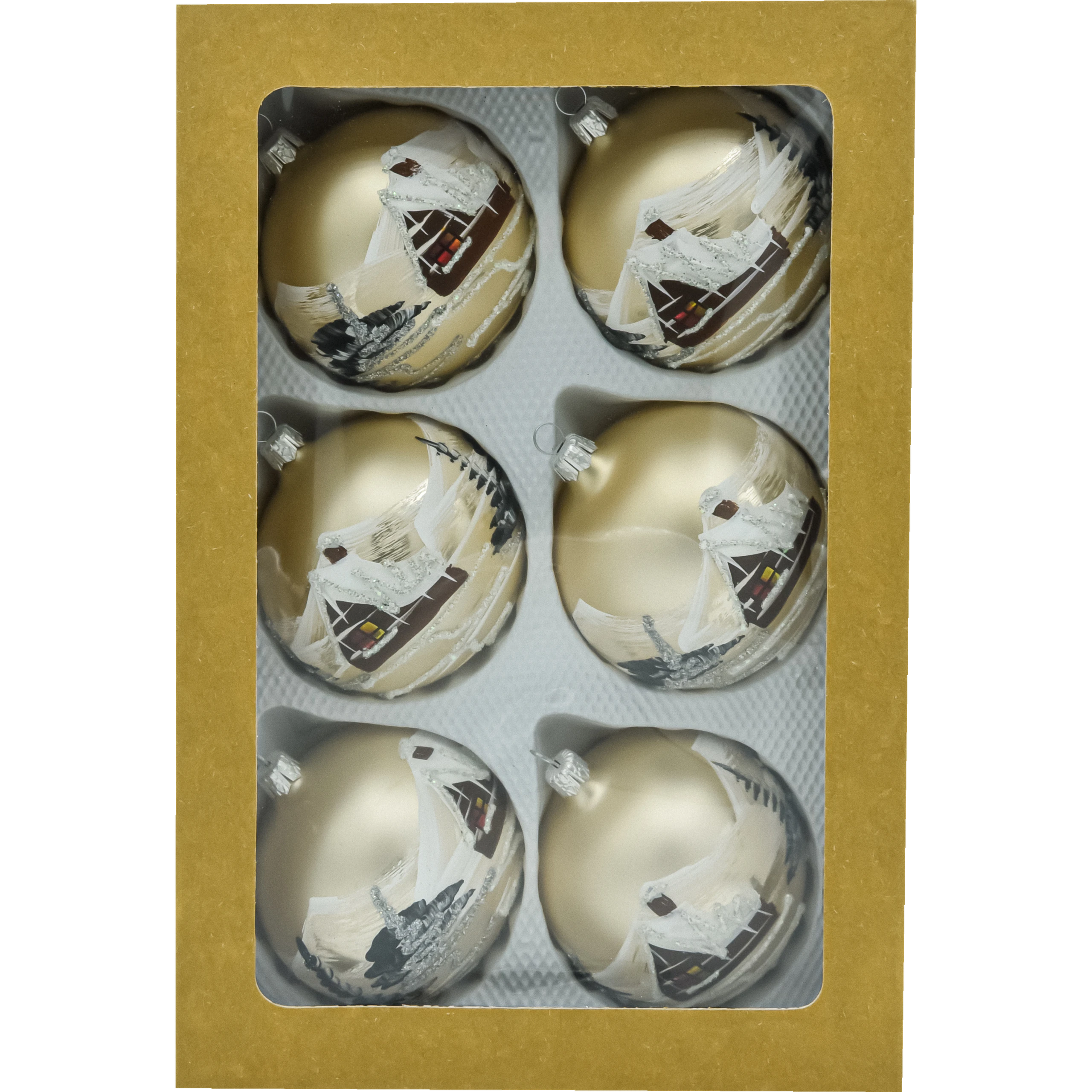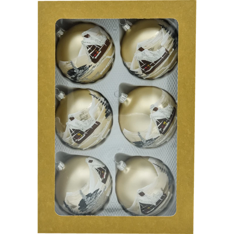 Zestaw 6 szklanych bombek 8 cm w kolorze złotym (szampańskim), ręcznie malowanych motywem zimowego domku z brokatowym śniegiem. Eleganckie pudełko kraft z okienkiem. Idealne ozdoby świąteczne na choinkę, stroiki i prezent. Klasa premium, tradycyjne rzemiosło.